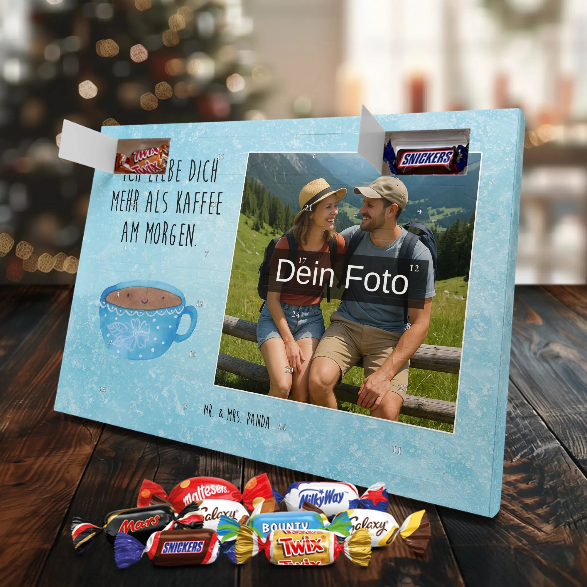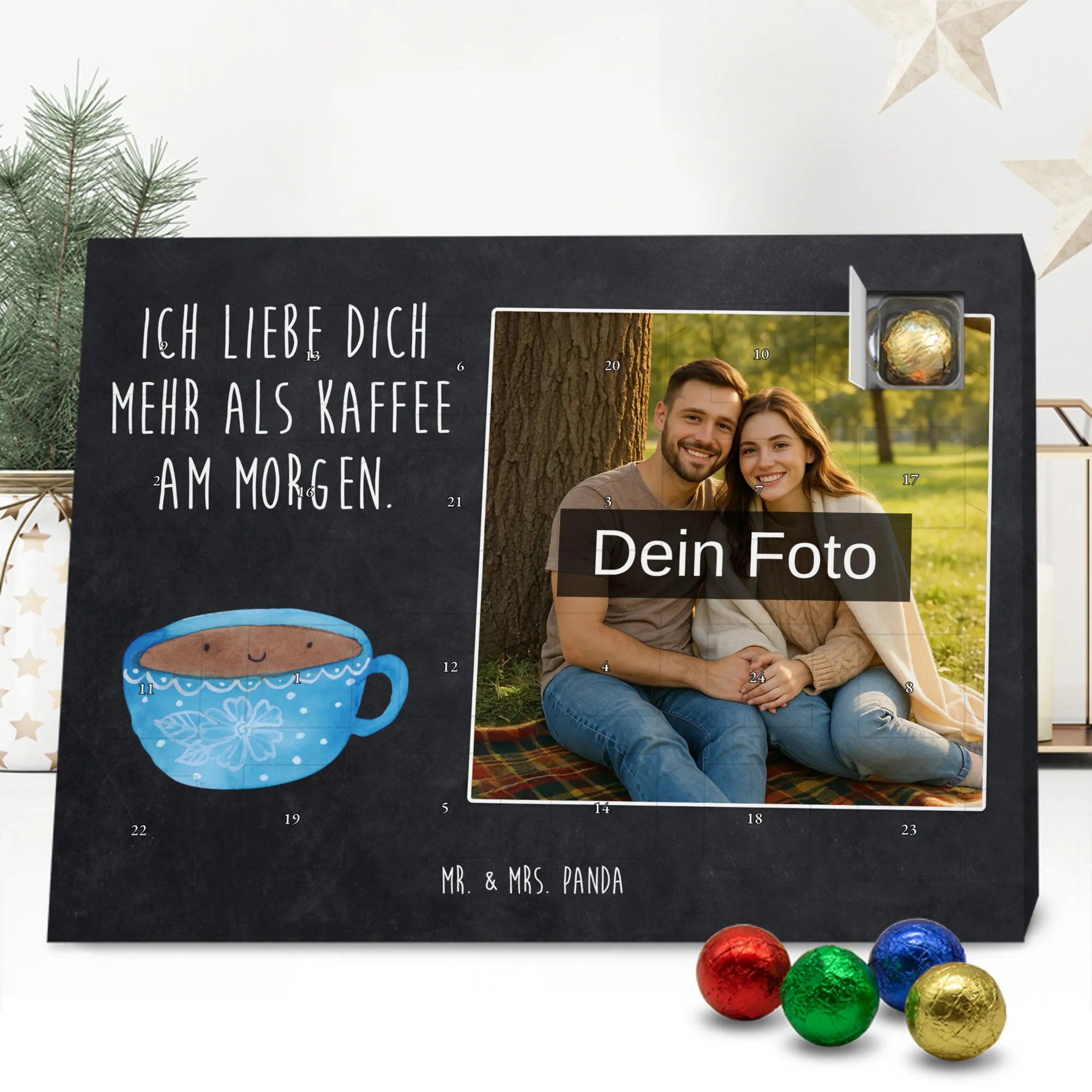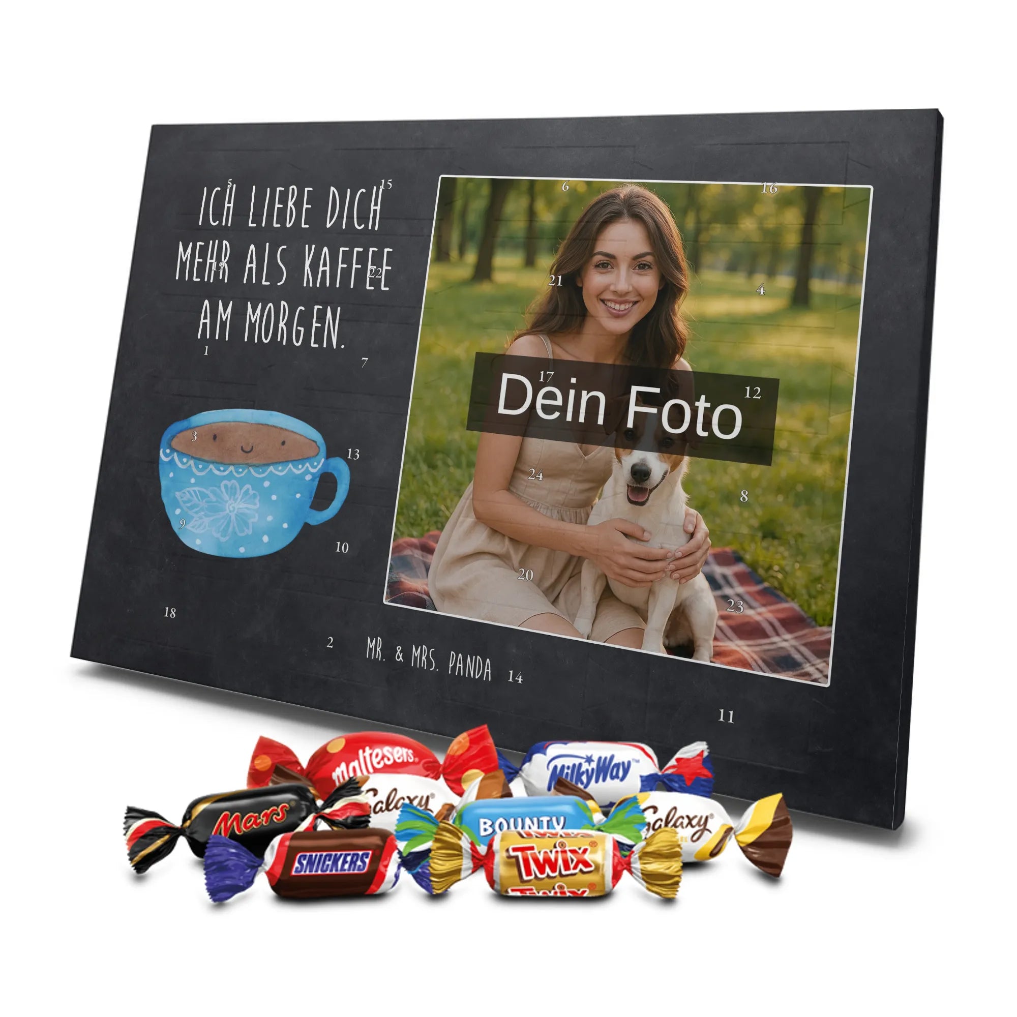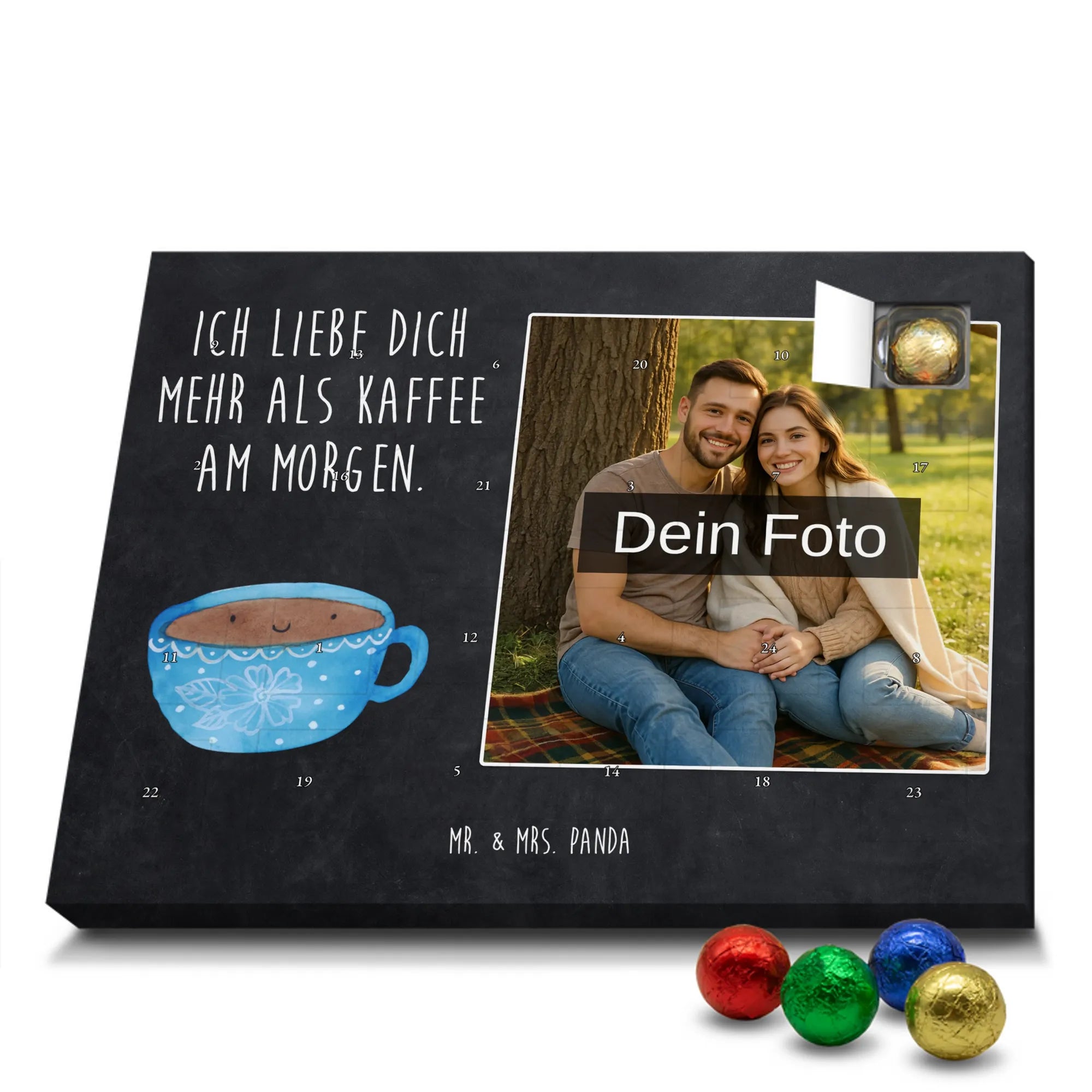 Verschenke Freude, Liebe und süßen Genuss: Unser personalisierbarer Adventskalender kombiniert dein Lieblingsfoto mit dem fröhlichen Tassen-Motiv von Mr. & Mrs. Panda. Die süße Kaffeetasse strahlt mit dem liebevollen Slogan „Ich liebe dich mehr als Kaffee am Morgen.“ und macht jeden Dezembermorgen zu einem besonderen Moment.