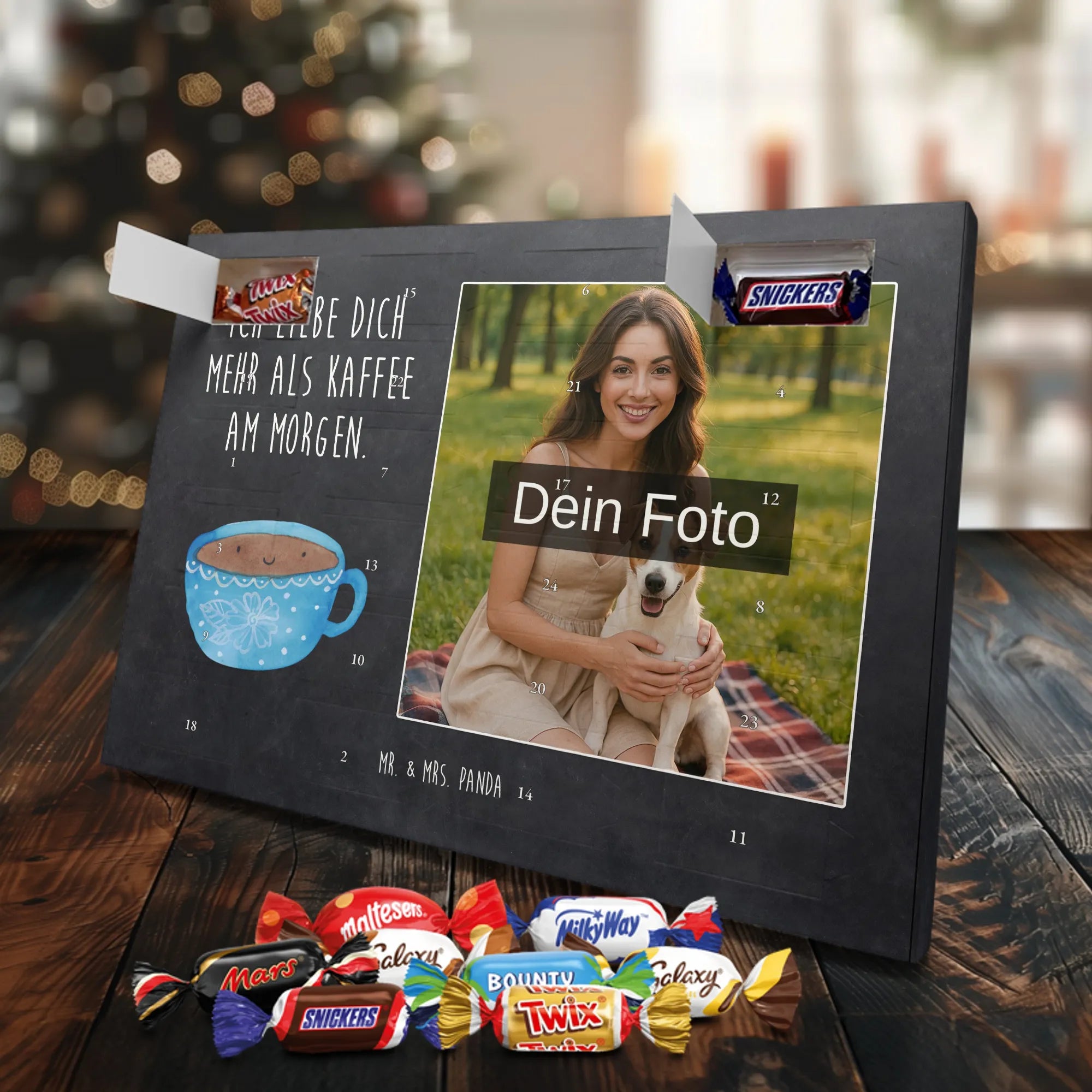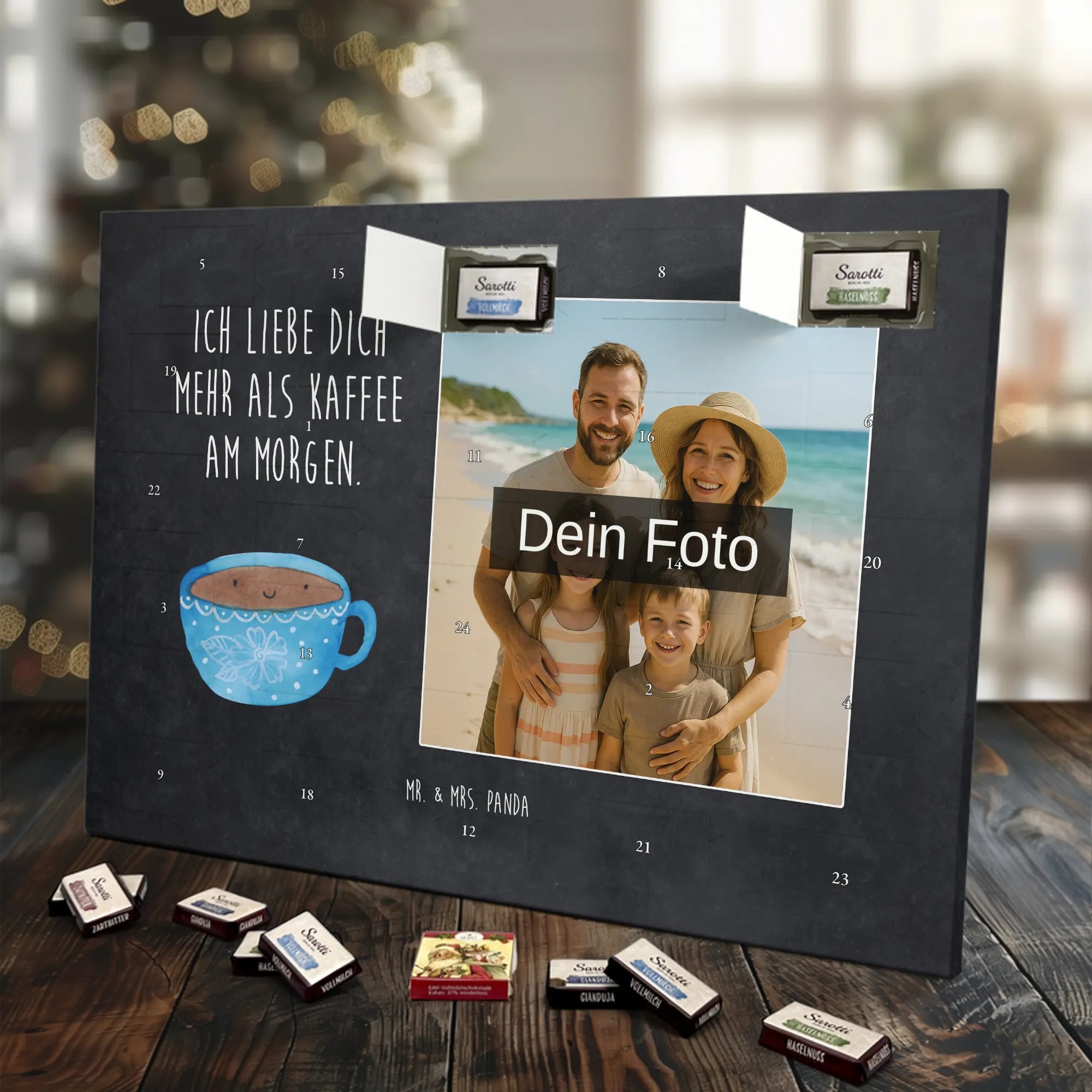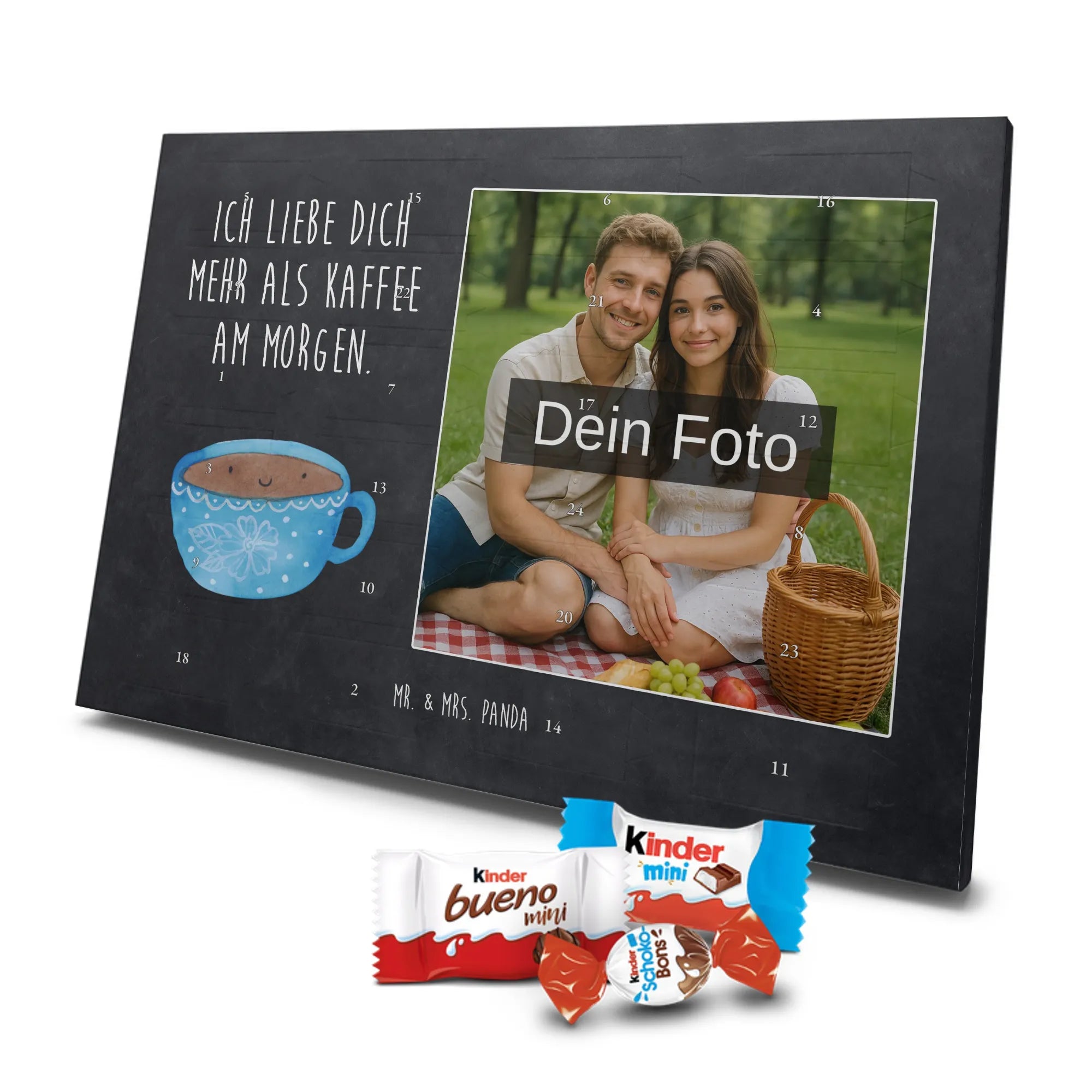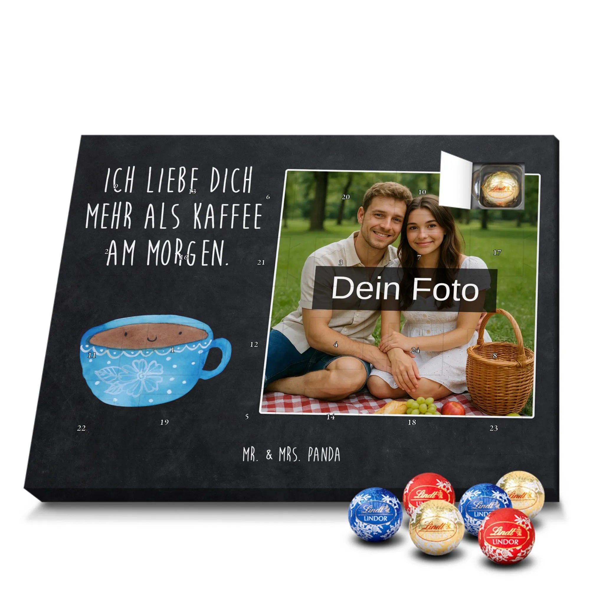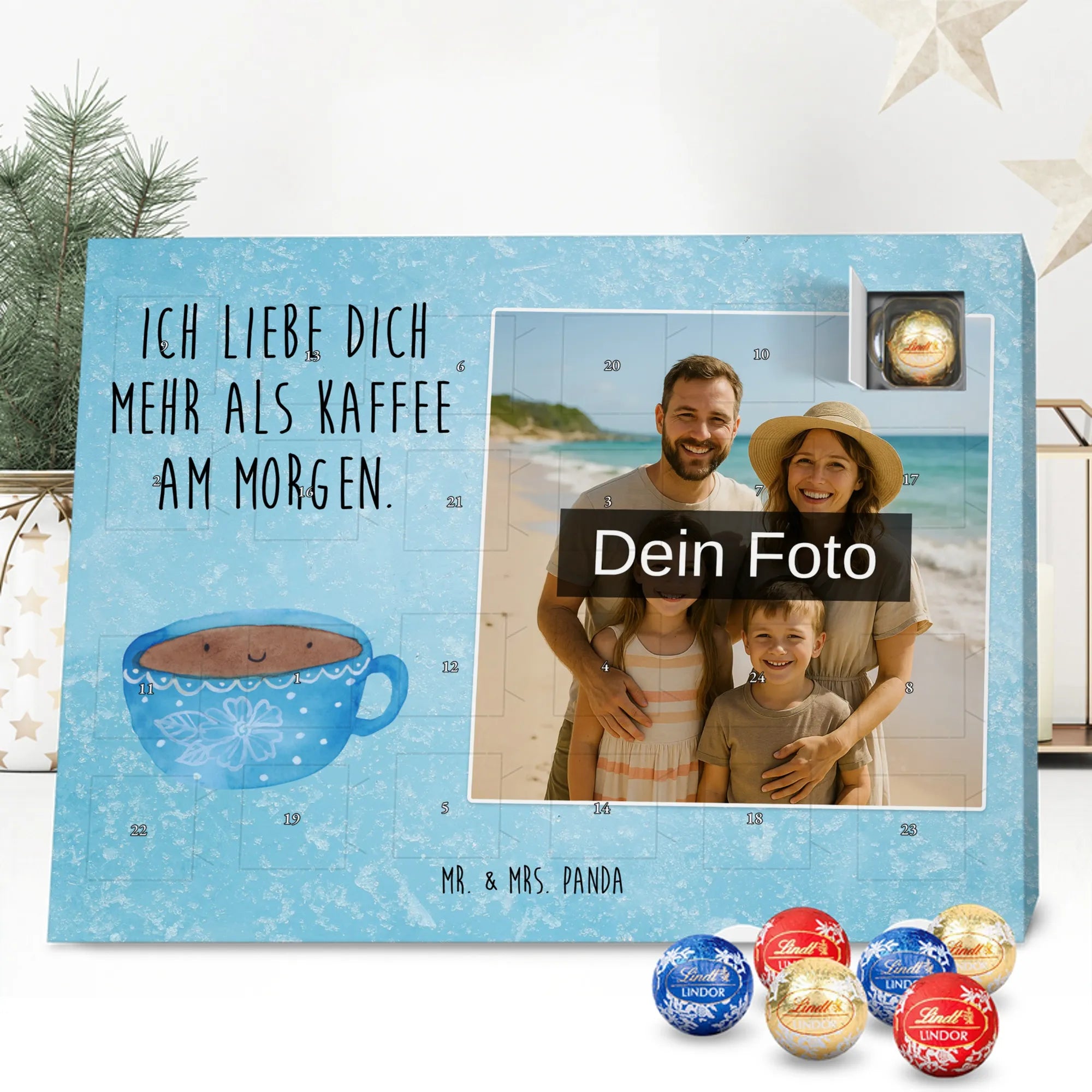 Verschenke Freude, Liebe und süßen Genuss: Unser personalisierbarer Adventskalender kombiniert dein Lieblingsfoto mit dem fröhlichen Tassen-Motiv von Mr. & Mrs. Panda. Die süße Kaffeetasse strahlt mit dem liebevollen Slogan „Ich liebe dich mehr als Kaffee am Morgen.“ und macht jeden Dezembermorgen zu einem besonderen Moment.