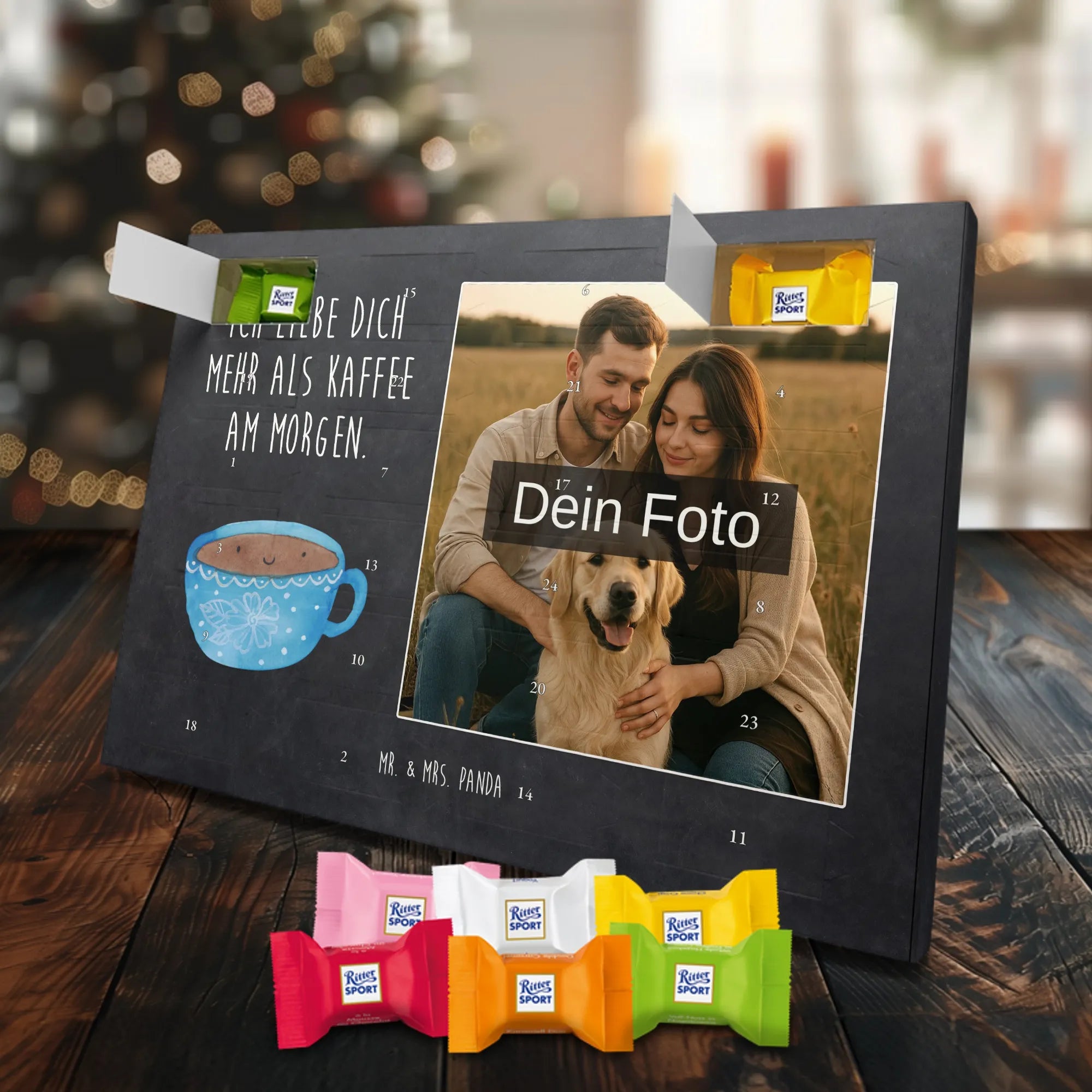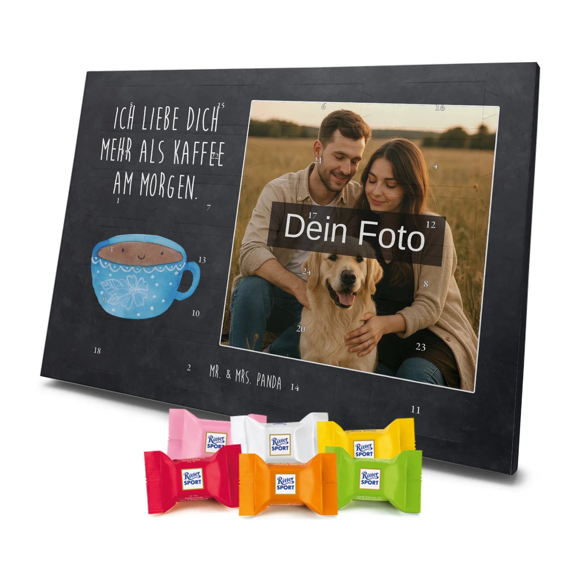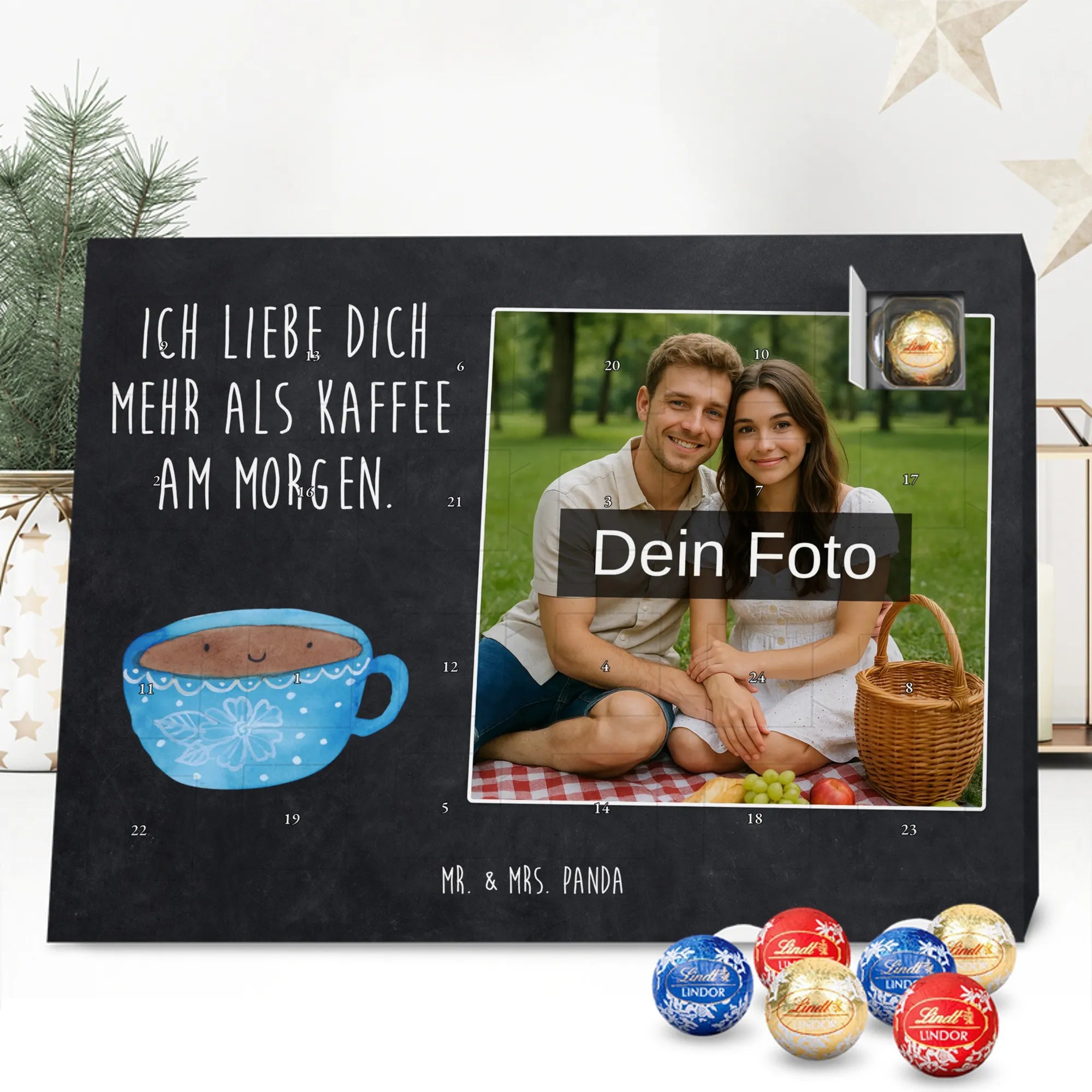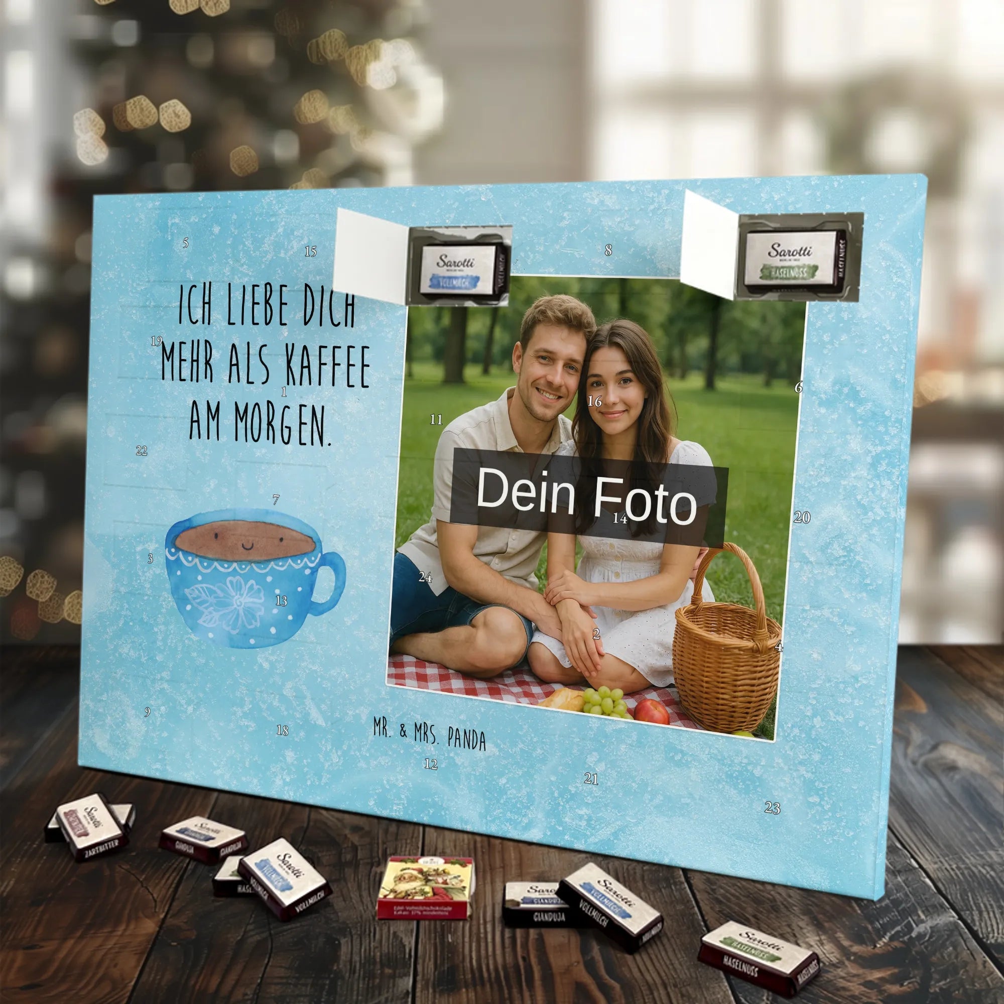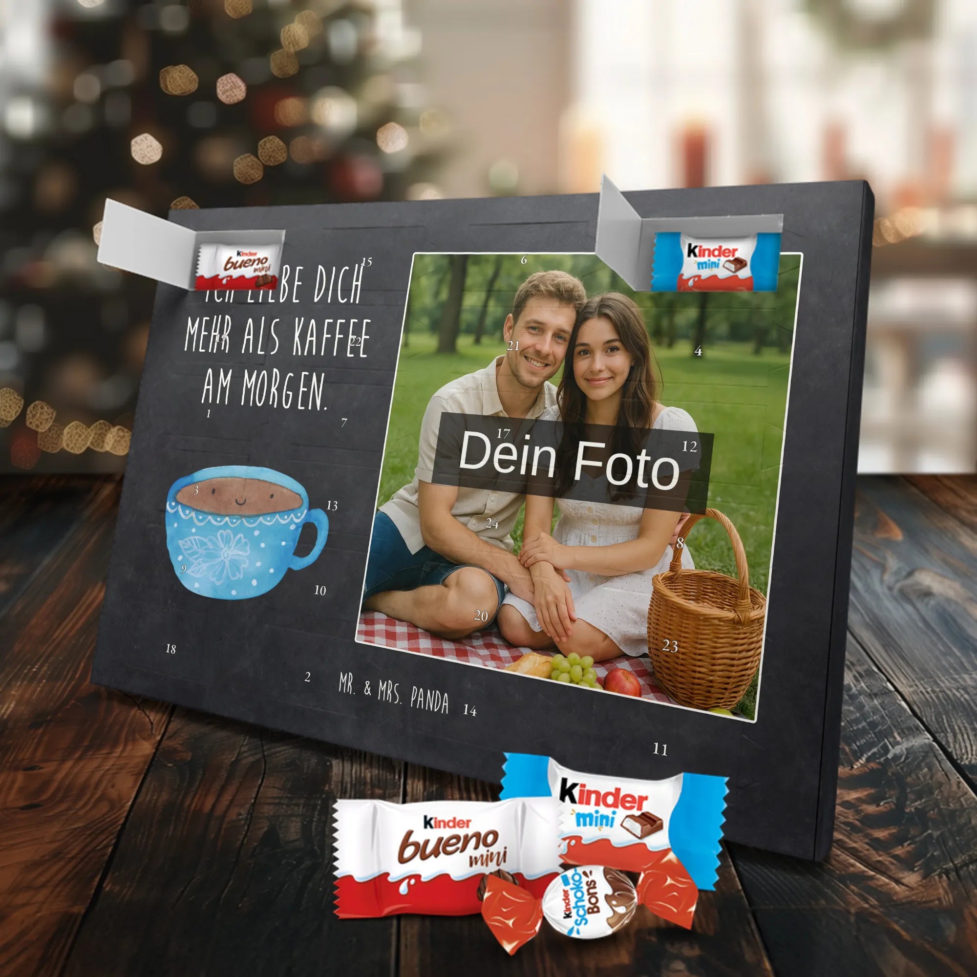Verschenke Freude, Liebe und süßen Genuss: Unser personalisierbarer Adventskalender kombiniert dein Lieblingsfoto mit dem fröhlichen Tassen-Motiv von Mr. & Mrs. Panda. Die süße Kaffeetasse strahlt mit dem liebevollen Slogan „Ich liebe dich mehr als Kaffee am Morgen.“ und macht jeden Dezembermorgen zu einem besonderen Moment.