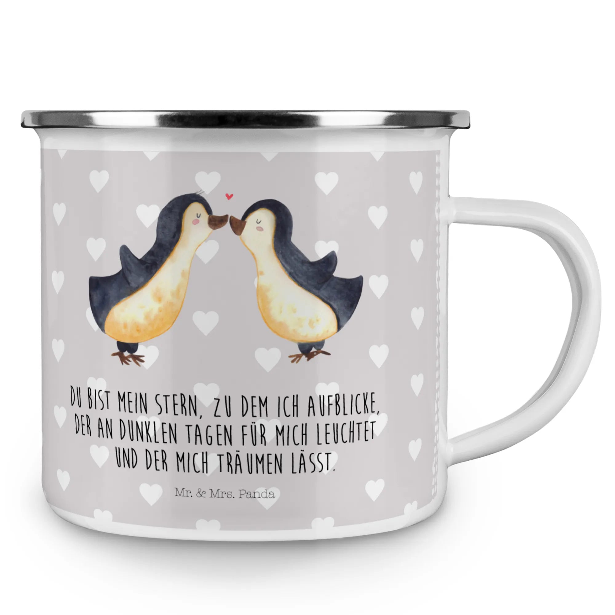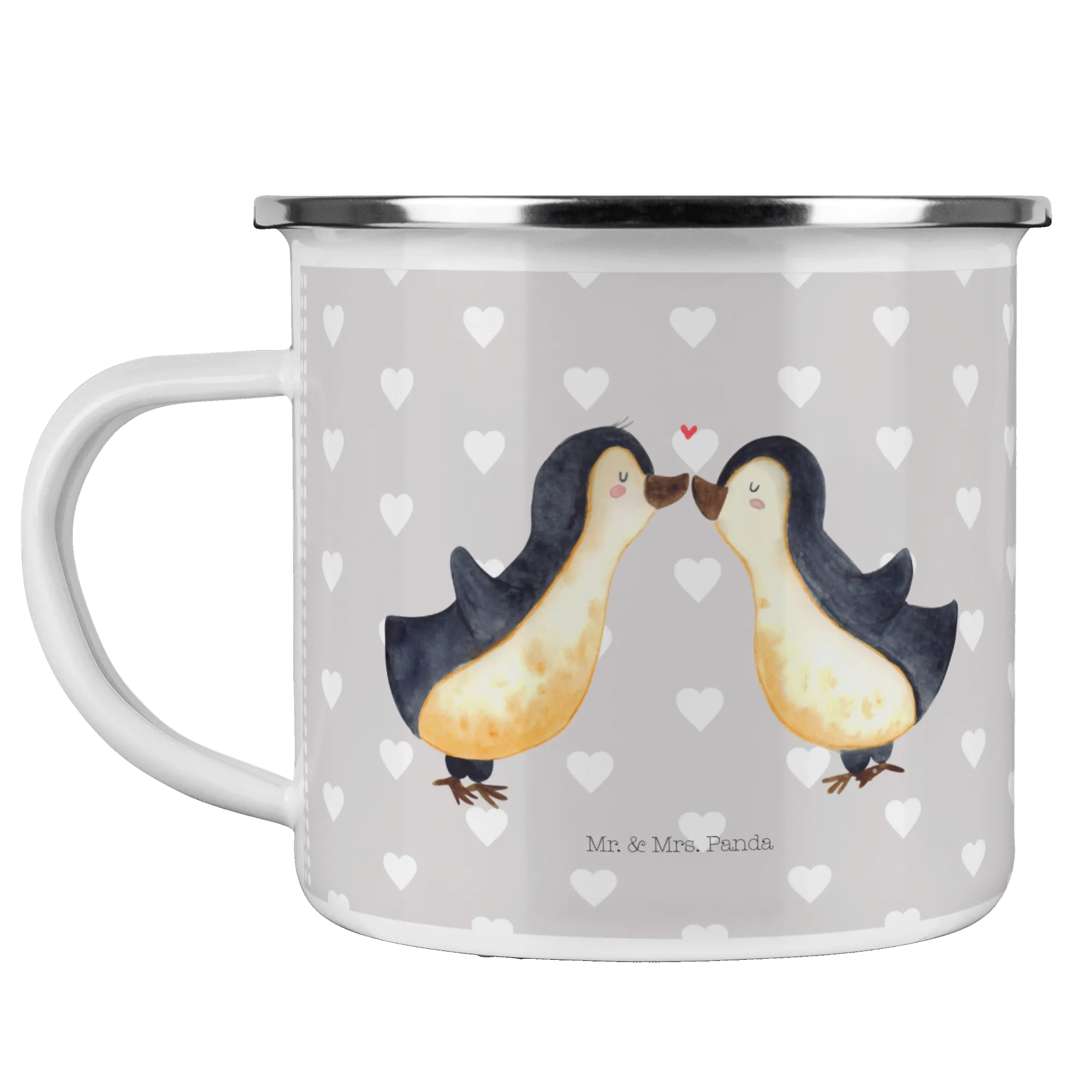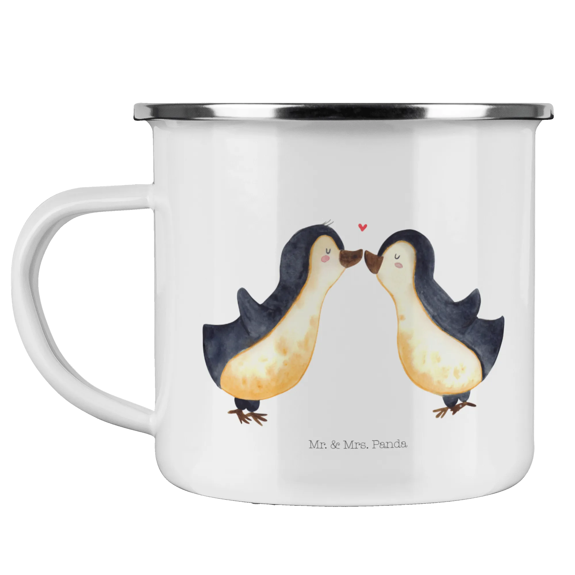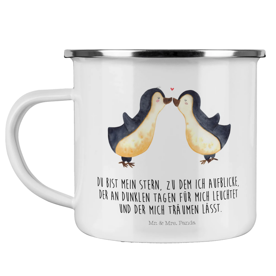 Kempingowy kubek emaliowany Pingwin Miłość - z napisem - biały