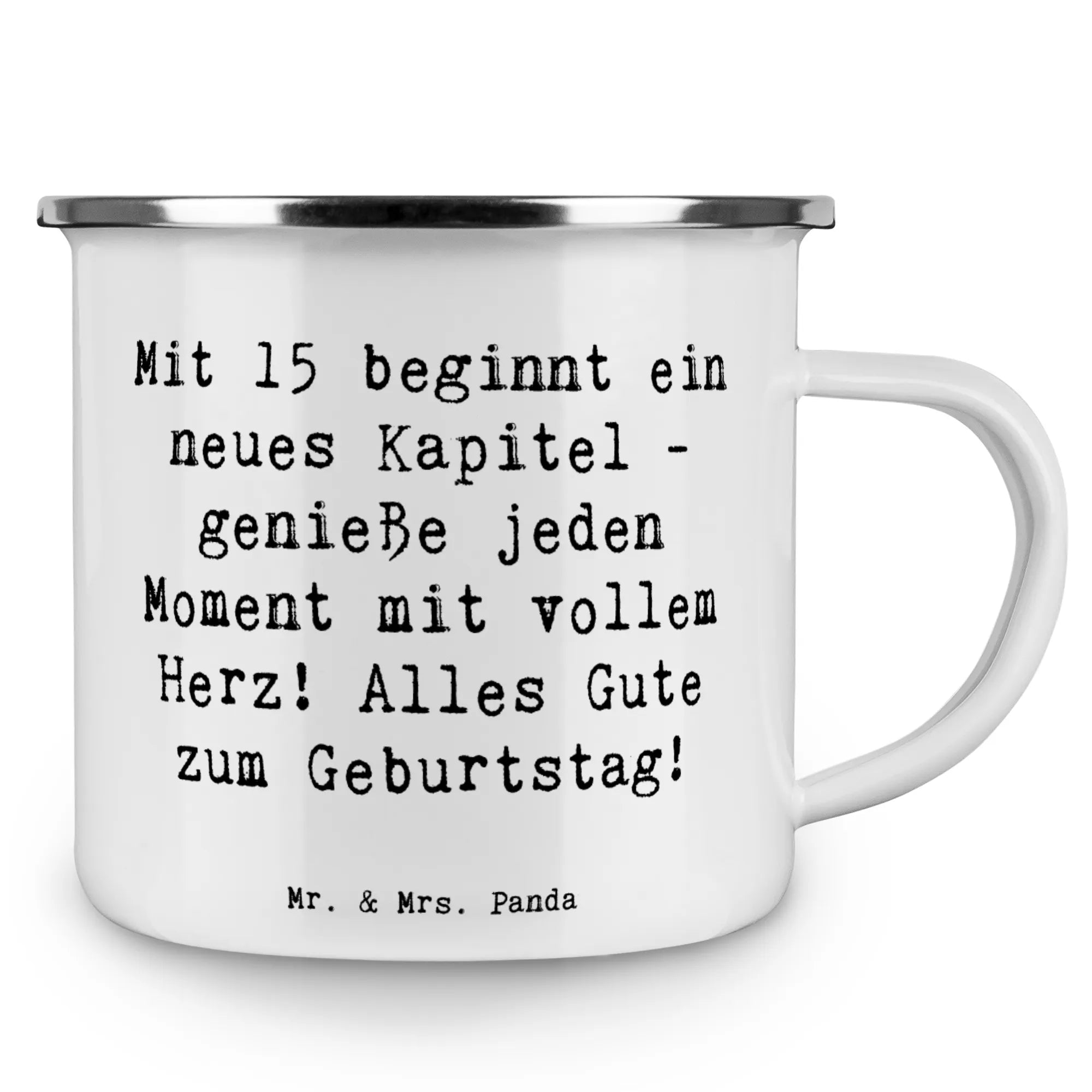Kempingowy kubek emaliowany Przysłowie Mit 15 beginnt ein neues Kapitel - genieße jeden Moment mit vollem Herz! Alles Gute zum Geburtstag!