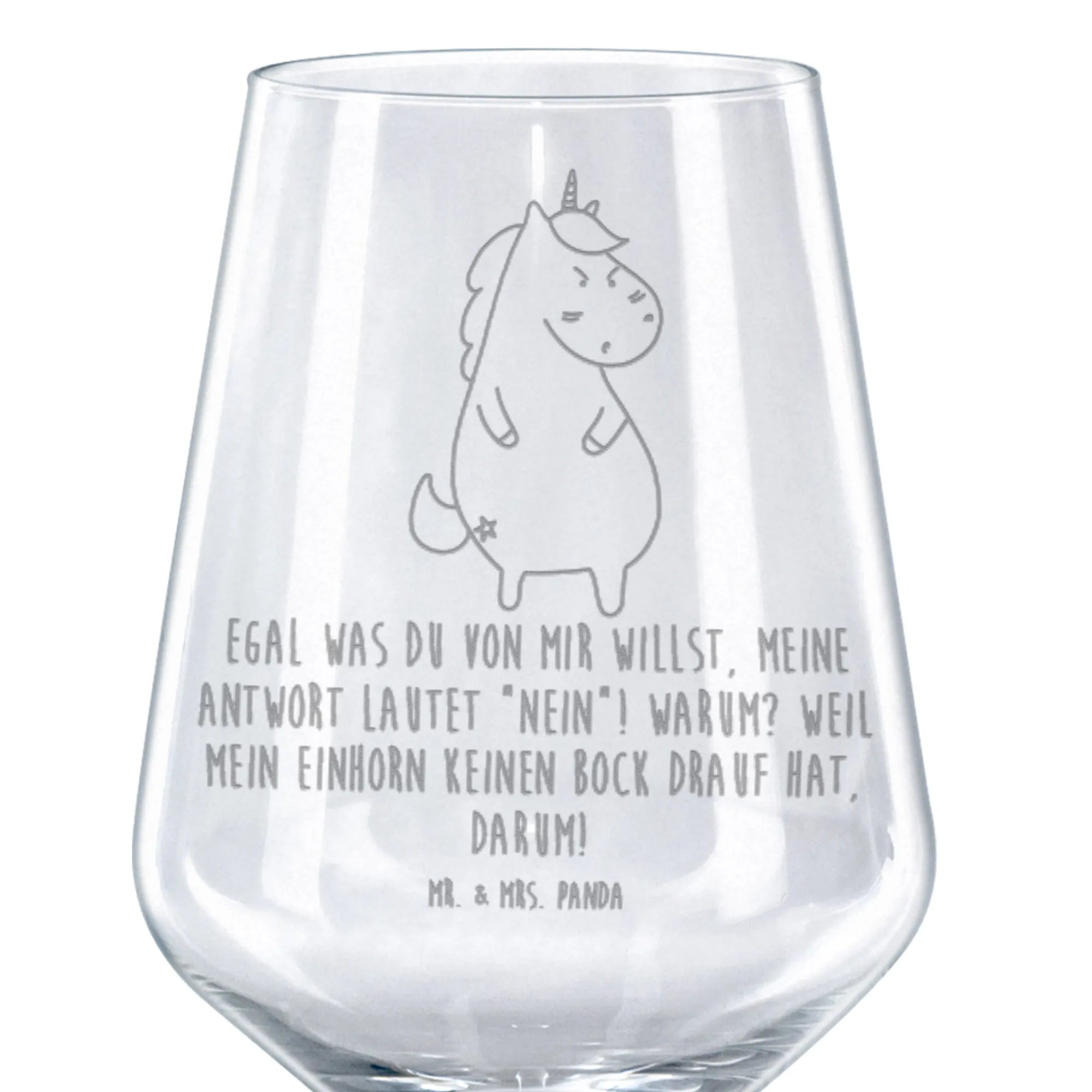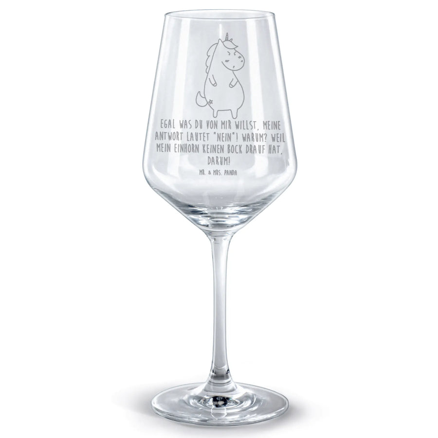 Dieses hochwertige Rotweinglas ist nicht nur ein Blickfang, sondern bietet auch eine einzigartige Botschaft: 'Egal was du von mir willst, meine Antwort lautet: Nein! Warum? Weil mein Einhorn keinen Bock drauf hat!'