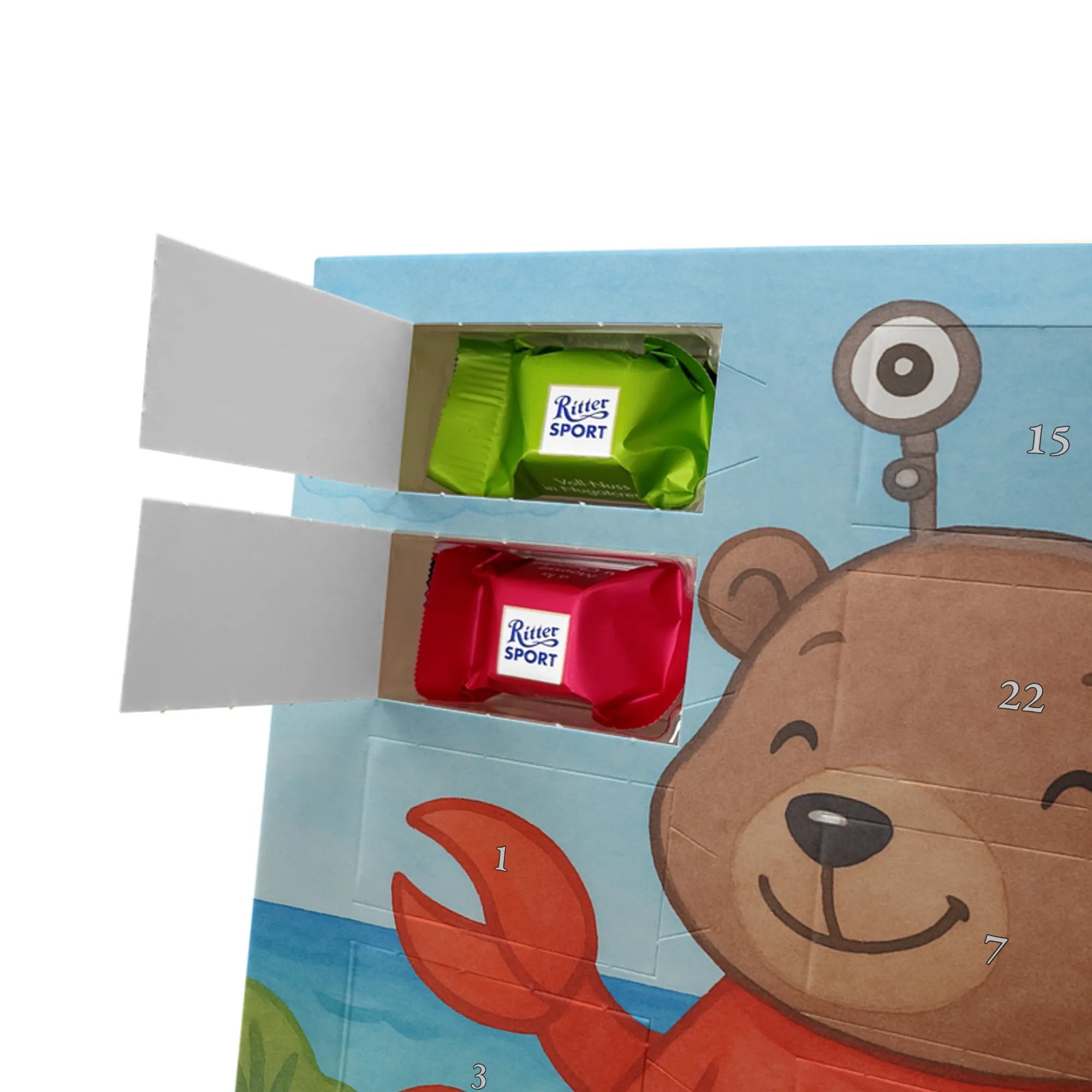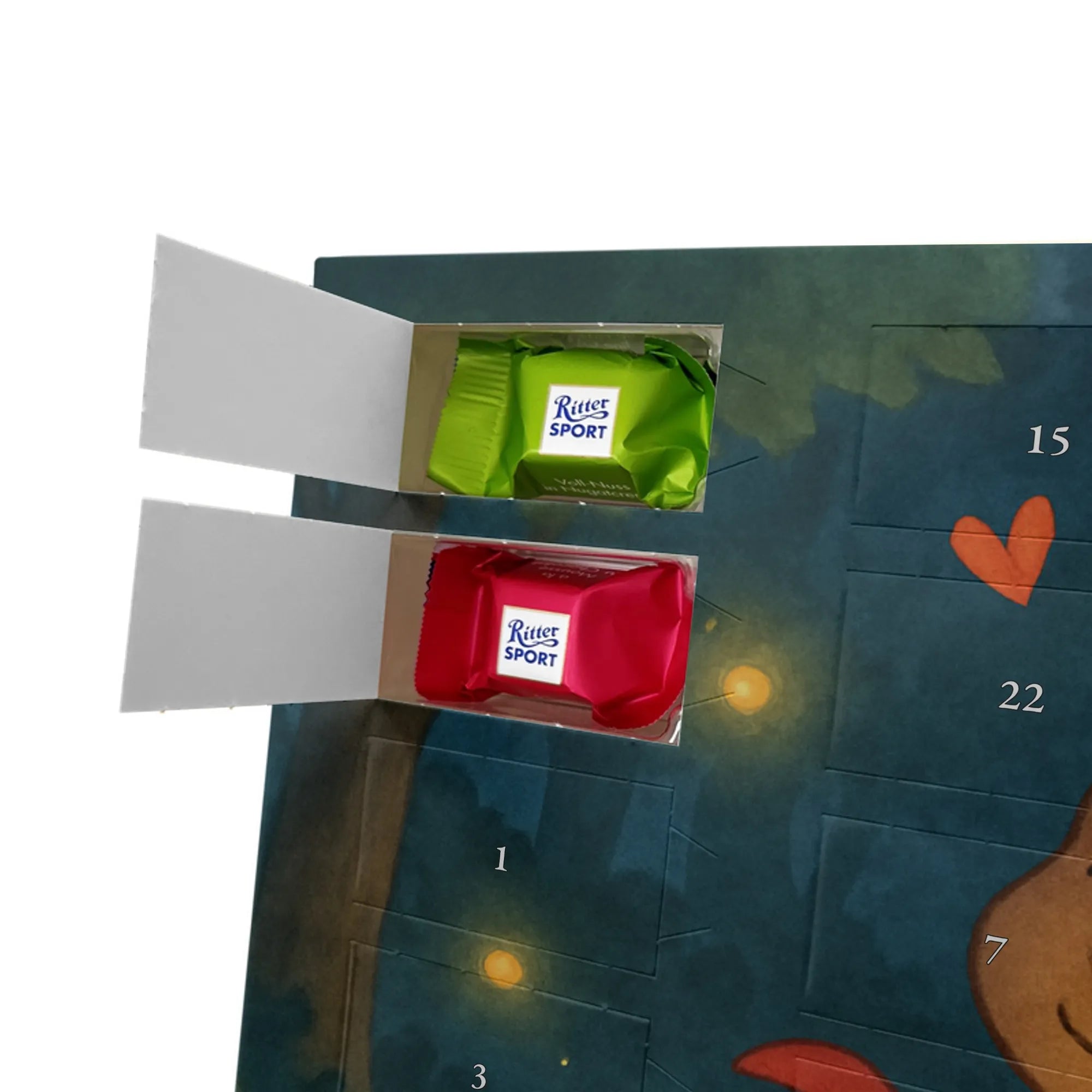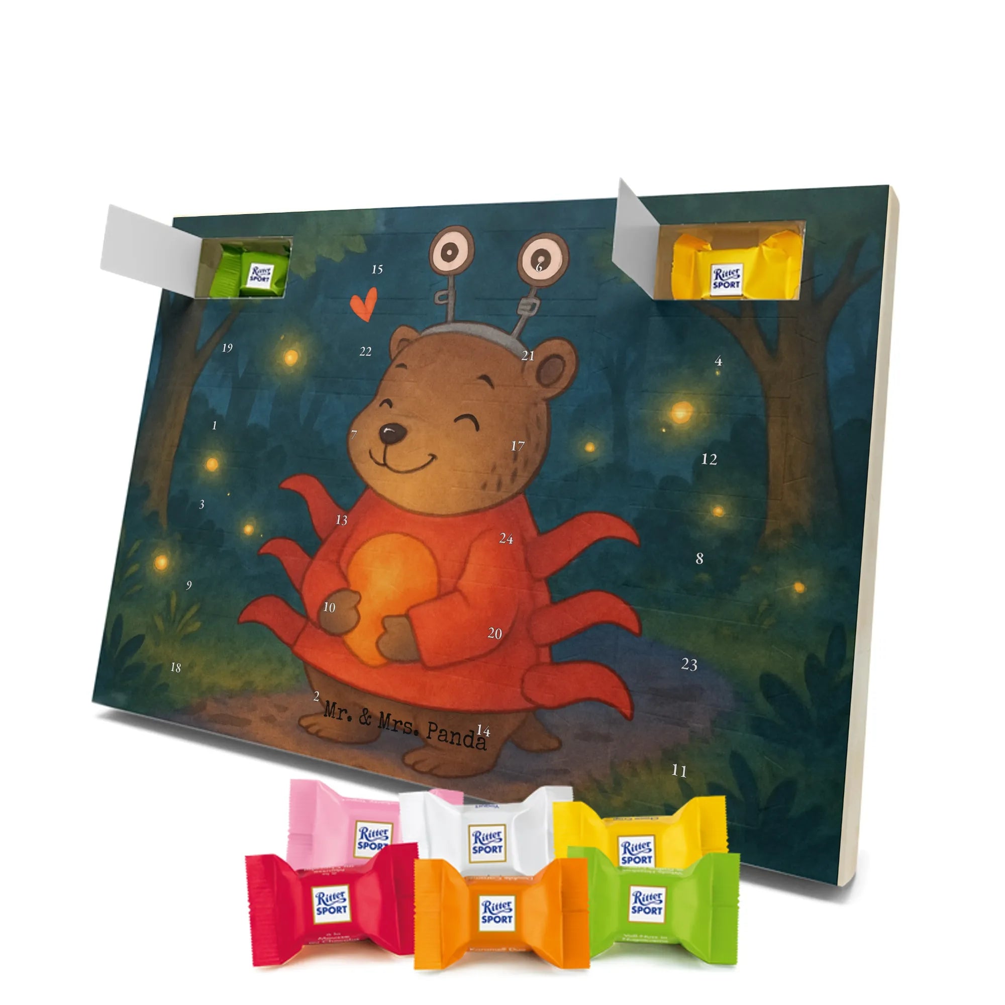 Stell Dir vor, wie jeden Adventstag ein kleines Türchen geöffnet wird und darunter ein köstlicher Ritter Sport Schokowürfel wartet. Unser Adventskalender mit Schokolade vereint liebevolle Illustration und feinen Genuss: Ein handgezeichnetes Motiv zeigt einen niedlichen Bären im roten Krebskostüm, der ein orangefarbenes Herz hält. Der sorgsam gesetzte Spruch „Krebs: Sanft wie der Mond, tief wie das Meer.“ macht diesen Weihnachtskalender Schokolade besonders persönlich.
