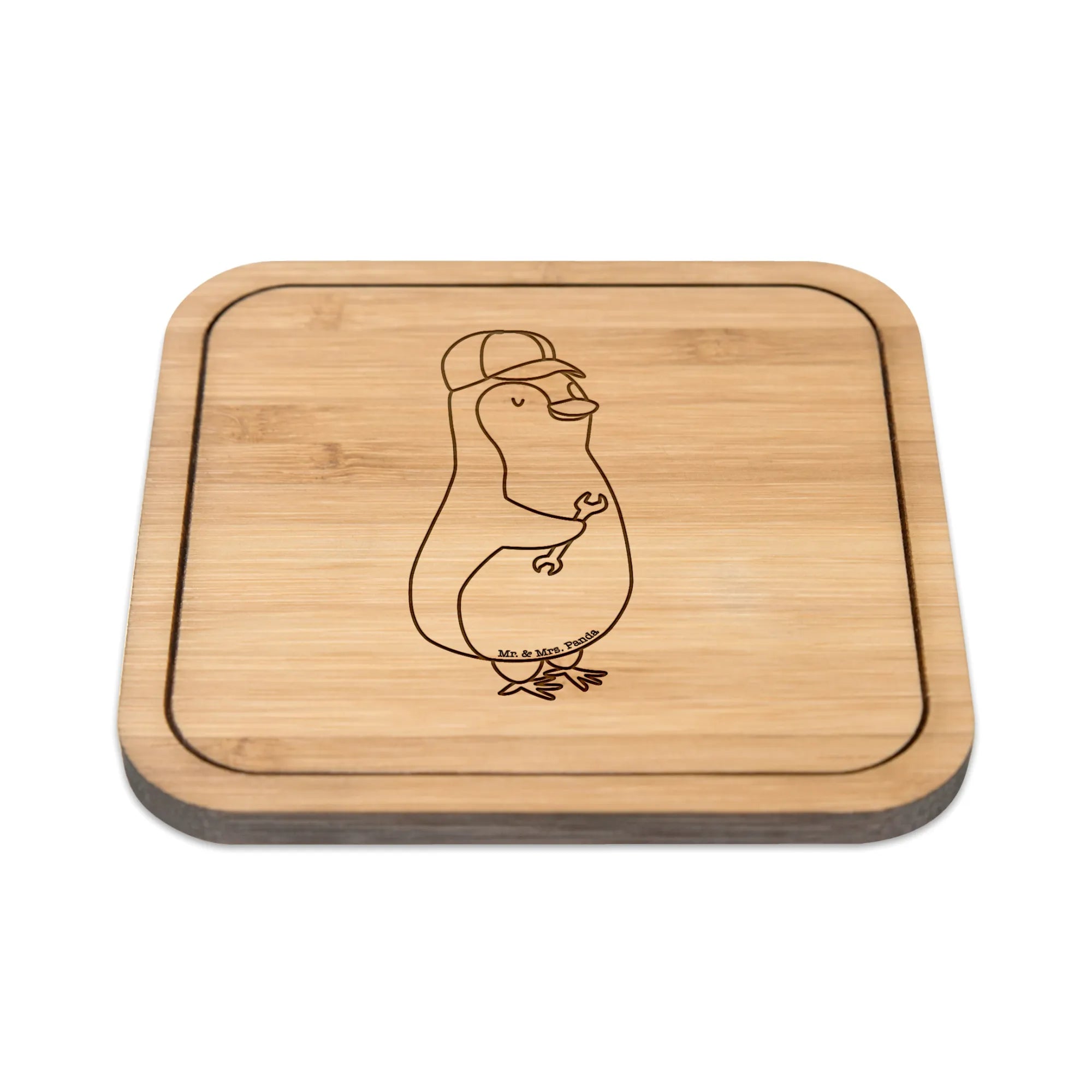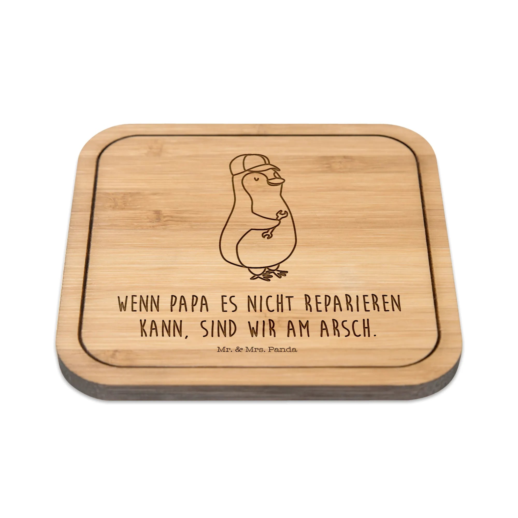 Ein kleiner Alltagsheld mit großem Humor: Der Untersetzer quadratisch von Mr. & Mrs. Panda mit dem Spruch „Wenn Papa es nicht reparieren kann, sind wir am Arsch." vereint Witz, Wärme und Nützlichkeit. Das Motiv zeigt einen charmanten Pinguin mit brauner Kappe und einem Schraubenschlüssel – handgezeichnet von Mrs. Panda und perfekt für alle Papas mit Werkzeugkiste oder für die, die einfach gern lachen.