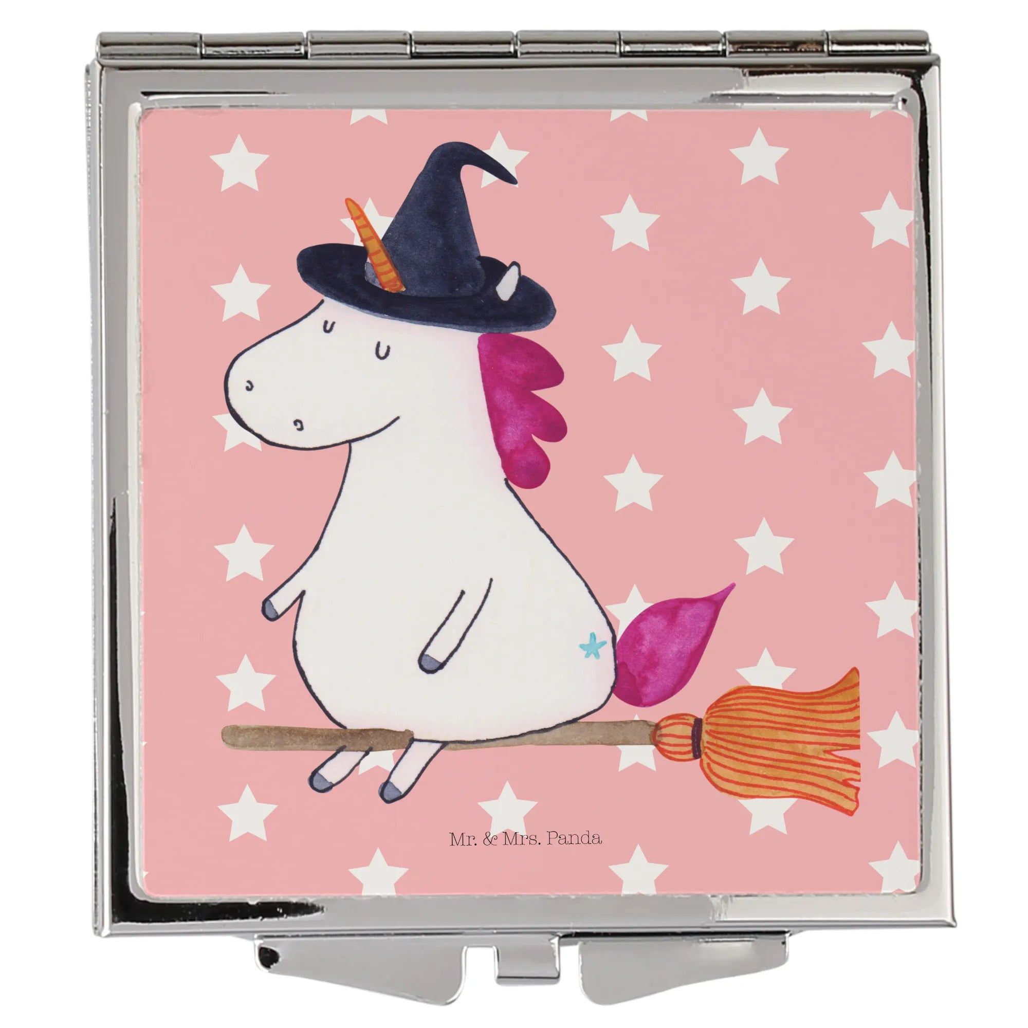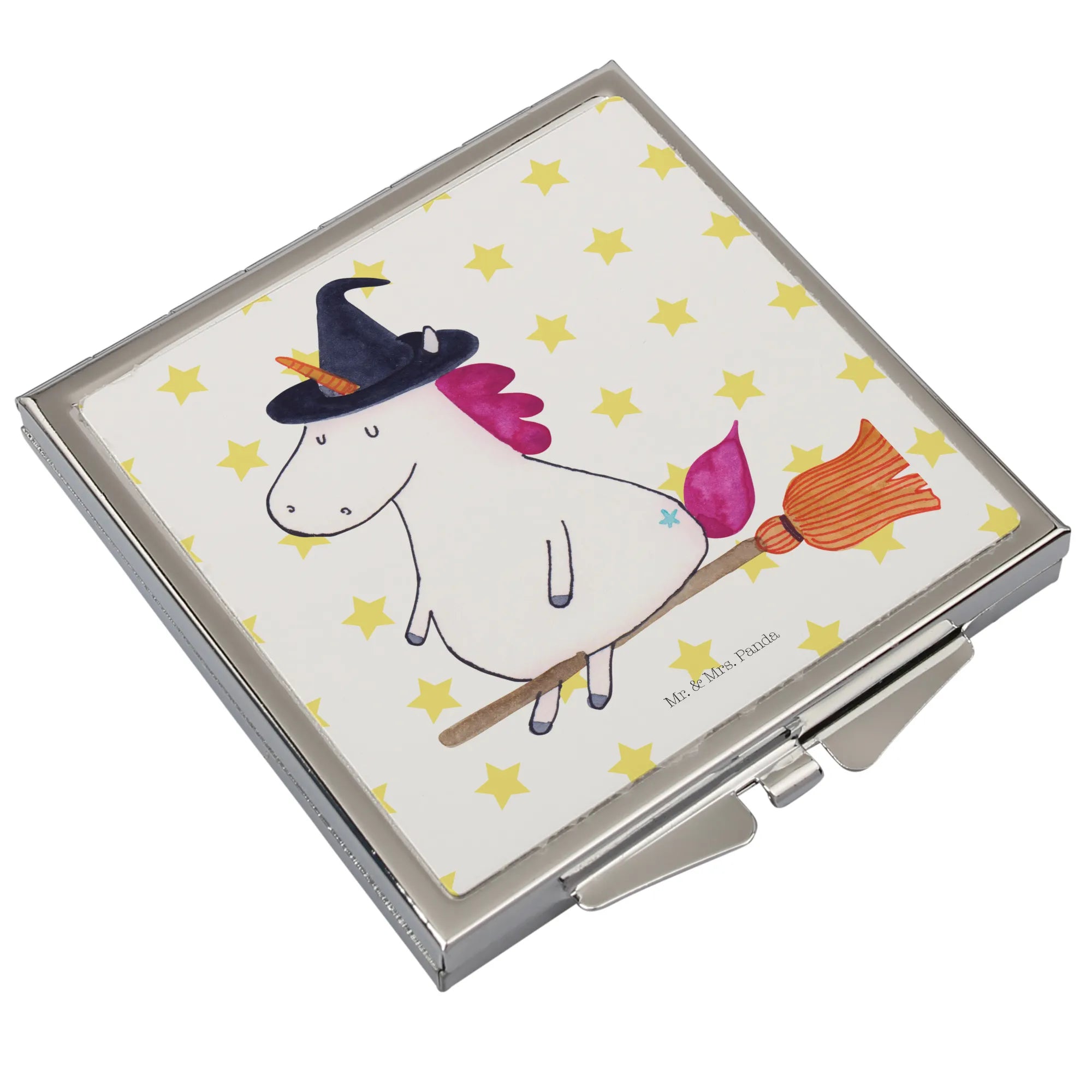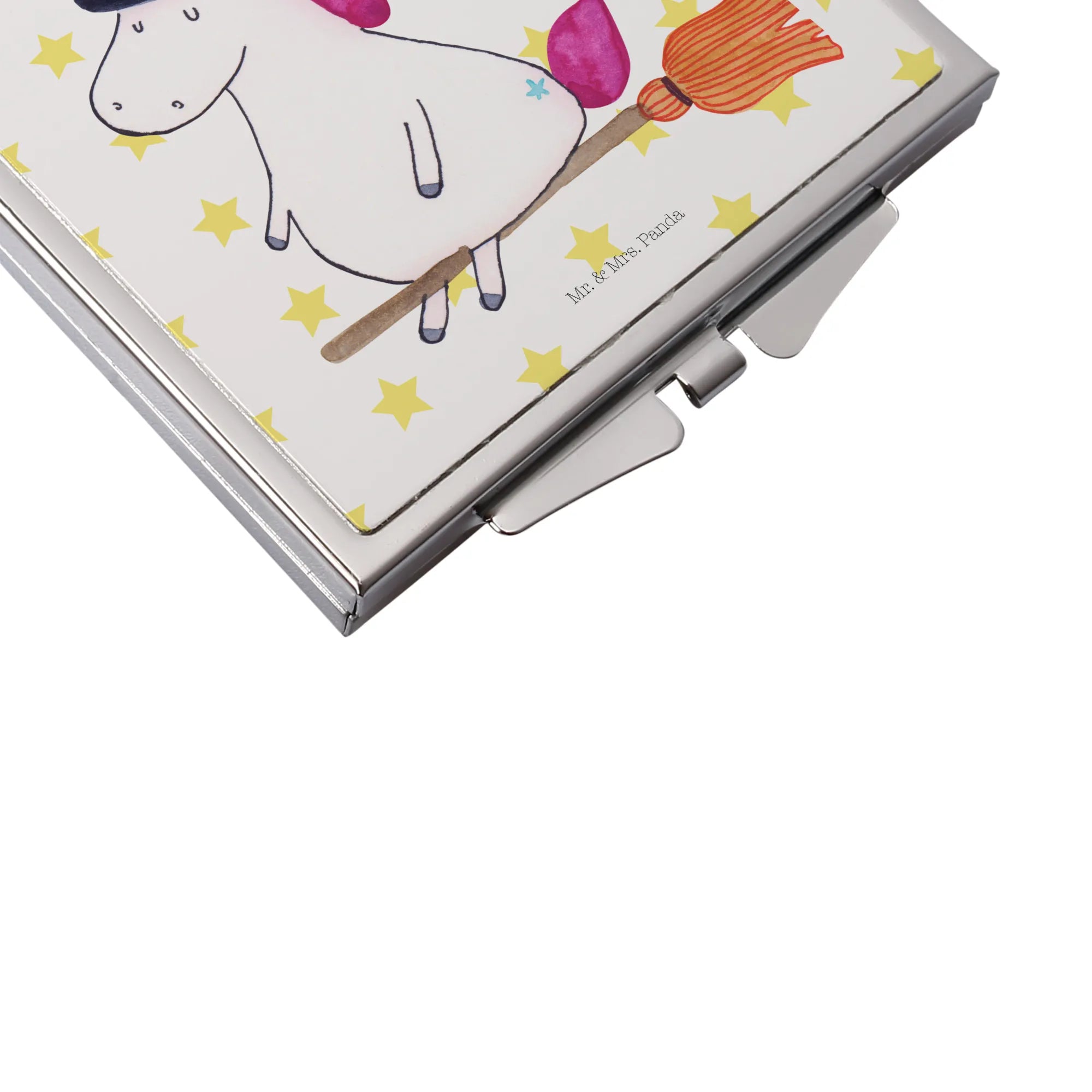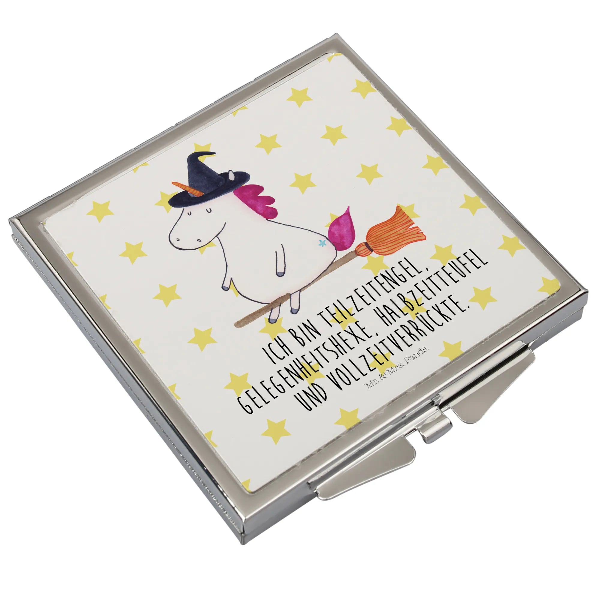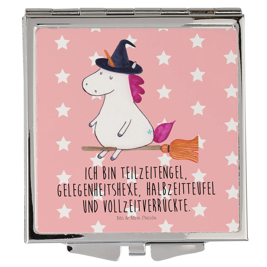 Ein funkelnder Begleiter für Einhorn-Fans: Der quadratische Handtaschenspiegel von Mr. & Mrs. Panda mit dem süßen Einhorn-Hexen-Motiv ist das perfekte Accessoire für alle, die Humor, Magie und Einhörner lieben. Das Motiv zeigt ein niedliches Einhorn mit Hexenhut auf einem Besen und den frechen Spruch: „Ich bin Teilzeitengel, Gelegenheitshexe, Halbzeitteufel und Vollzeitverrückte.“