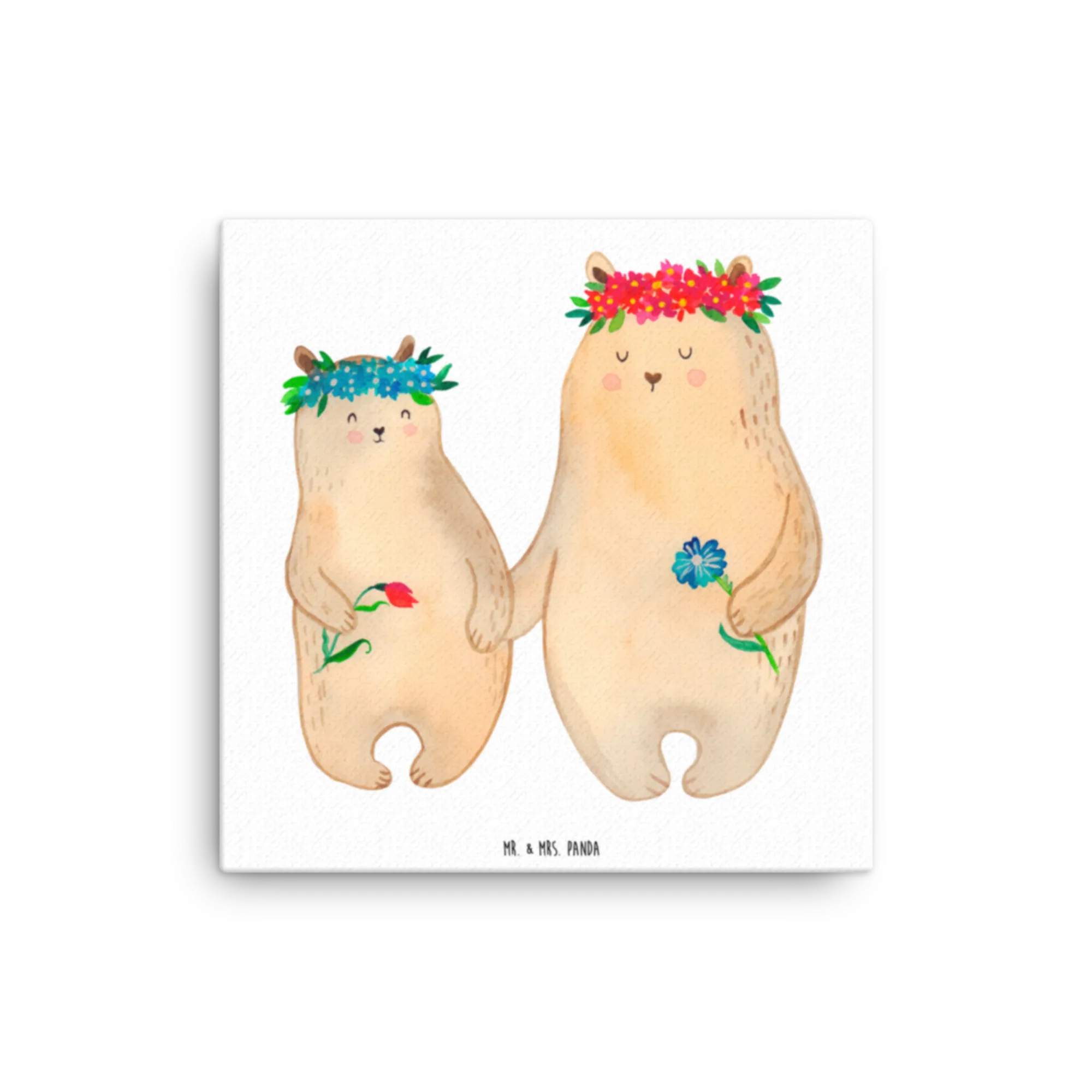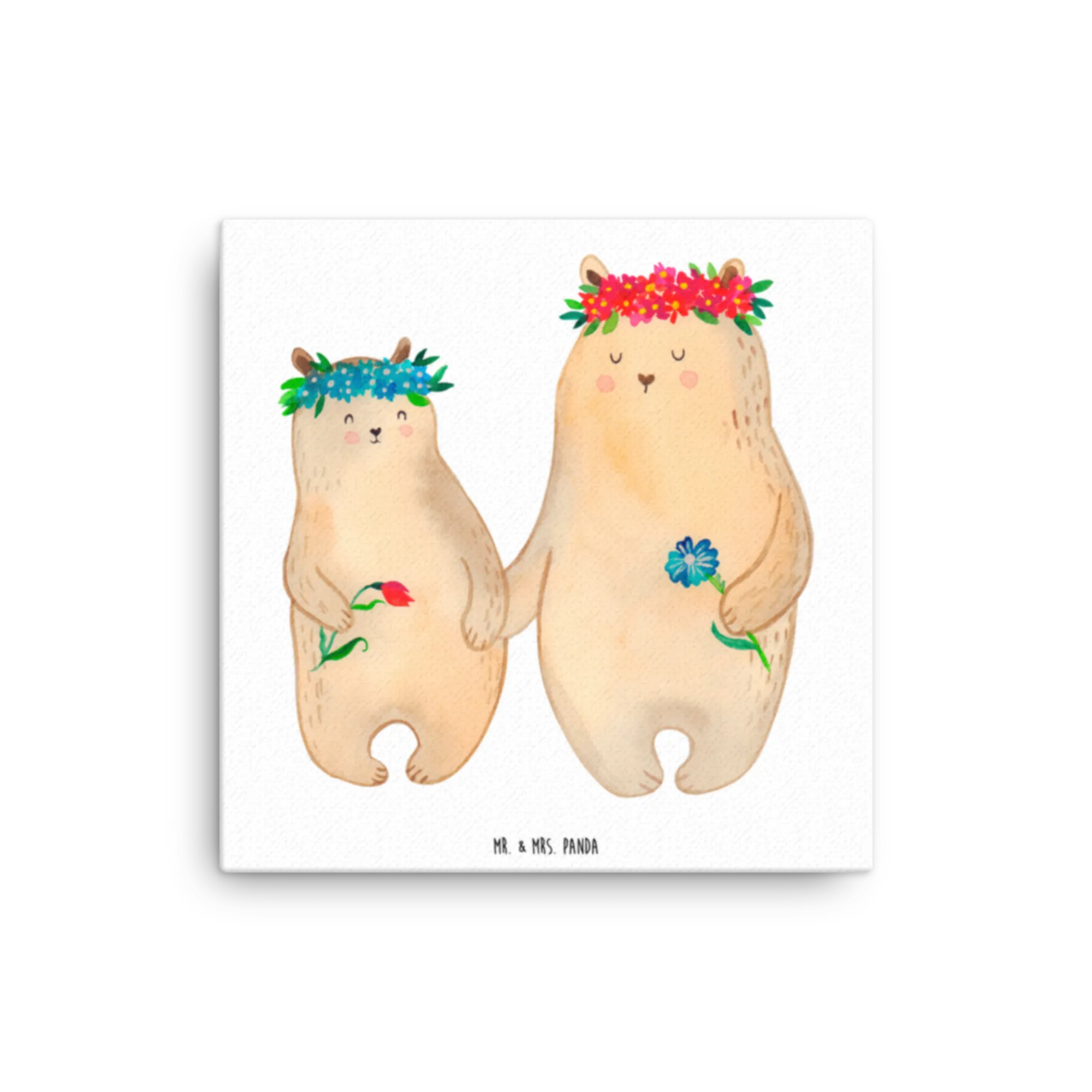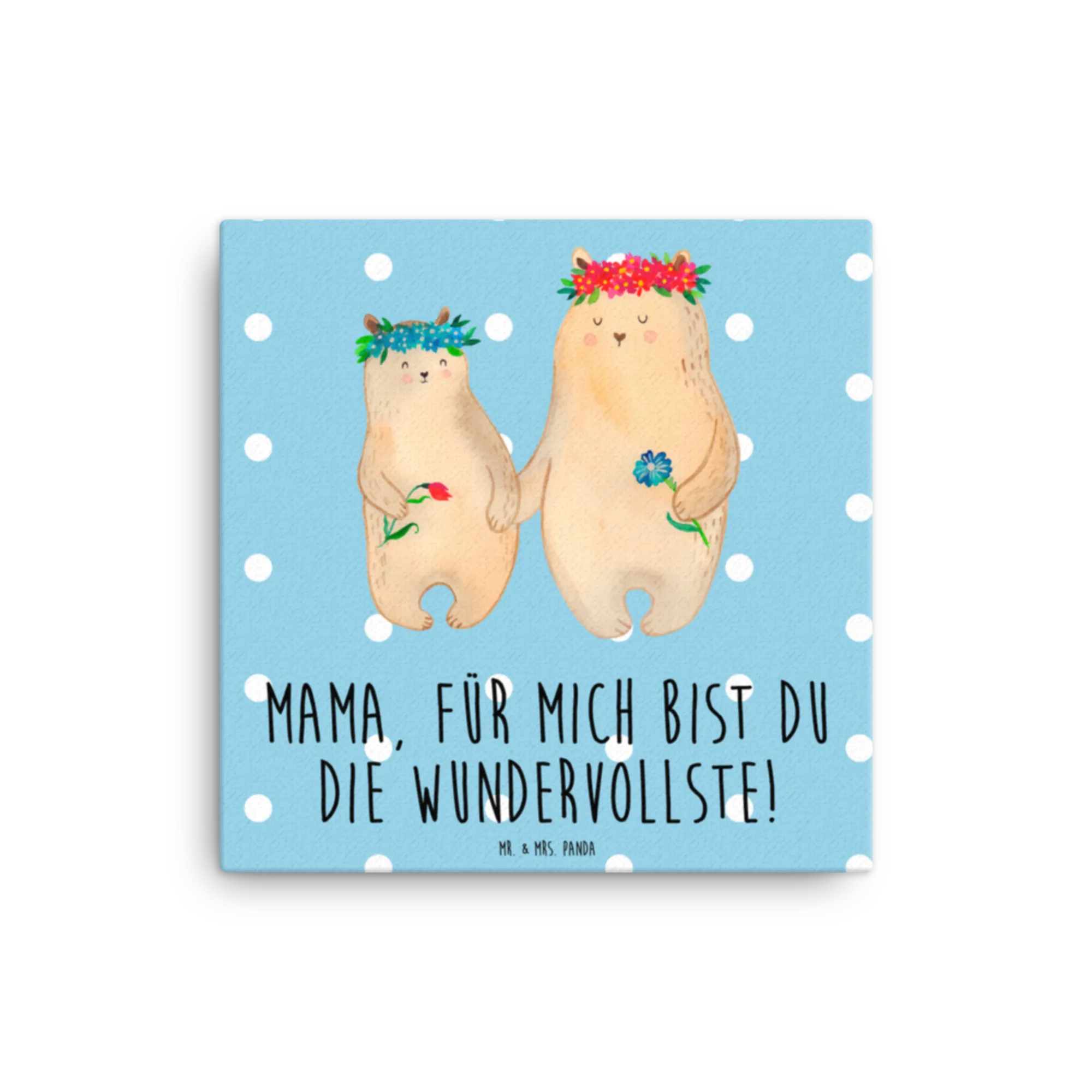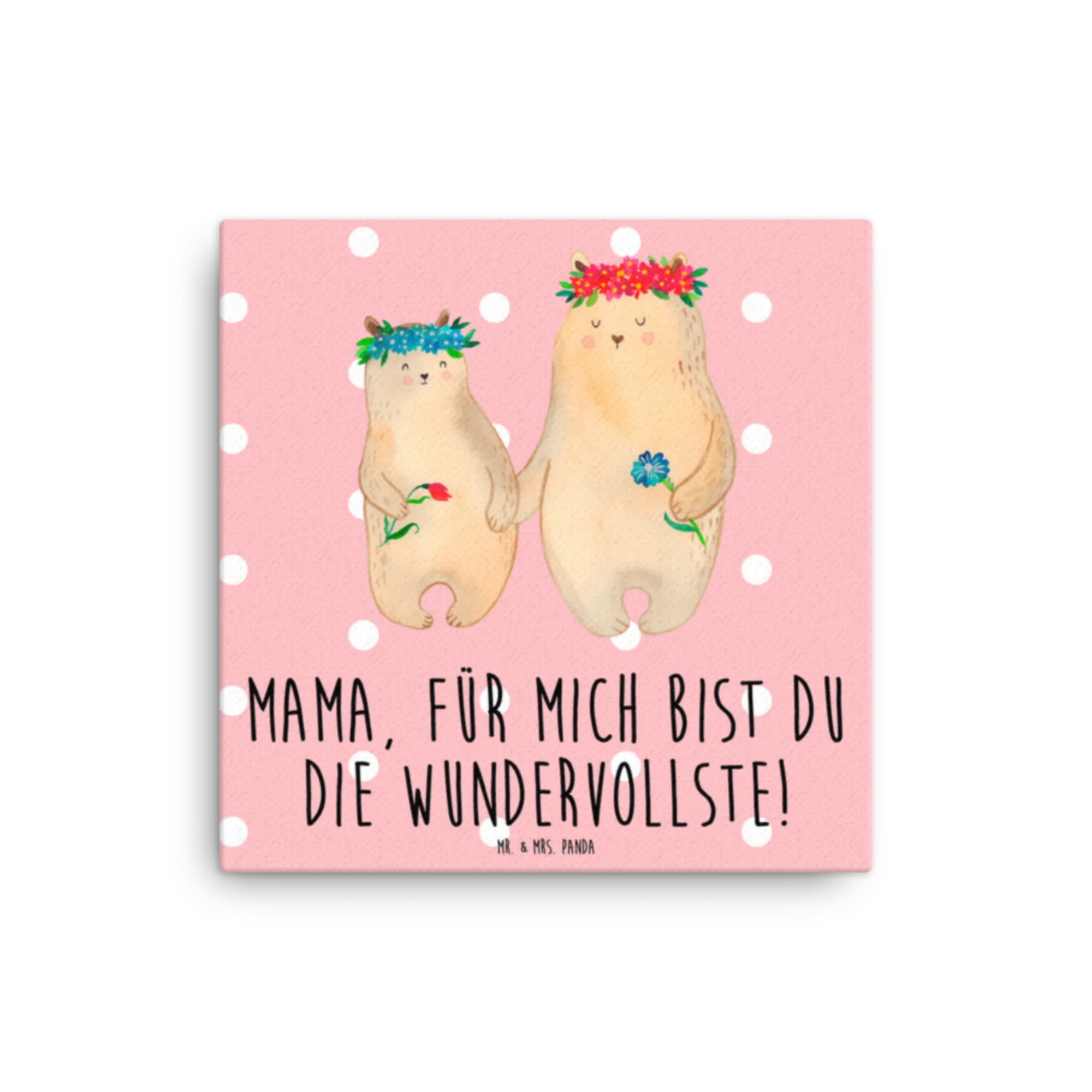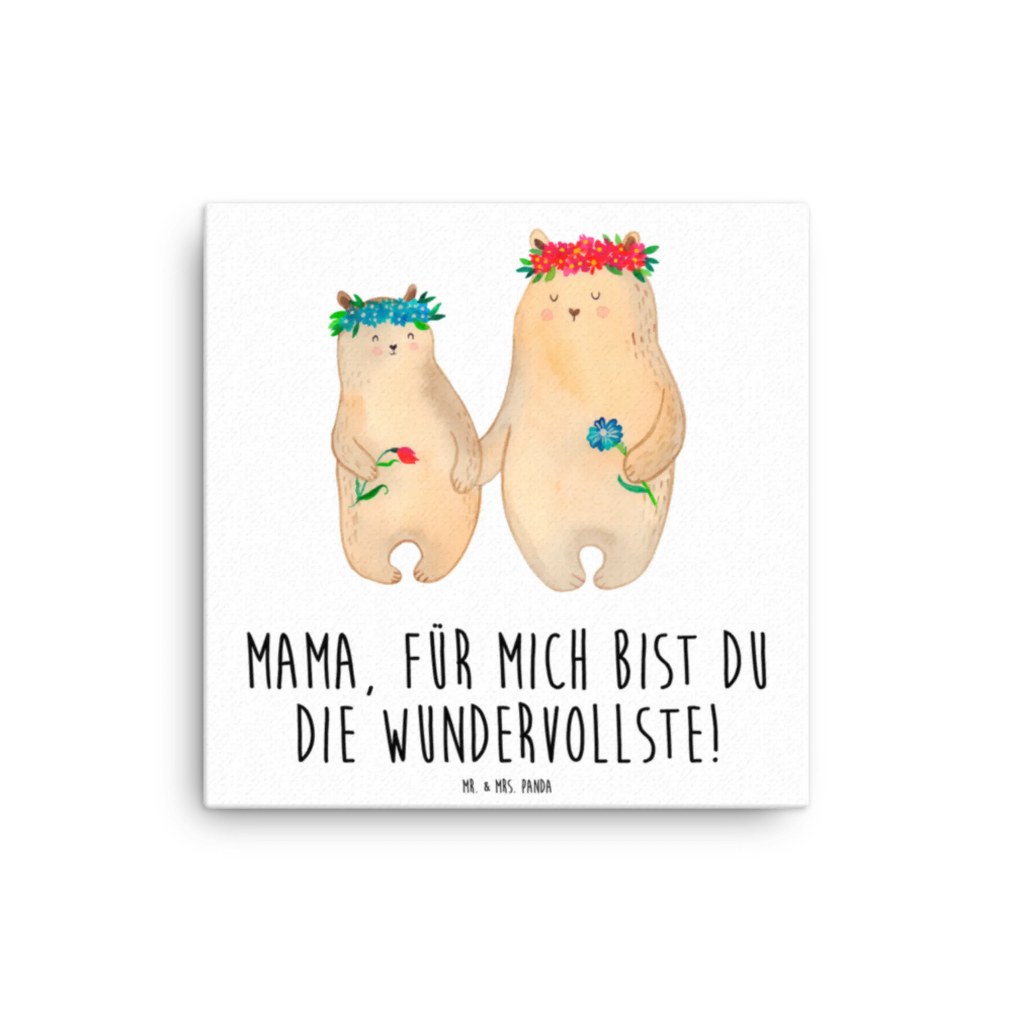 Mr. & Mrs. Panda Leinwand Bild „Bären mit Blumenkranz“ – ein zauberhaftes Kunstwerk aus unserer Familie-Kollektion. Die zwei niedlichen Bären mit ihren Blumenkränzen und der liebevolle Spruch „Mama, für mich bist du die Wundervollste!“ machen dieses Bild zur perfekten Wanddeko für Mama, zur gemütlichen Kinderzimmer Deko oder als emotionales Familienbild im Wohnzimmer.