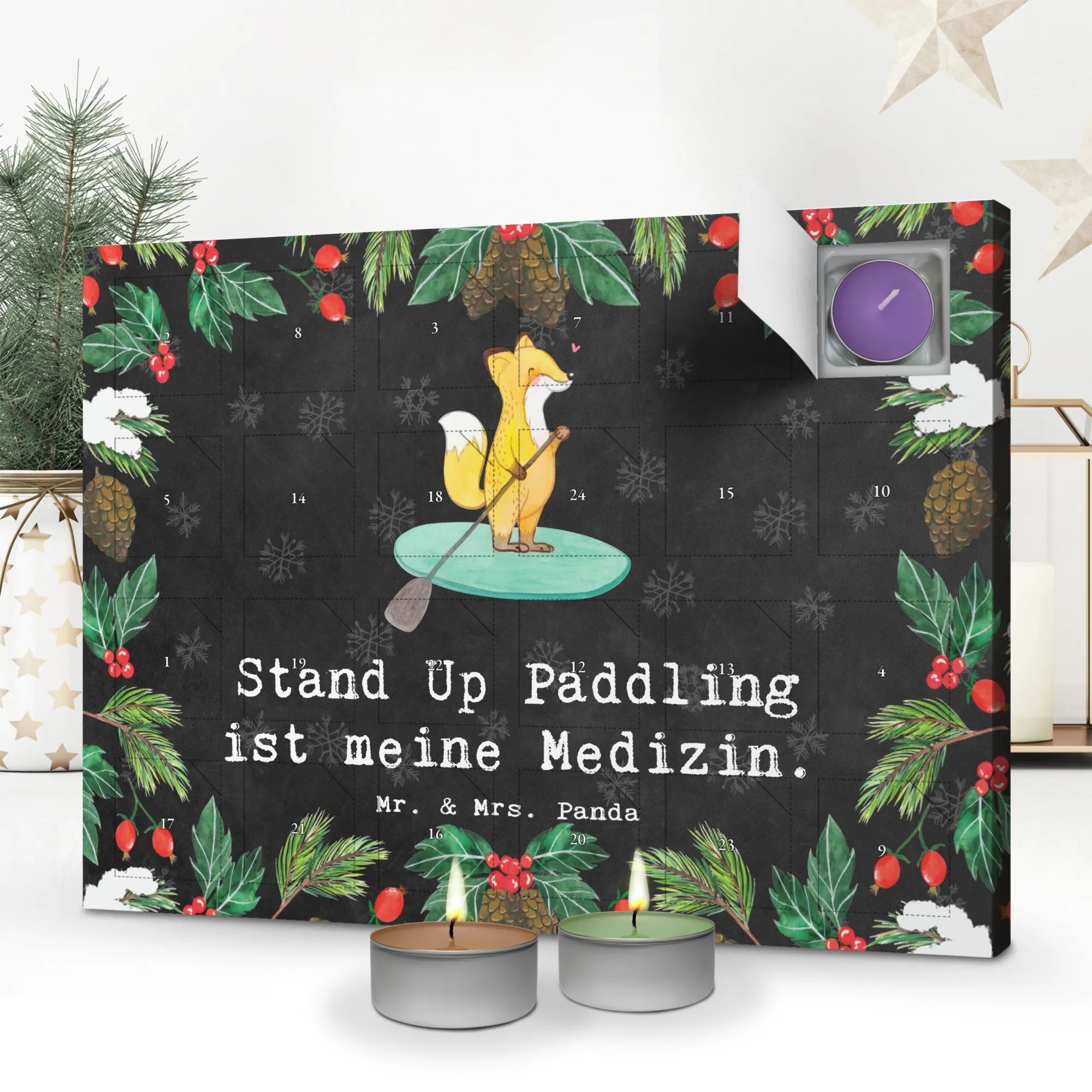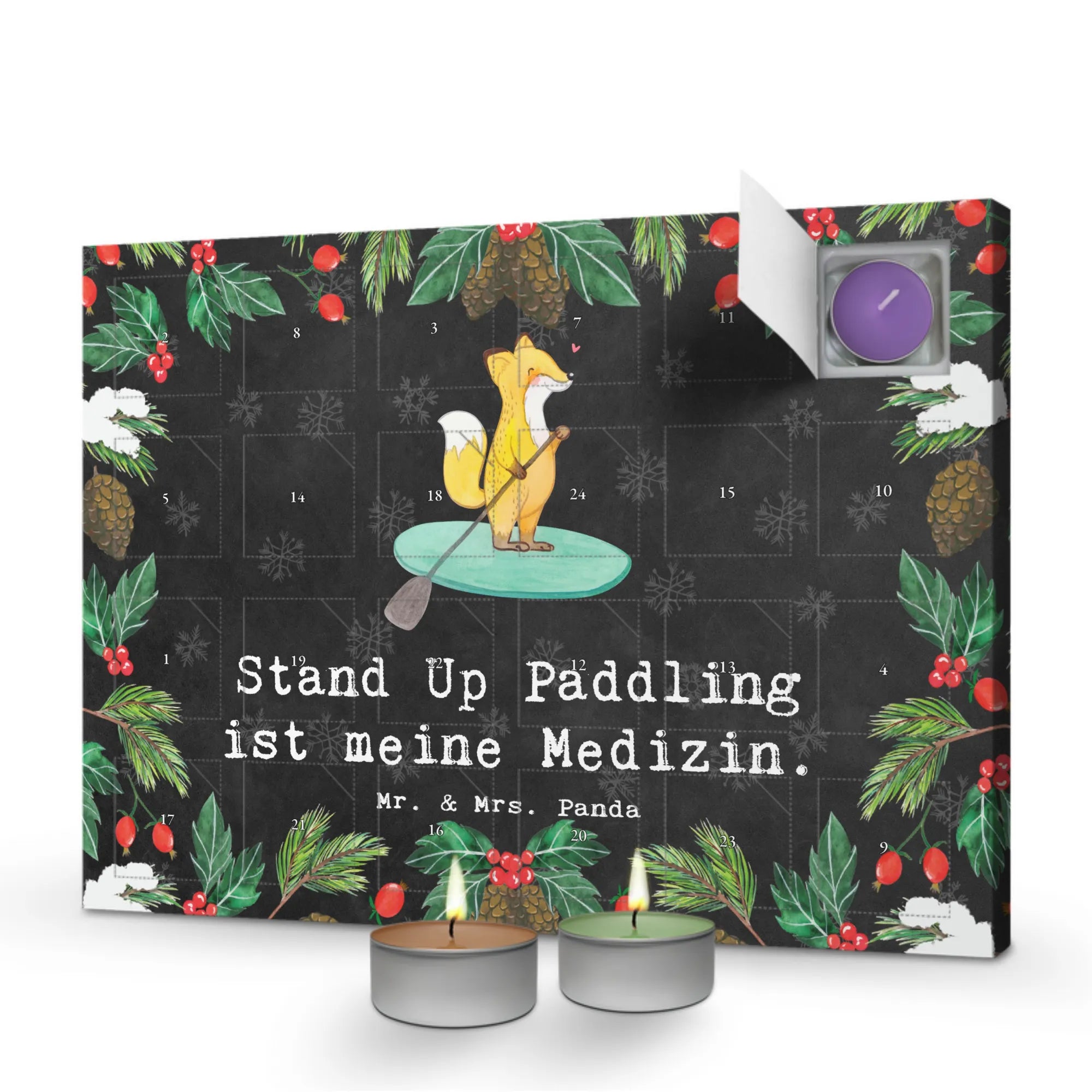Der Duftkerzen Adventskalender Fuchs Stand Up Paddling Medizin von Mr. & Mrs. Panda ist das perfekte Geschenk für alle Sportbegeisterten und Hobby-Fans. Mit diesem liebevoll gestalteten Adventskalender bringt Ihr die Freude an Weihnachten und die Leidenschaft für das Stand Up Paddling zusammen! Der Kalender ist nicht nur ein wunderbares Deko-Element, sondern auch eine kleine Oase der Entspannung – jeden Tag erwartet dich ein neuer, herrlicher Duft!