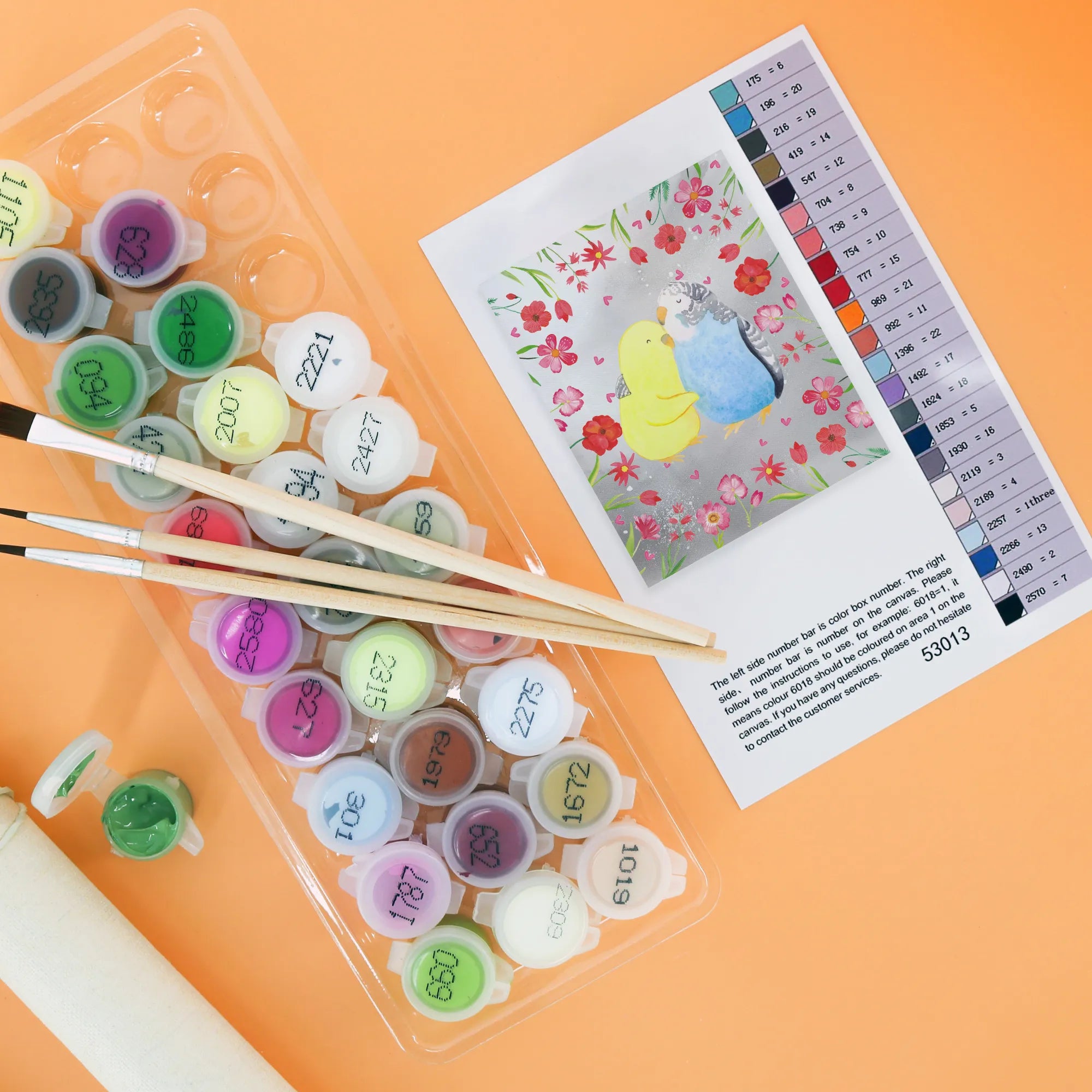 Die schönen Wellensittiche in zarten Farben symbolisieren Zuneigung und Vertrauen und laden ein, in die Welt des Malens einzutauchen. Das Produkt besteht aus hochwertigen Materialien, enthält 36 leuchtende Acrylfarben und wird mit allem geliefert, was du brauchst, um dein eigenes Kunstwerk zu schaffen, inklusive drei Pinsel und einer Malanleitung.