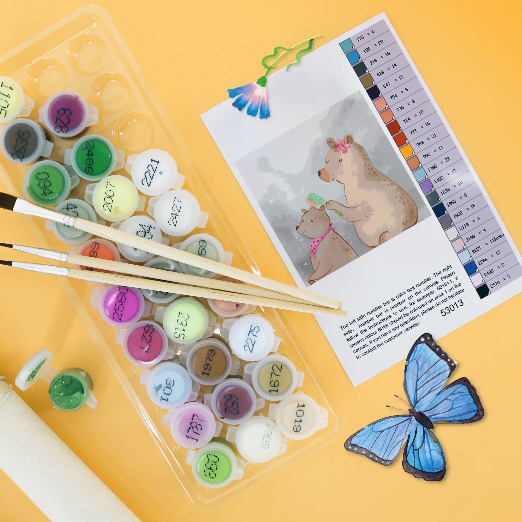 Der Bär mit Kind zeigt einen fürsorglichen Bären, der liebevoll durch das Fell seines kleinen Begleiters bürstet – eine Szene, die pure Geborgenheit und Wärme ausstrahlt. Das Malen nach Zahlen Set kommt mit hochwertigen Acrylfarben, die brillante Farben und eine hervorragende Deckkraft garantieren. Egal, ob du Anfänger oder schon ein wenig Erfahrung im Malen hast, du wirst mit diesem Set immer ein tolles Ergebnis erzielen.