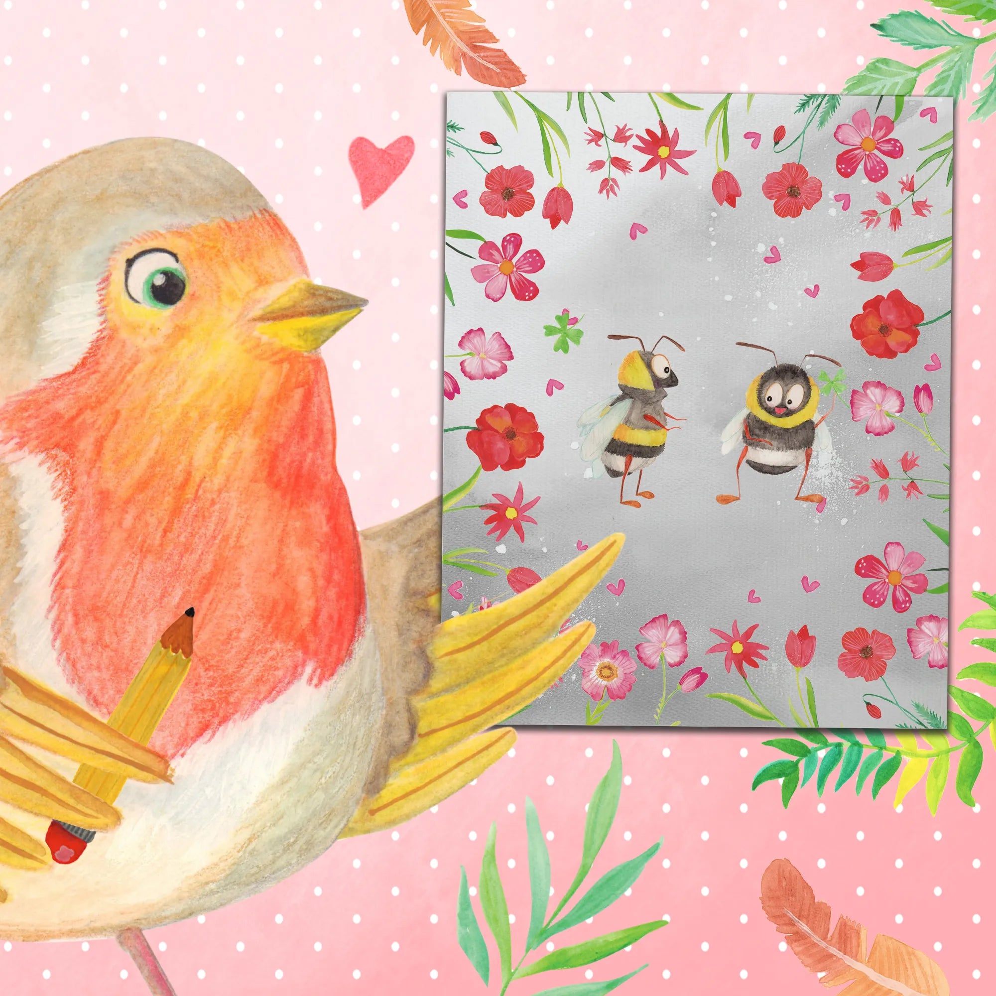 Die beiden niedlichen Bienen, die in einem verspielten, charmanten Stil gezeichnet sind, bringen nicht nur Farbe in dein Leben, sondern auch Selbstständigkeit. Mit einem vierblättrigen Kleeblatt in den Händen strahlt die eine Biene pure Freude aus, während die andere mit ihren großen, expressiven Augen eine einladende Haltung einnimmt.