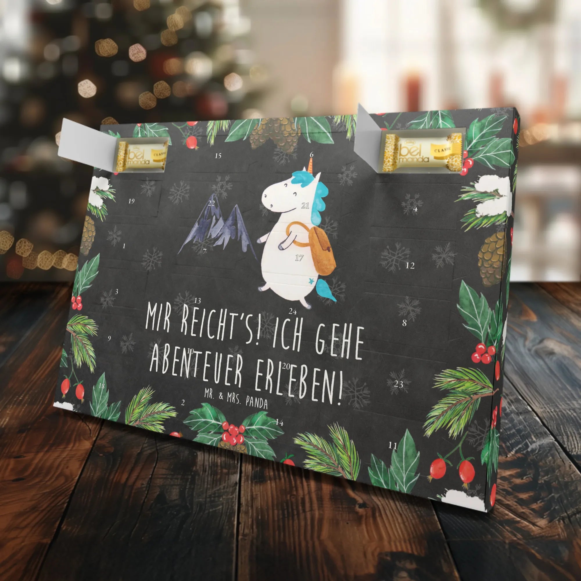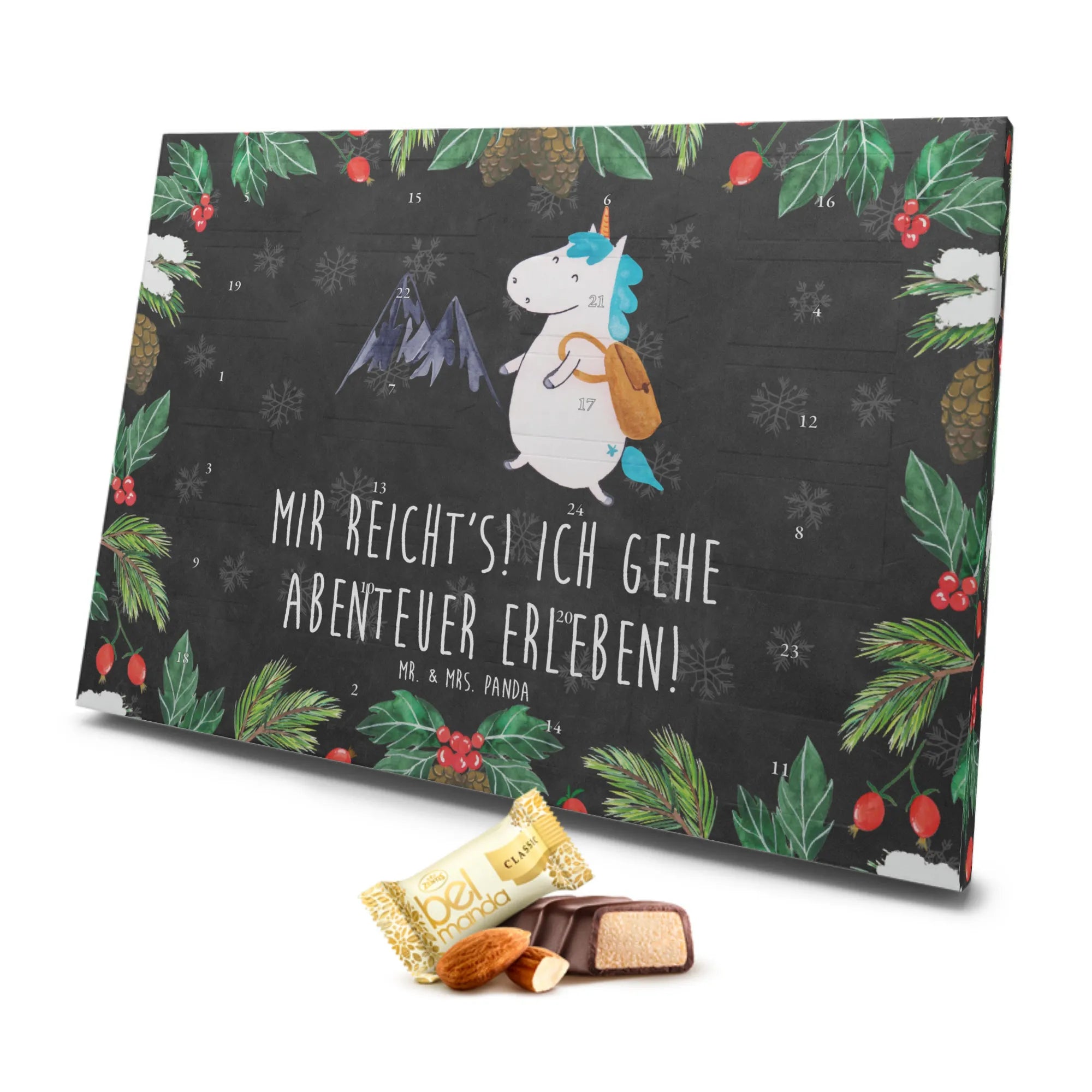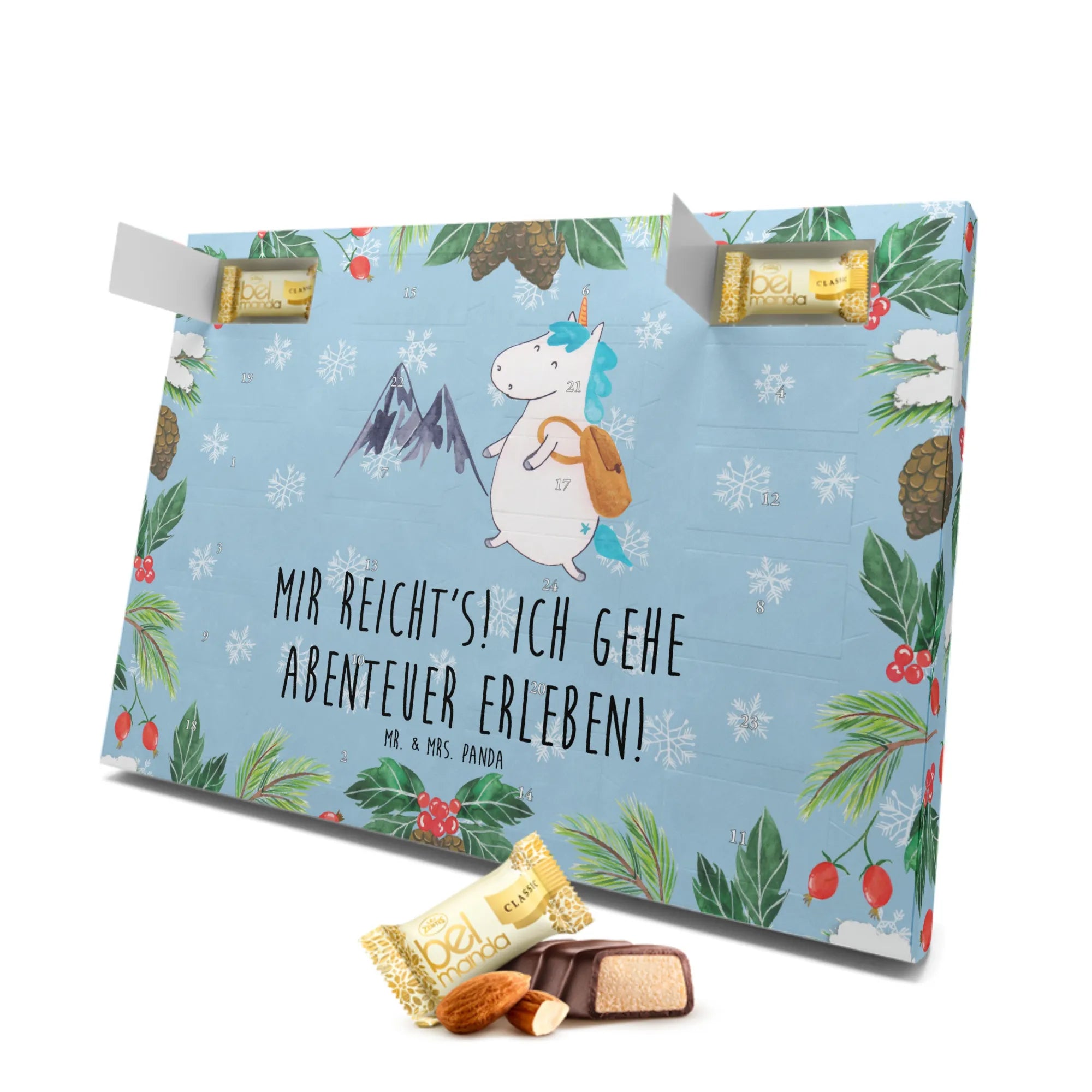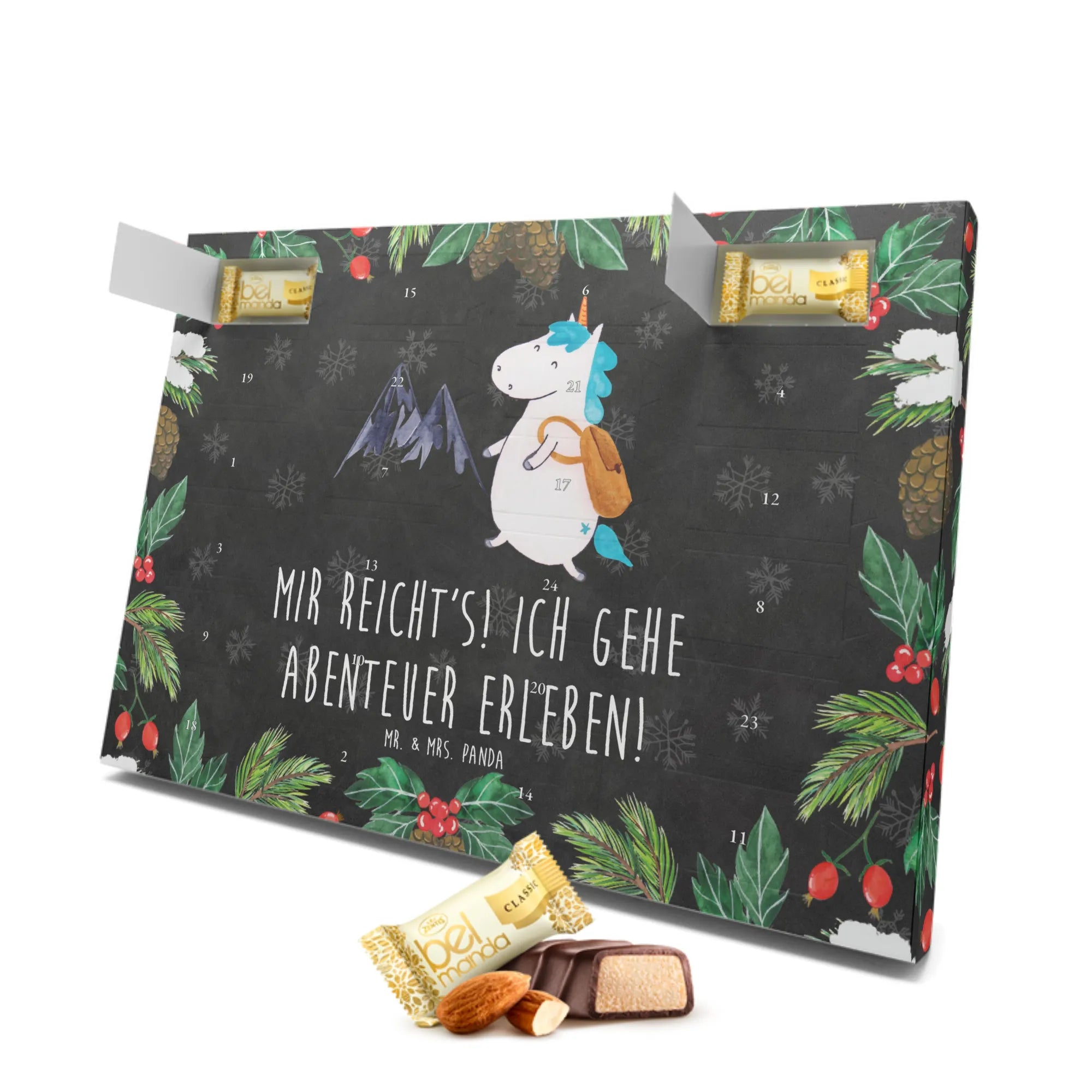 Der Marzipan Adventskalender Einhorn Bergsteiger von Mr. & Mrs. Panda ist nicht nur ein süßes Weihnachtsgeschenk, sondern ein echtes Abenteuer! Mit seinem liebevoll gestalteten Motiv eines niedlichen Einhorns, das mit Rucksack in die Berge wandert, ist dieser Adventskalender perfekt für alle Abenteuerlustigen und Einhorn-Fans.