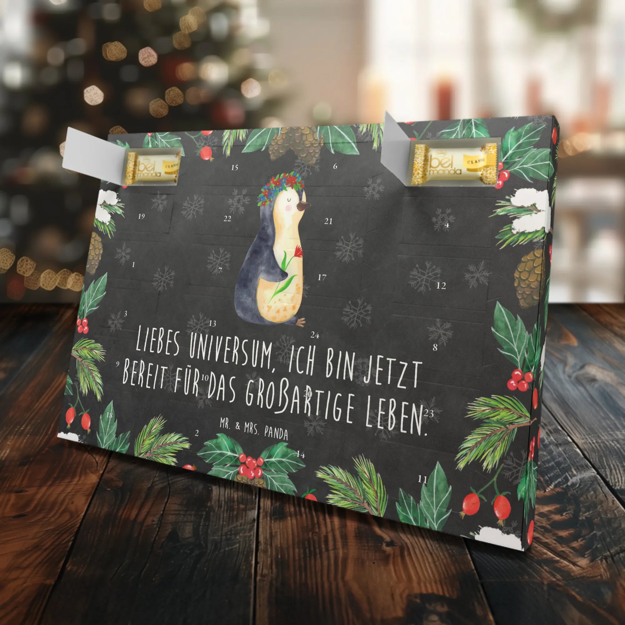 Die zauberhafte Verpackung des Adventskalenders zeigt einen niedlichen Pinguin mit einem bunten Blumenkranz auf dem Kopf und einer Blume in der Hand. Dieses liebevoll gestaltete Motiv bringt nicht nur deinen Advent zum Strahlen, sondern verleiht auch deinem Zuhause eine fröhliche Note. Der Slogan 'Liebes Universum, ich bin jetzt bereit für das großartige Leben.' inspiriert dich dazu, deine Lebensziele und Wünsche nie aus den Augen zu verlieren. Egal, ob du diesen Kalender für dich selbst oder als Geschenk für einen lieben Menschen kaufst, er wird viel Freude und eine Extraportion Motivation bringen!