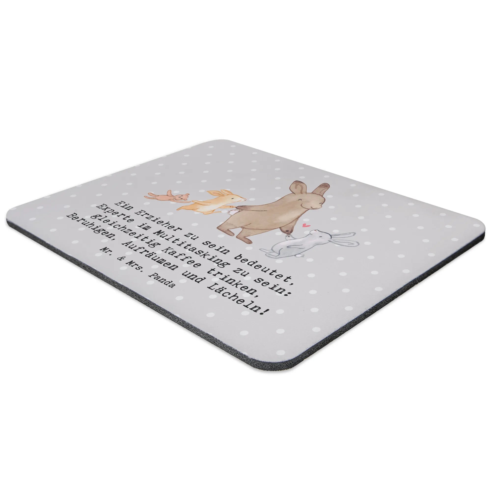 Auf dem Mauspad prangt der liebevoll gestaltete Spruch: "Ein Erzieher zu sein bedeutet, Experte im Multitasking zu sein: gleichzeitig Kaffee trinken, Beruhigen, Aufräumen und Lächeln!" – einfach perfekt, um die vielen Facetten dieses wundervollen Berufs zu unterstreichen. Das Motiv wurde von Mrs. Panda handgezeichnet und überzeugt durch dessen liebevolle Aquarellgestaltung, die jede Arbeitsfläche ein Stück lebendiger macht.