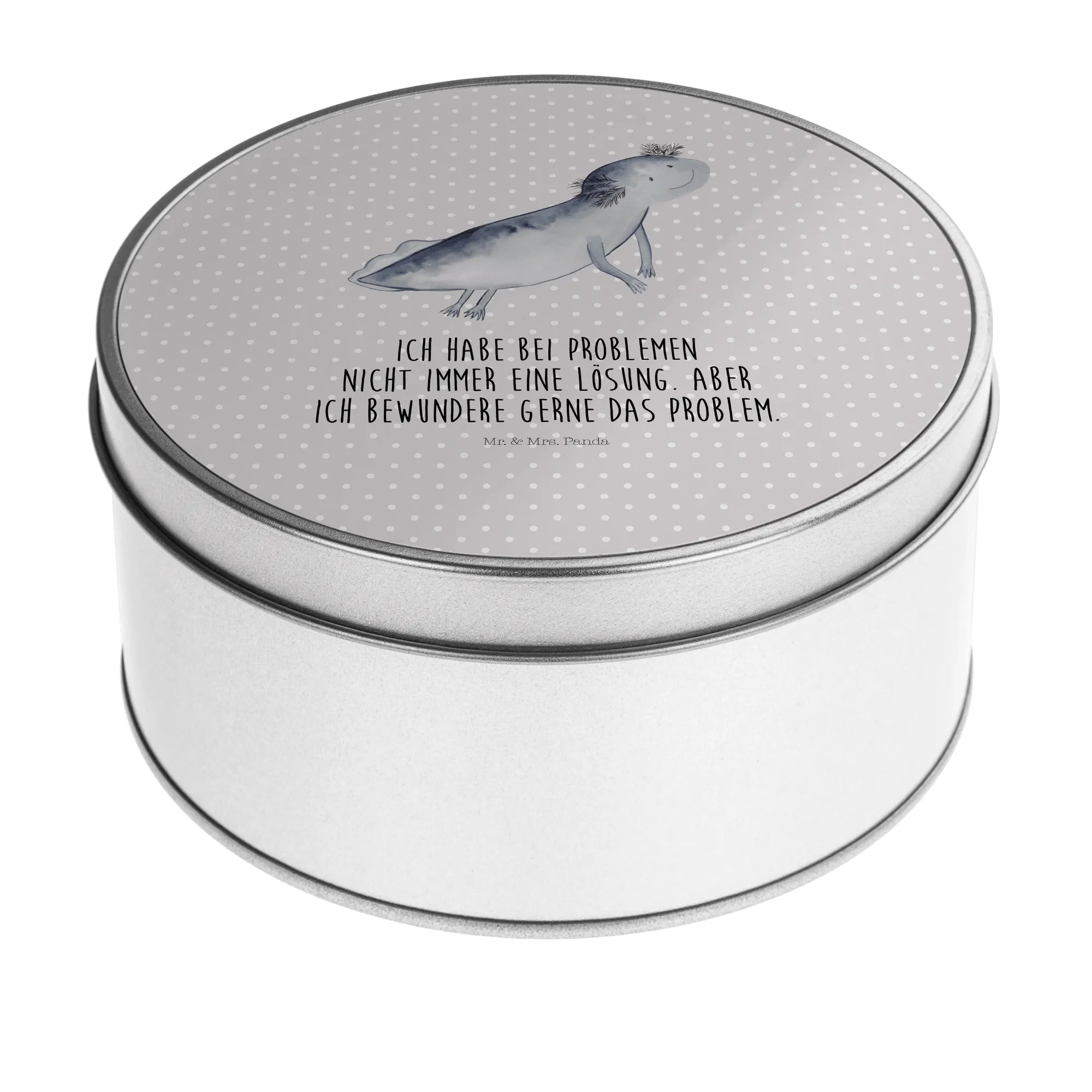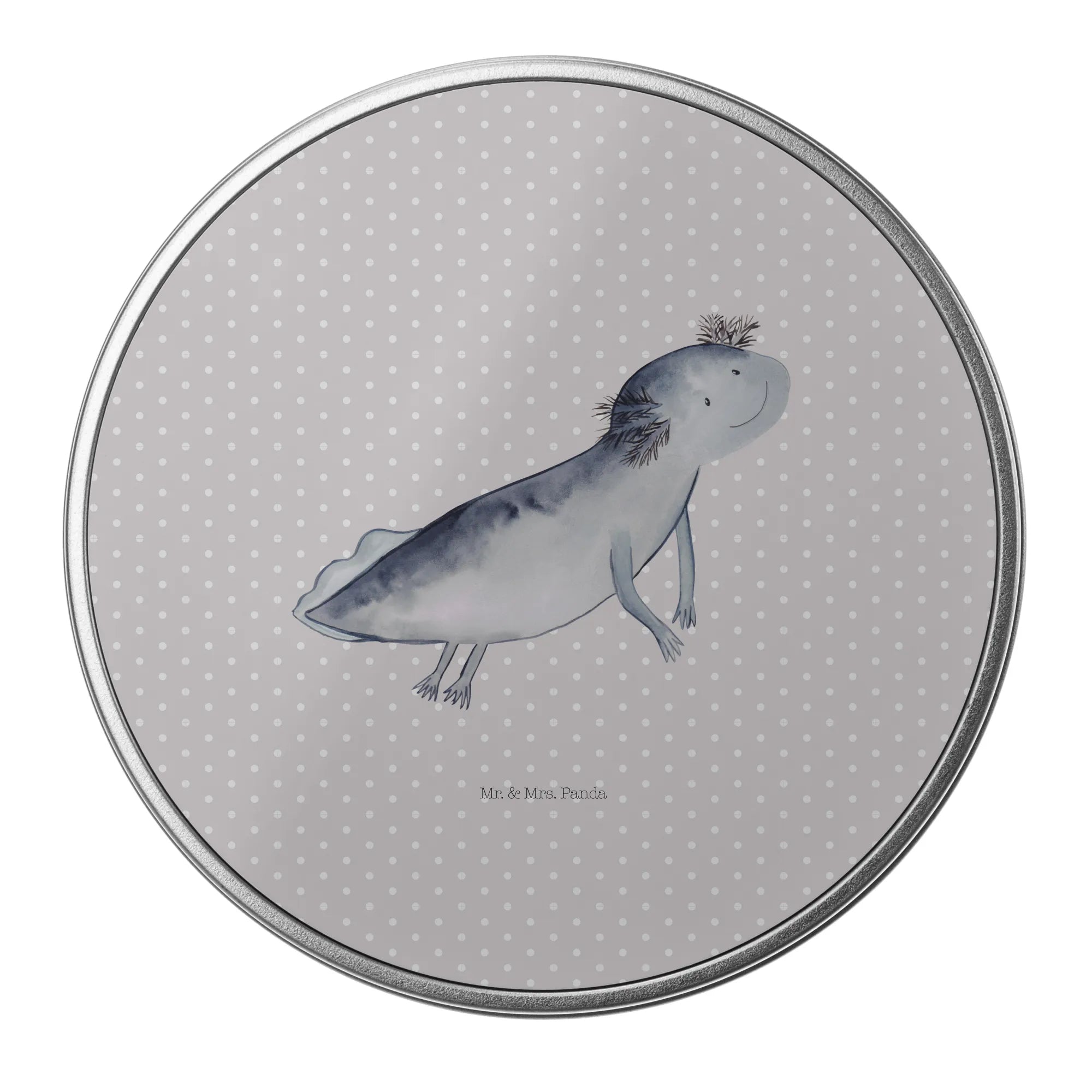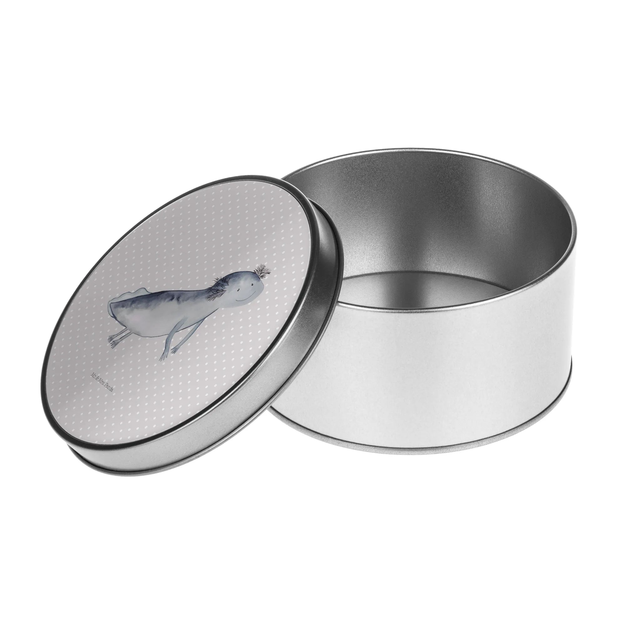 okrągła puszka z blachy ajolotl pływanie - z napisem