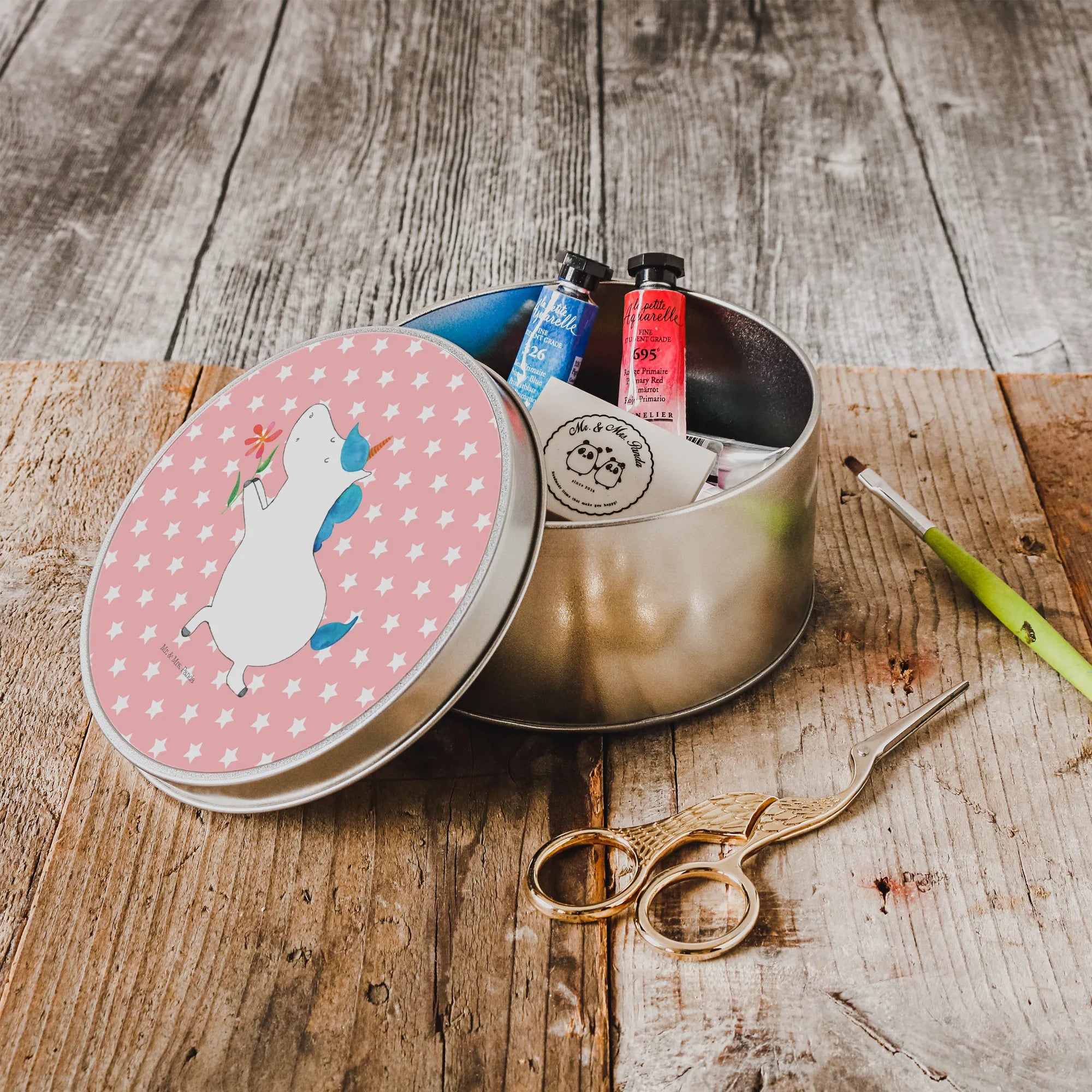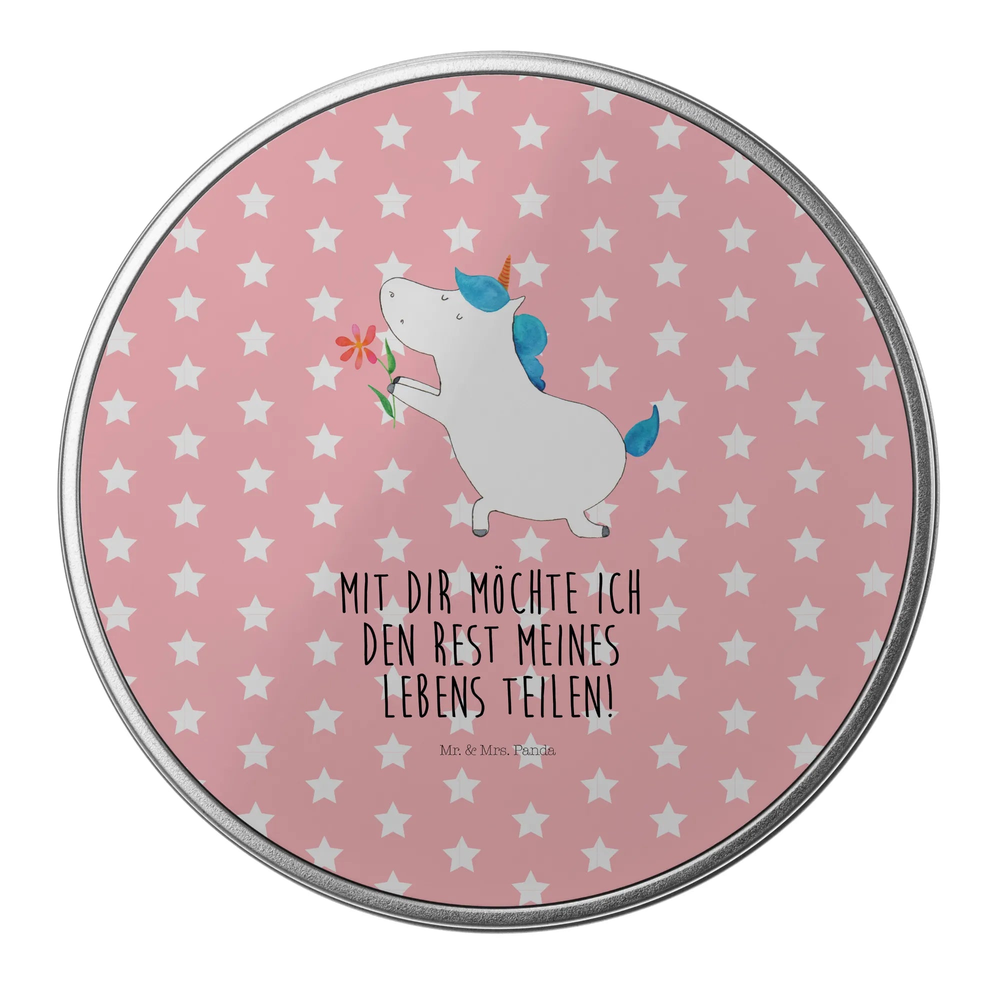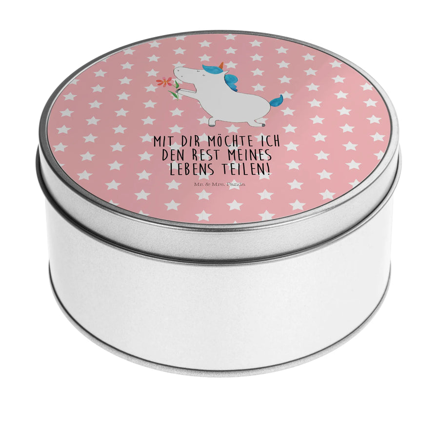 okrągła puszka z blachy jednorożec kwiat - z napisem