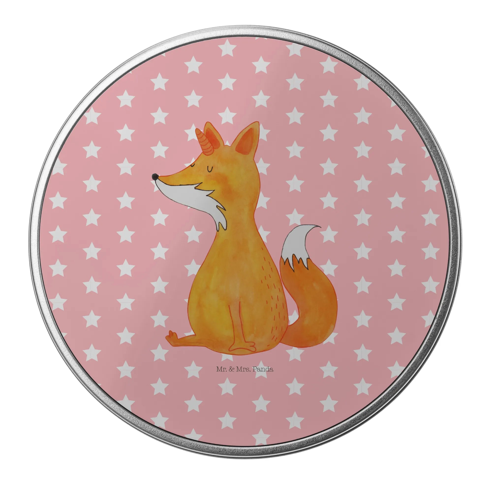 okrągła puszka z blachy Jednorożec lis - z napisem