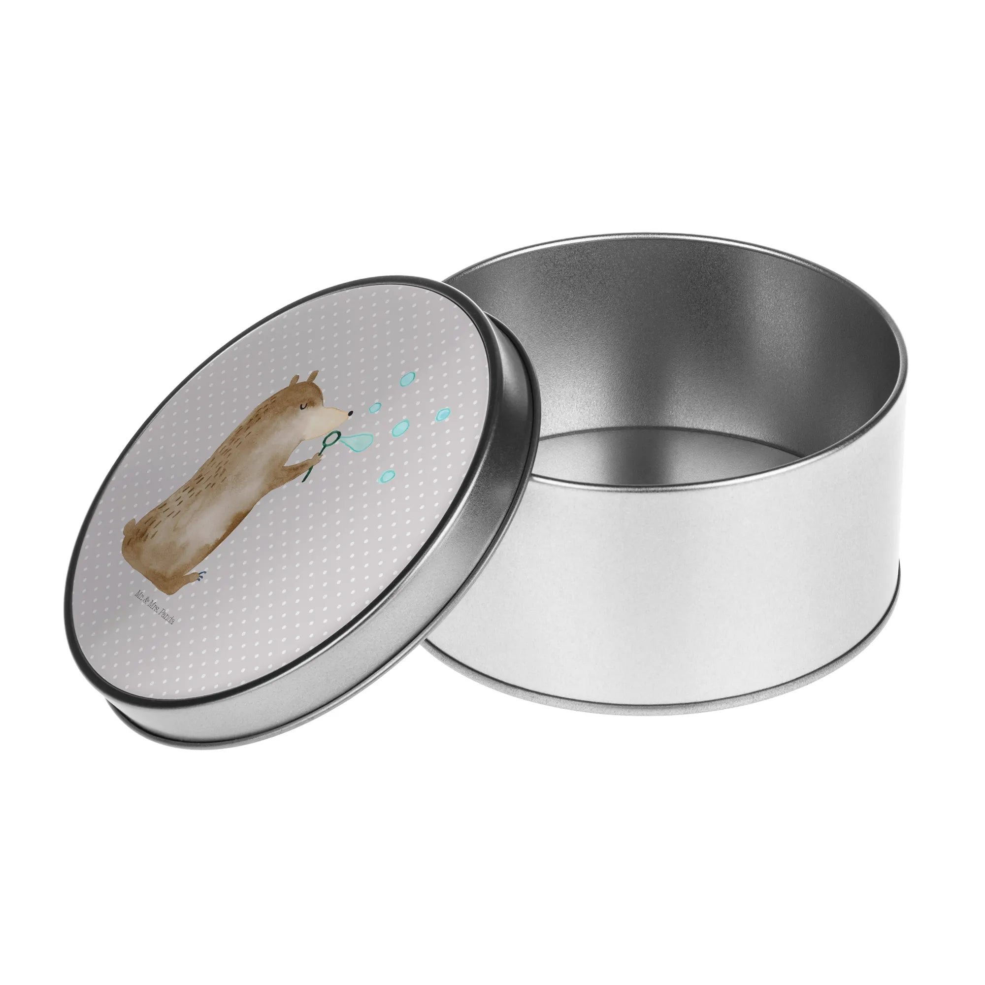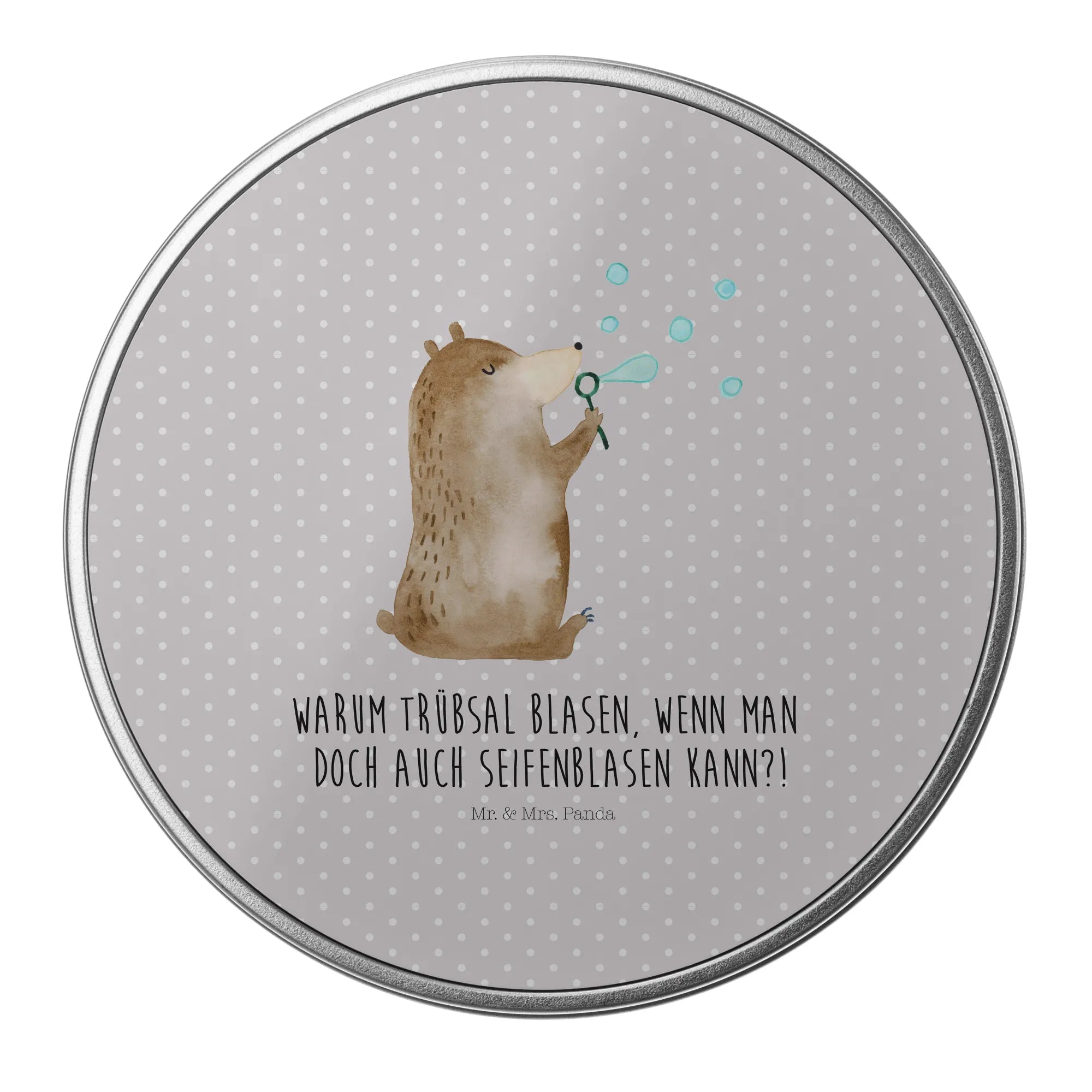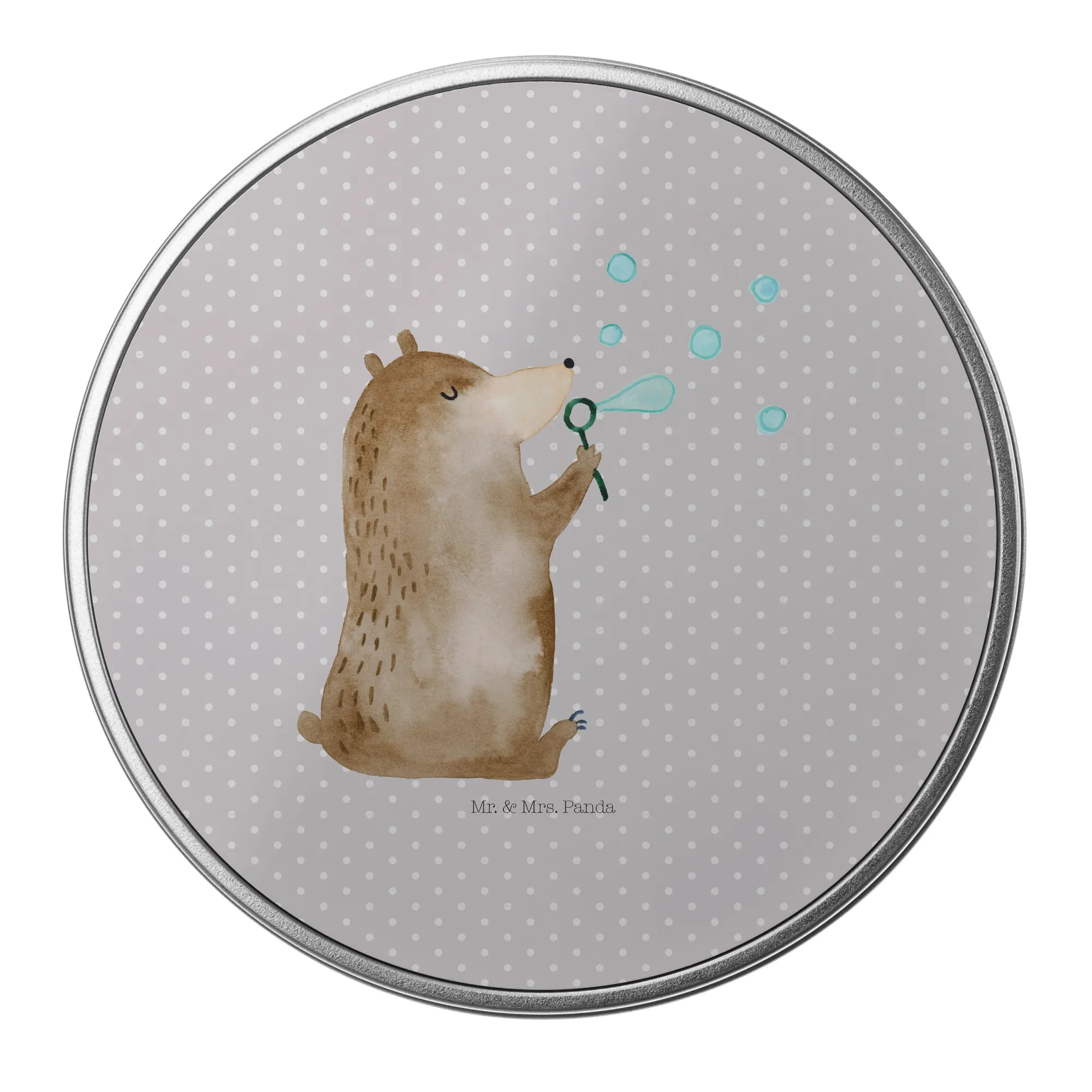 okrągła puszka z blachy niedźwiedź bańki mydlane - z napisem