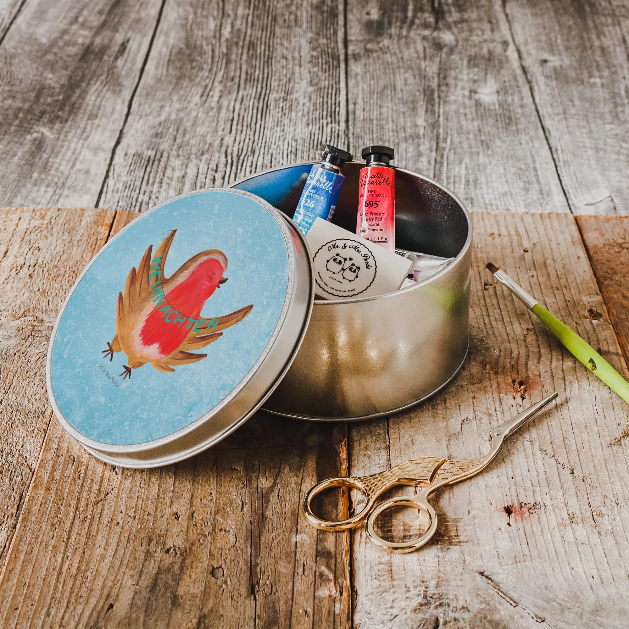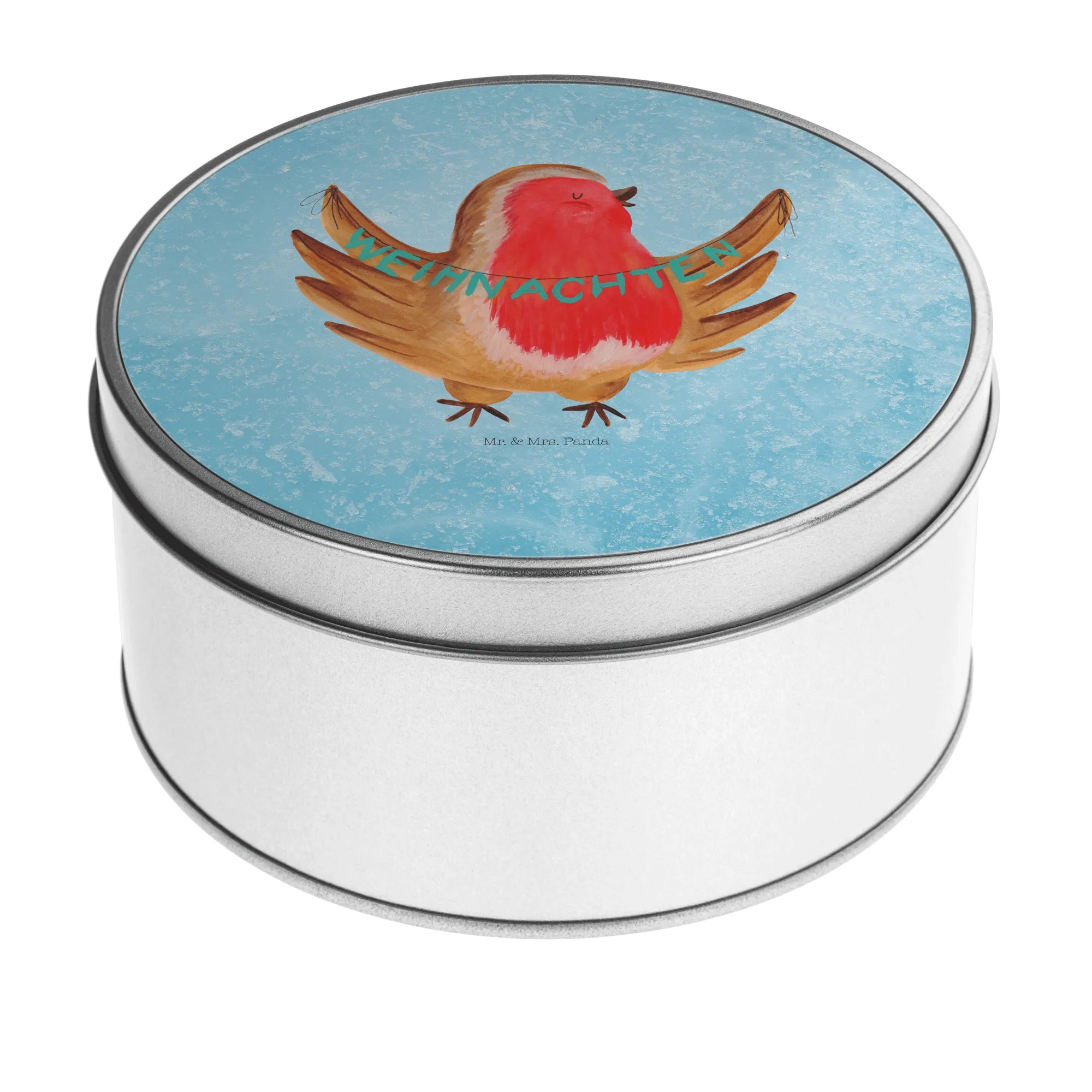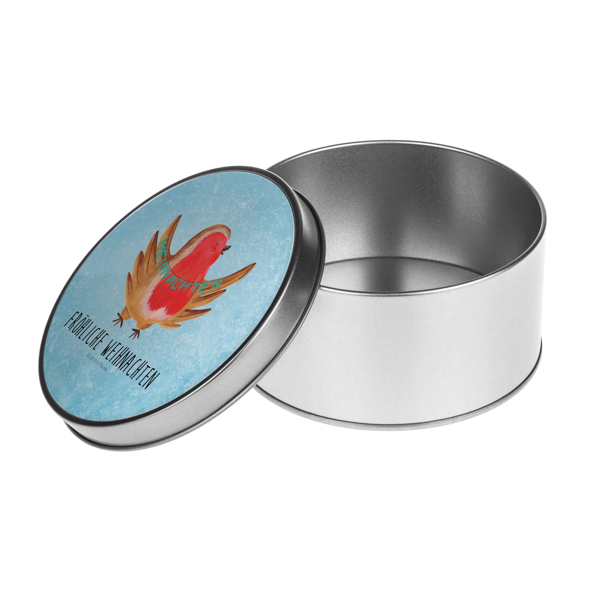okrągła puszka z blachy rudzik Boże Narodzenie - z napisem