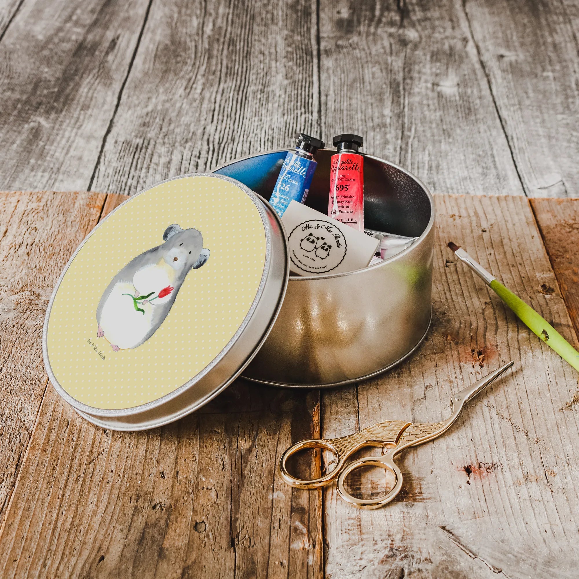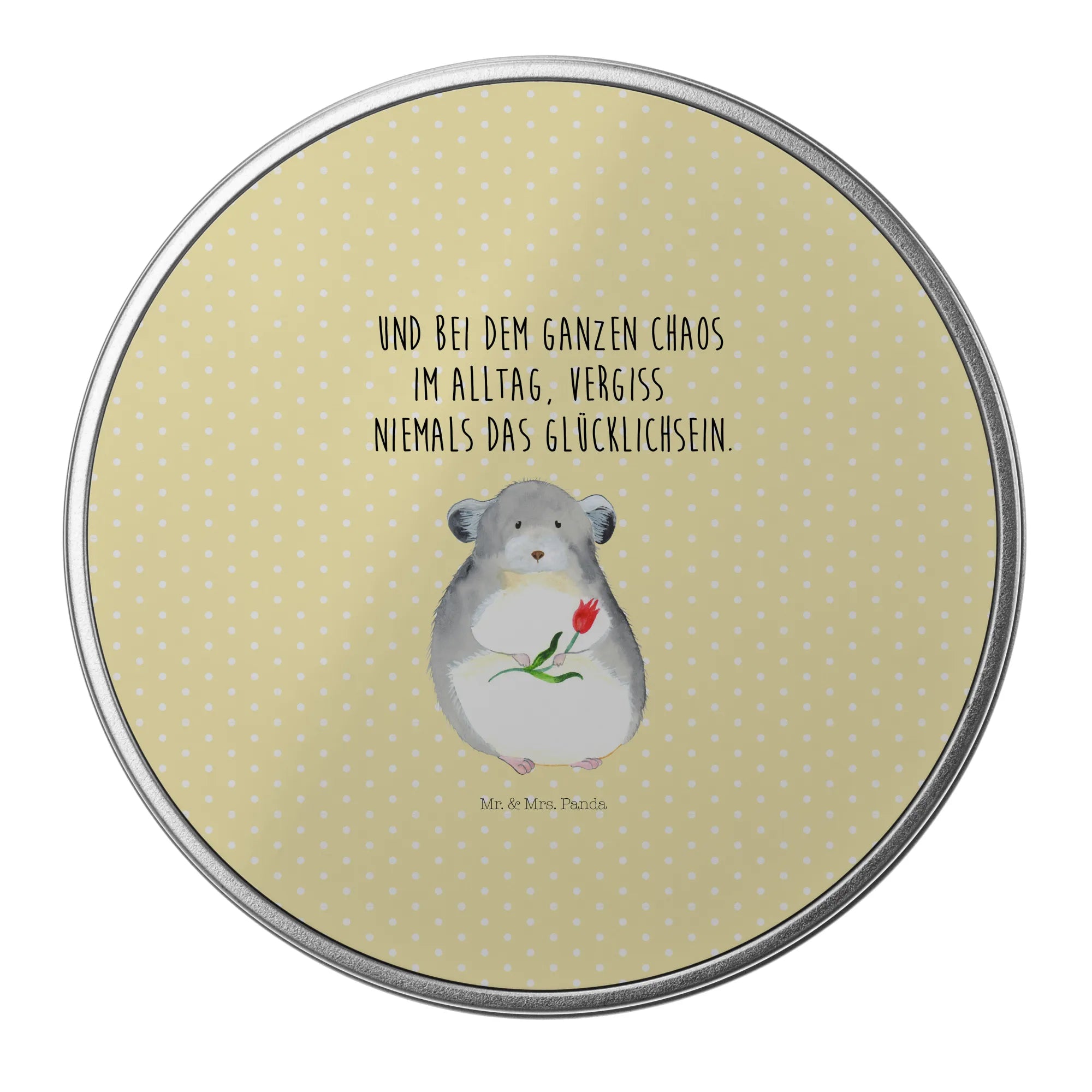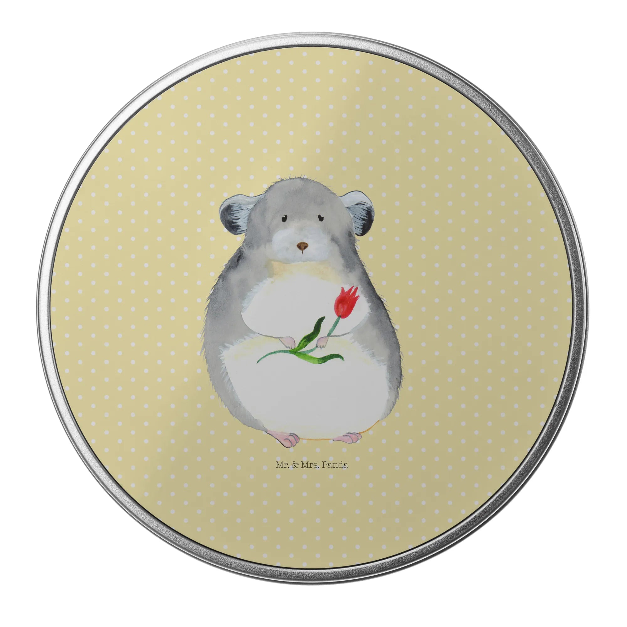 okrągła puszka z blachy szynszyla kwiat - z napisem