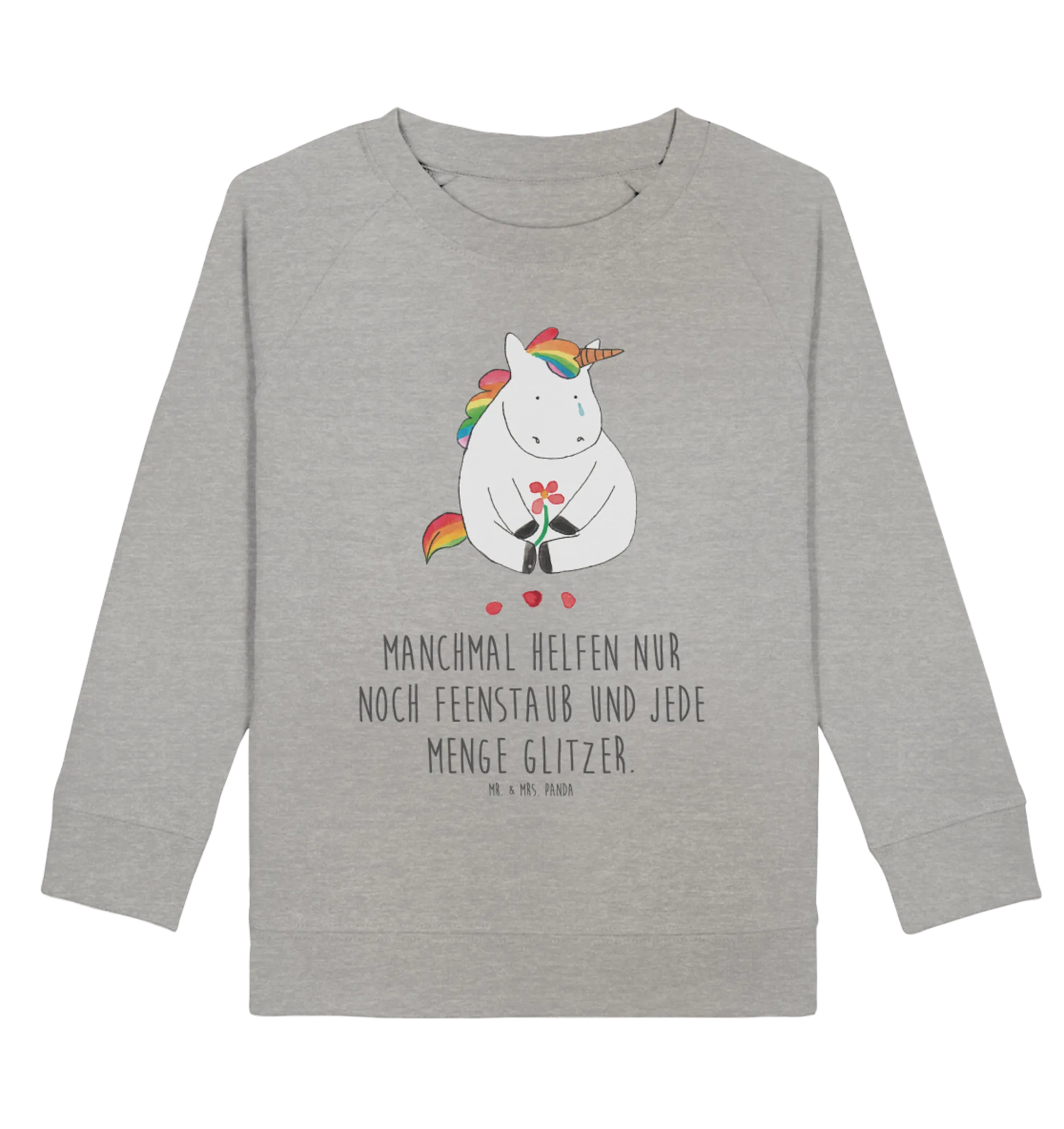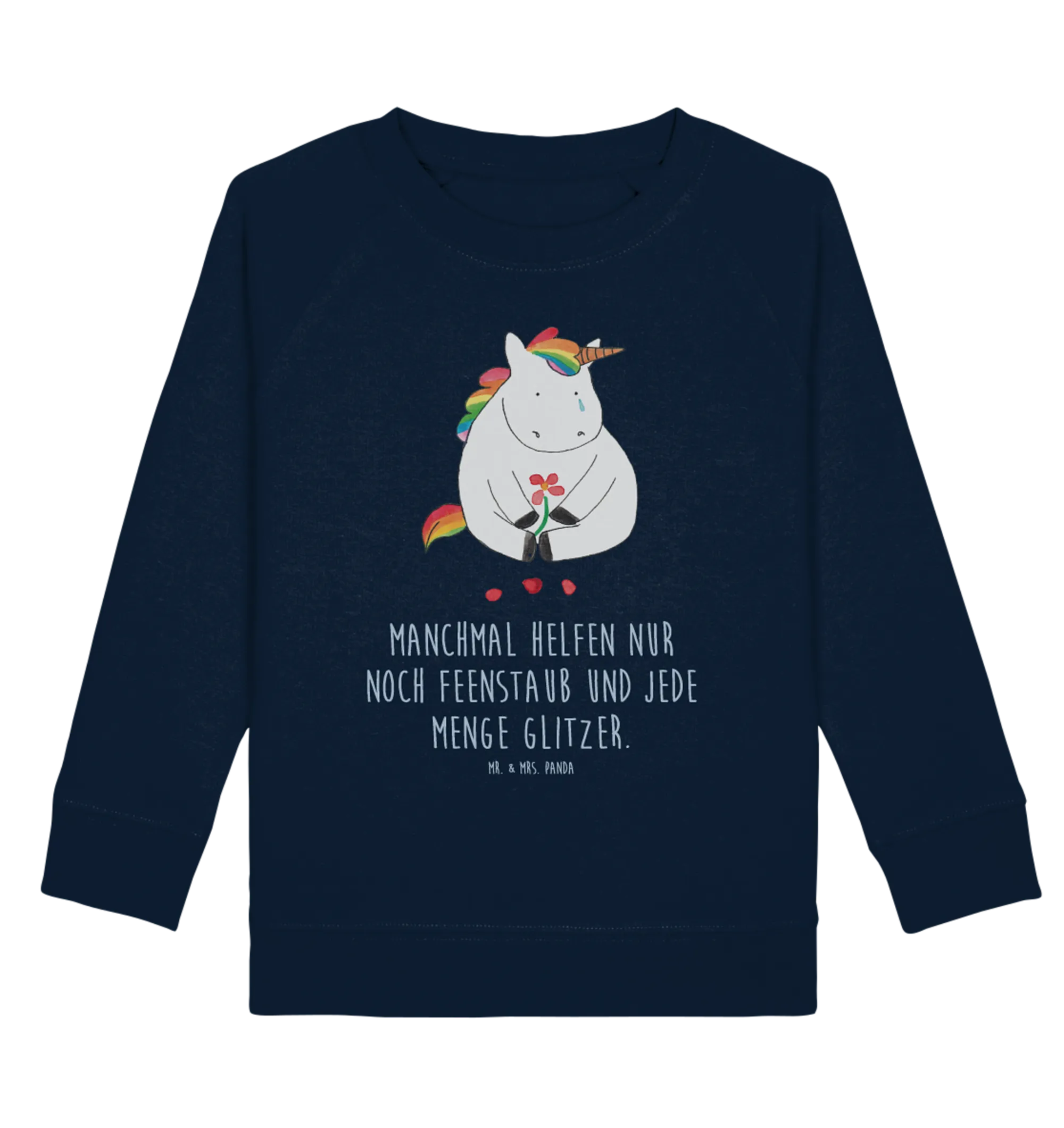 Entdecke den perfekten Organic Kinder Pullover mit dem bezaubernden Motiv eines traurigen Einhorns aus der liebevollen Einhorn-Kollektion von Mr. & Mrs. Panda!
