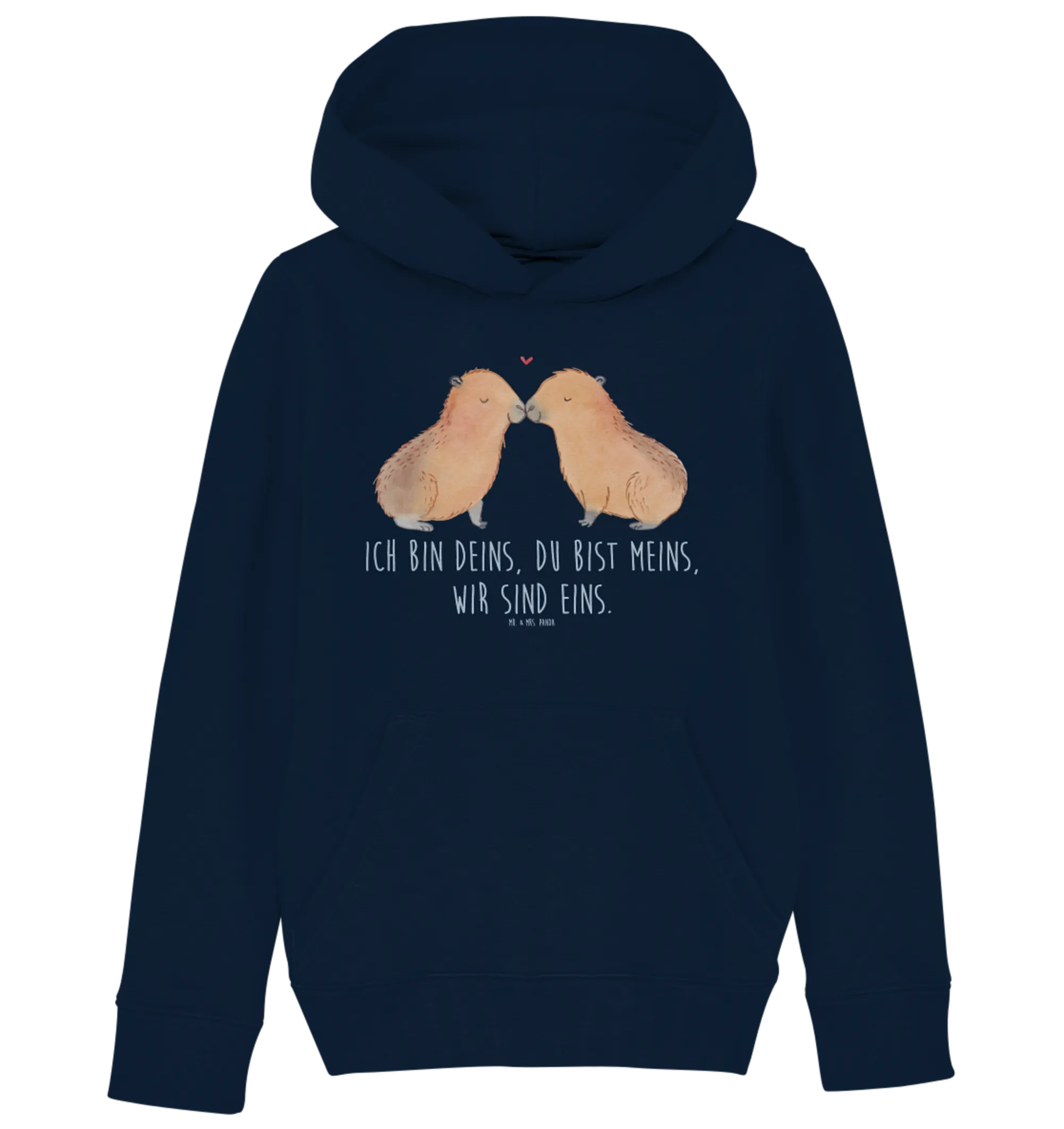 Der Hoodie ist aus hochwertiger, ökologischer Baumwolle gefertigt, die nicht nur angenehm zu tragen ist, sondern auch die Umwelt schont. Die sanften Brauntöne des Motivs harmonieren perfekt mit dem schlichten, aber eleganten French Navy Hintergrund des Hoodies. Das Motiv zeigt zwei niedliche Capybaras, die sich ganz nah sind und durch einen sanften Nasenkuss ihre Zuneigung zueinander ausdrücken. Über ihnen schwebt ein kleines rotes Herz, das die süße Botschaft von „Ich bin deins, du bist meins, wir sind eins“ perfekt unterstreicht. Dieses Motiv ist ideal für kleine Tierliebhaber und macht den Hoodie zu einem unverzichtbaren Kleidungsstück in jedem Kleiderschrank.