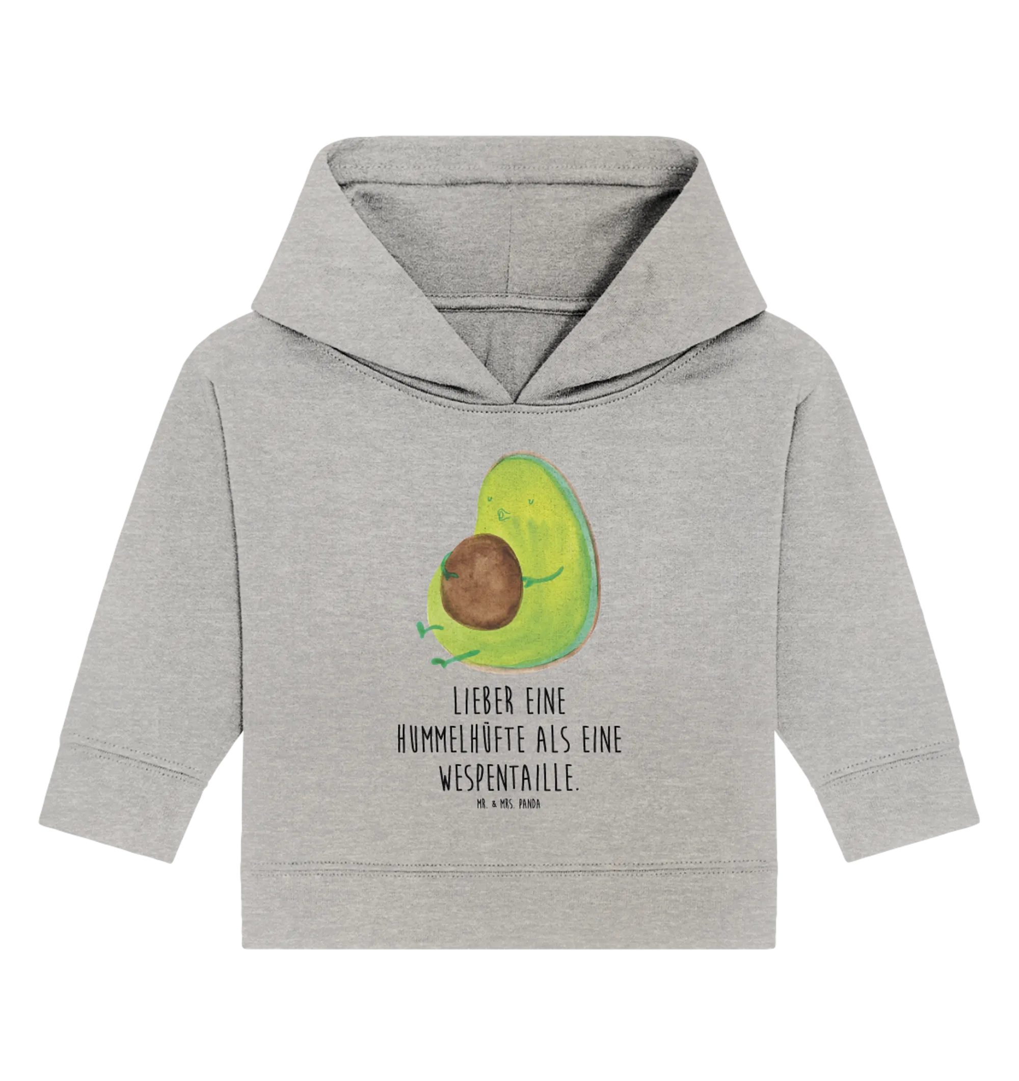 Die nachhaltige Herstellung und die liebevolle Gestaltung machen es zudem zu einer bewussten Wahl für umweltbewusste Eltern. Trage Dein Baby stolz in diesem trendigen Hoodie und teile die Botschaft: 'Lieber eine Hummelhüfte als eine Wespentaille' – ein humorvoller Spruch, der perfekt zur Avocado passt!