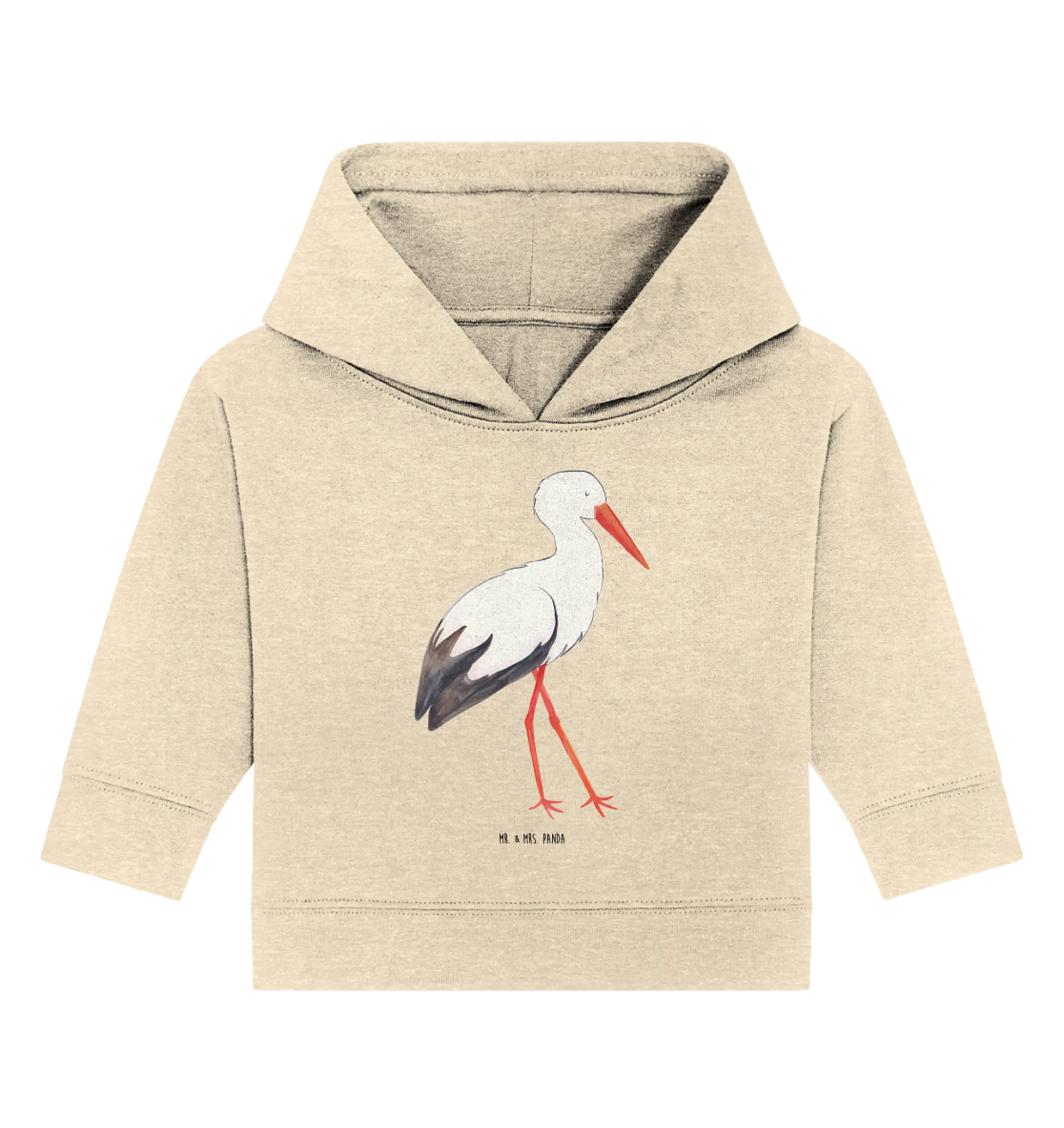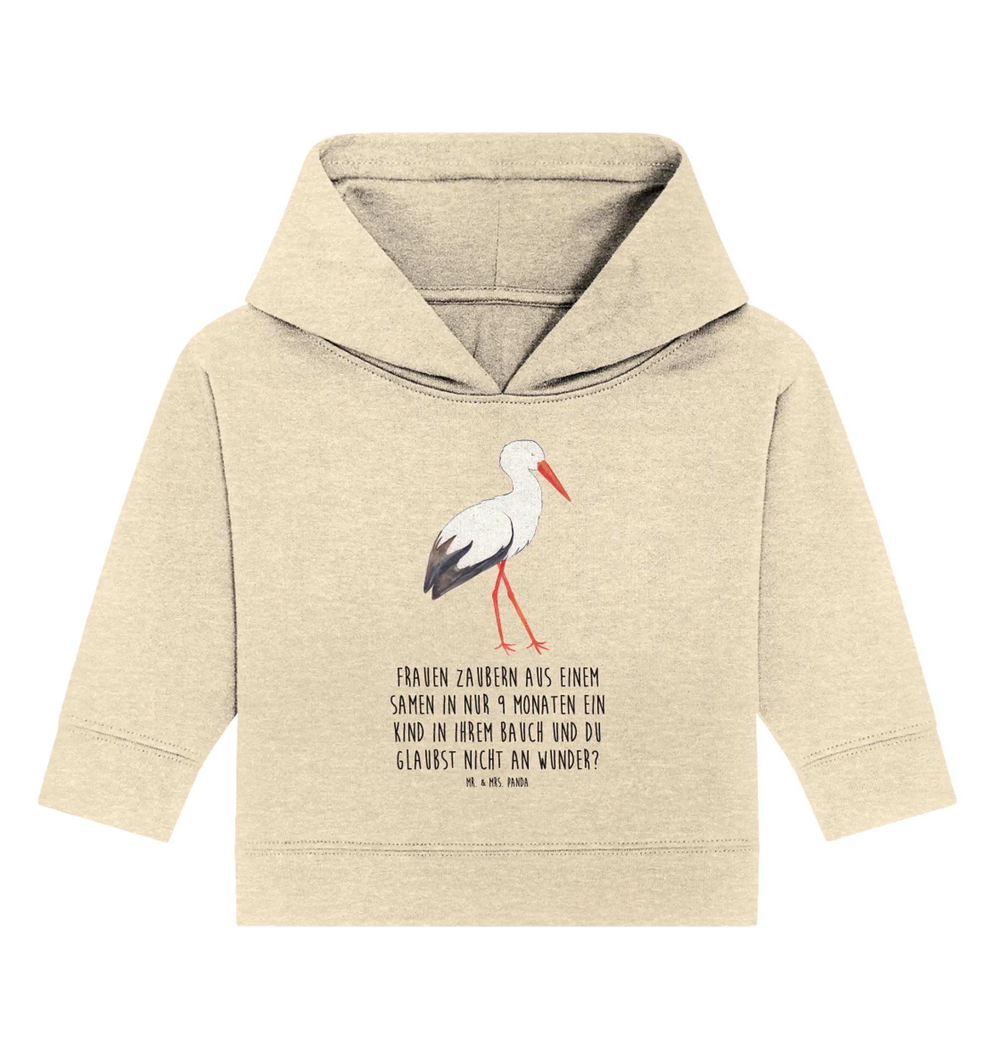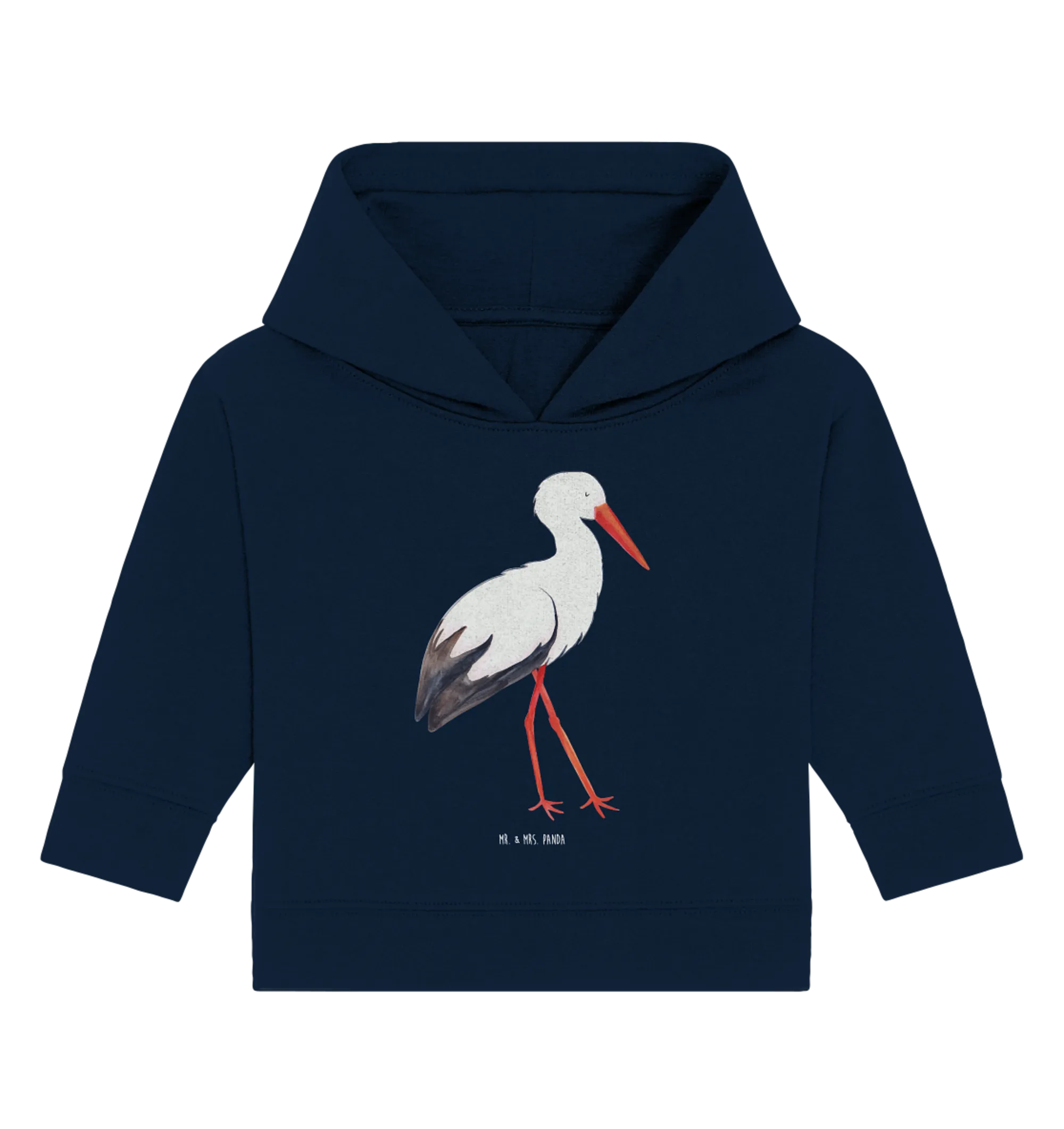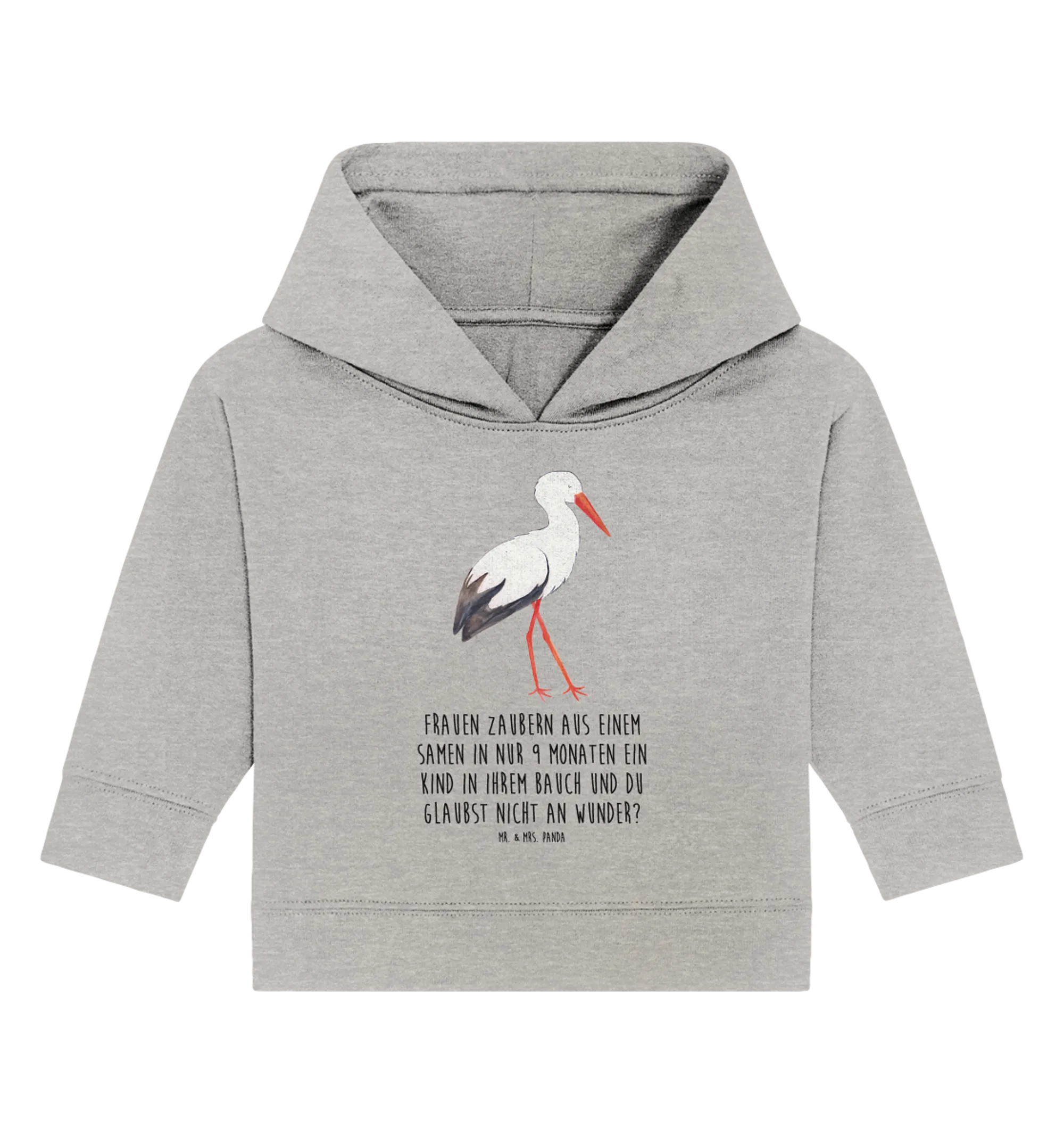 Hol Dir diesen ganz besonderen Organic Baby Hoodie mit dem Storch-Motiv und erfreue damit einen kleinen Sonnenschein und seine Eltern!