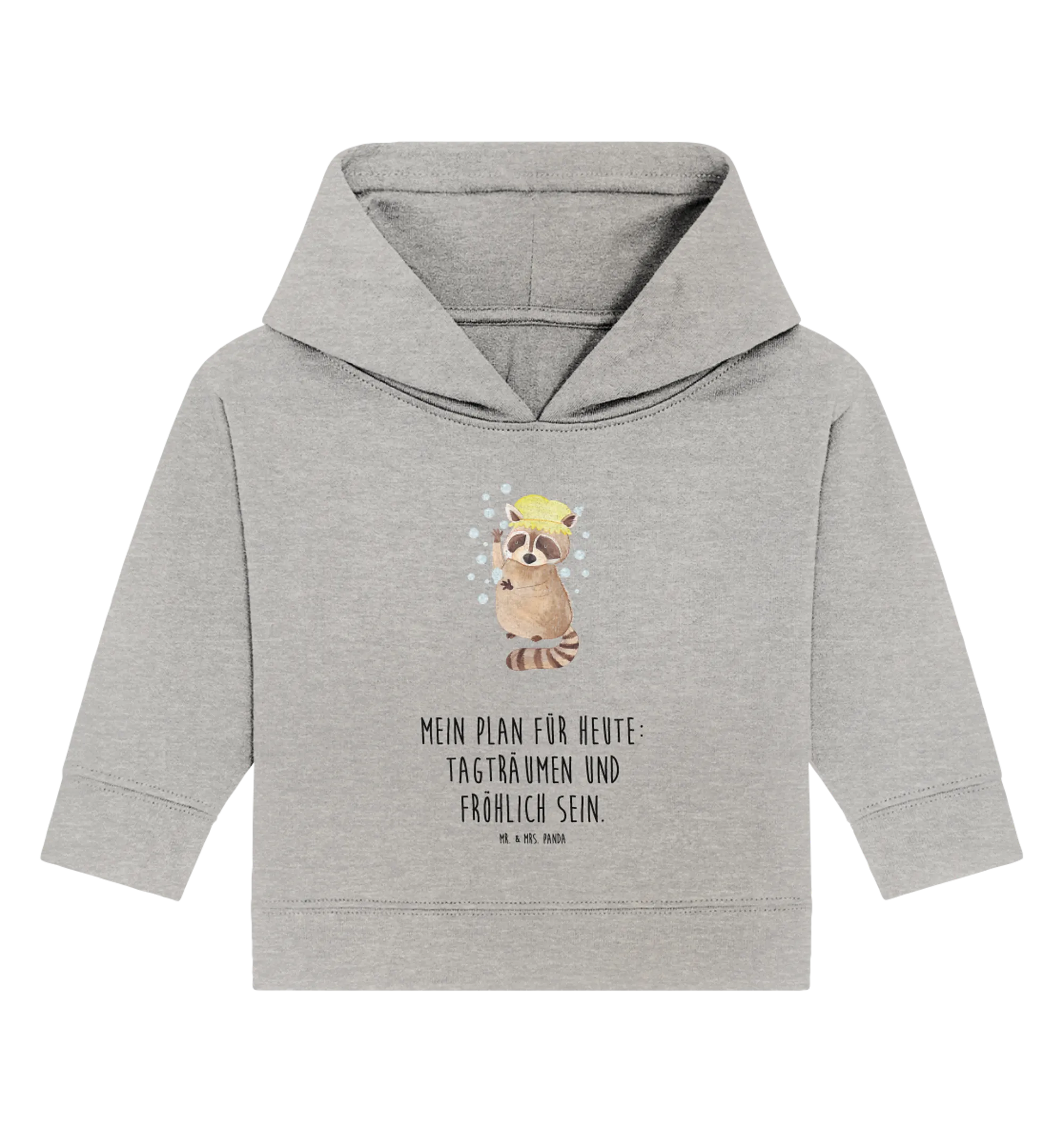 Der süße Waschbär bringt nicht nur gute Laune, sondern auch eine Portion Spaß in den Alltag deiner Kleinen. Das Design ist von Mrs. Panda liebevoll mit Aquarellfarben handgezeichnet worden und strahlt eine fröhliche Energie aus, die jedes Kinderherz höher schlagen lässt. Der Slogan "Mein Plan für heute: Tagträumen und fröhlich sein" macht unseren Hoodie zu einem perfekten Begleiter für kleine Abenteurer.