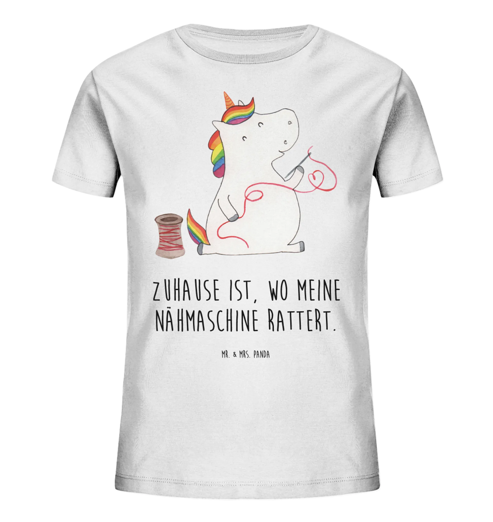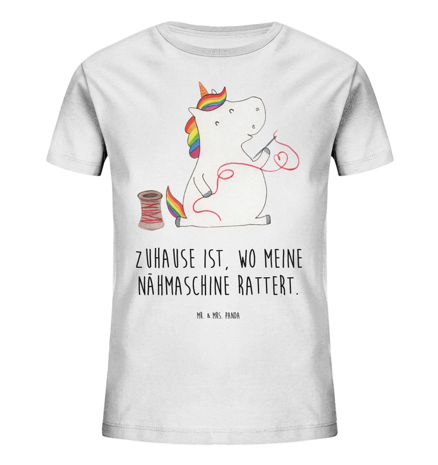 Die süßen Einhorn-Motive und der Slogan „Zuhause ist, wo meine Nähmaschine rattert“ sorgen dafür, dass sich jedes Kind in diesem T-Shirt wohlfühlt. Mit der liebevollen Gestaltung und den handgezeichneten Motiven von Mrs. Panda wird das Shirt zum absoluten Lieblingsstück.