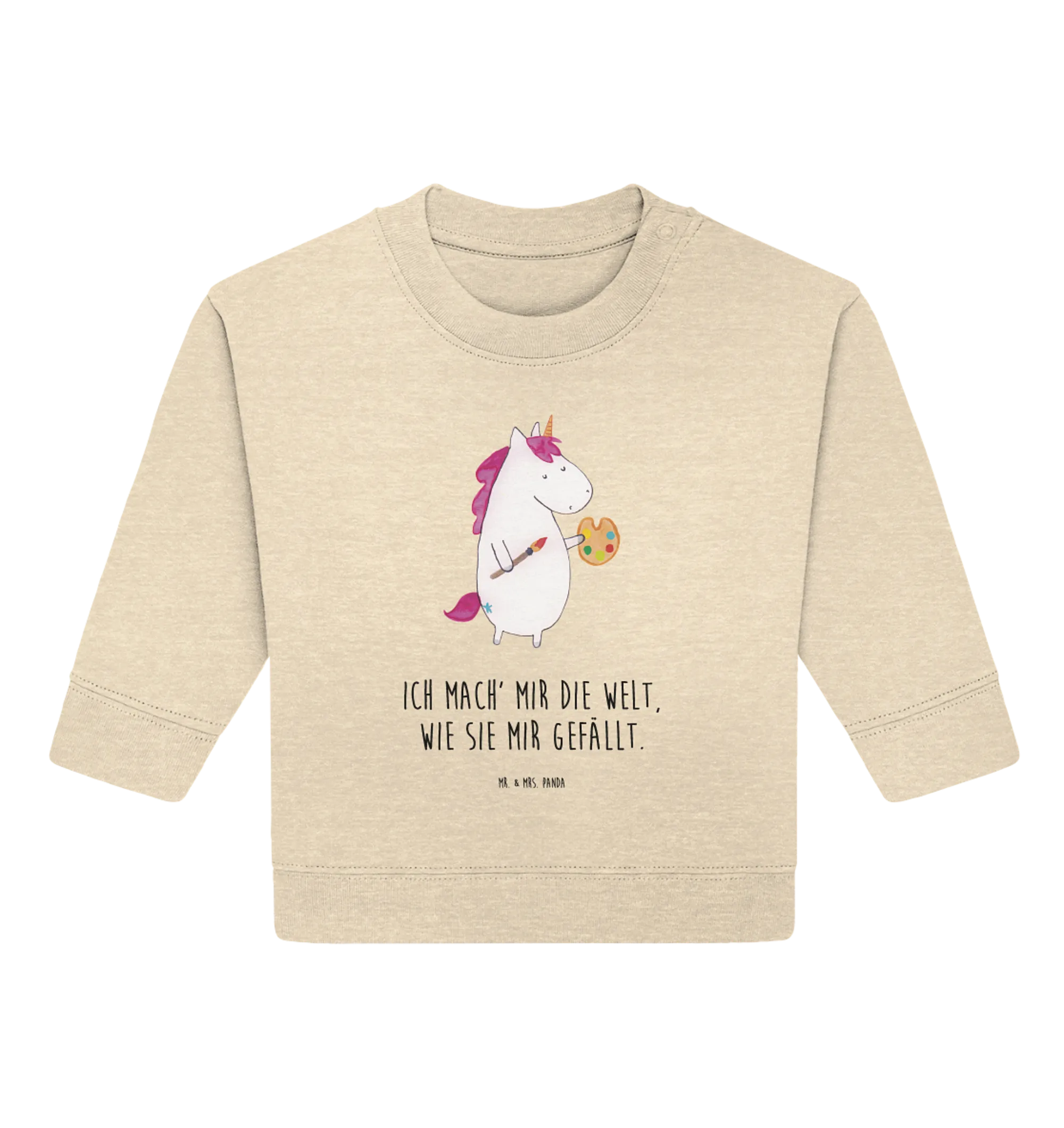 Entdecke den zauberhaften Organic Baby Pullover mit dem einzigartigen Einhorn Künstler Motiv aus der Einhorn Kollektion von Mr. & Mrs. Panda. Dieses niedliche Design zeigt ein entzückendes Einhorn, das an einer Staffelei zeichnet, umgeben von einer bunten Palette und vielen Farben. Perfekt für alle kleinen Kreativen und Kunstliebhaber!