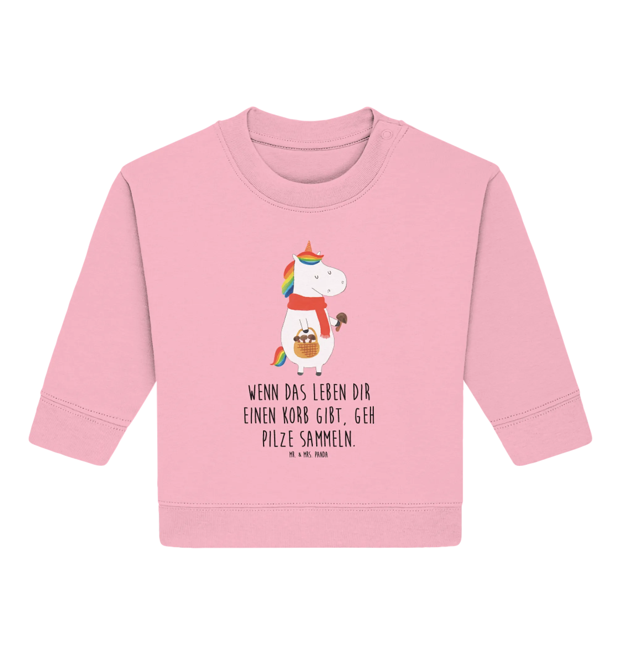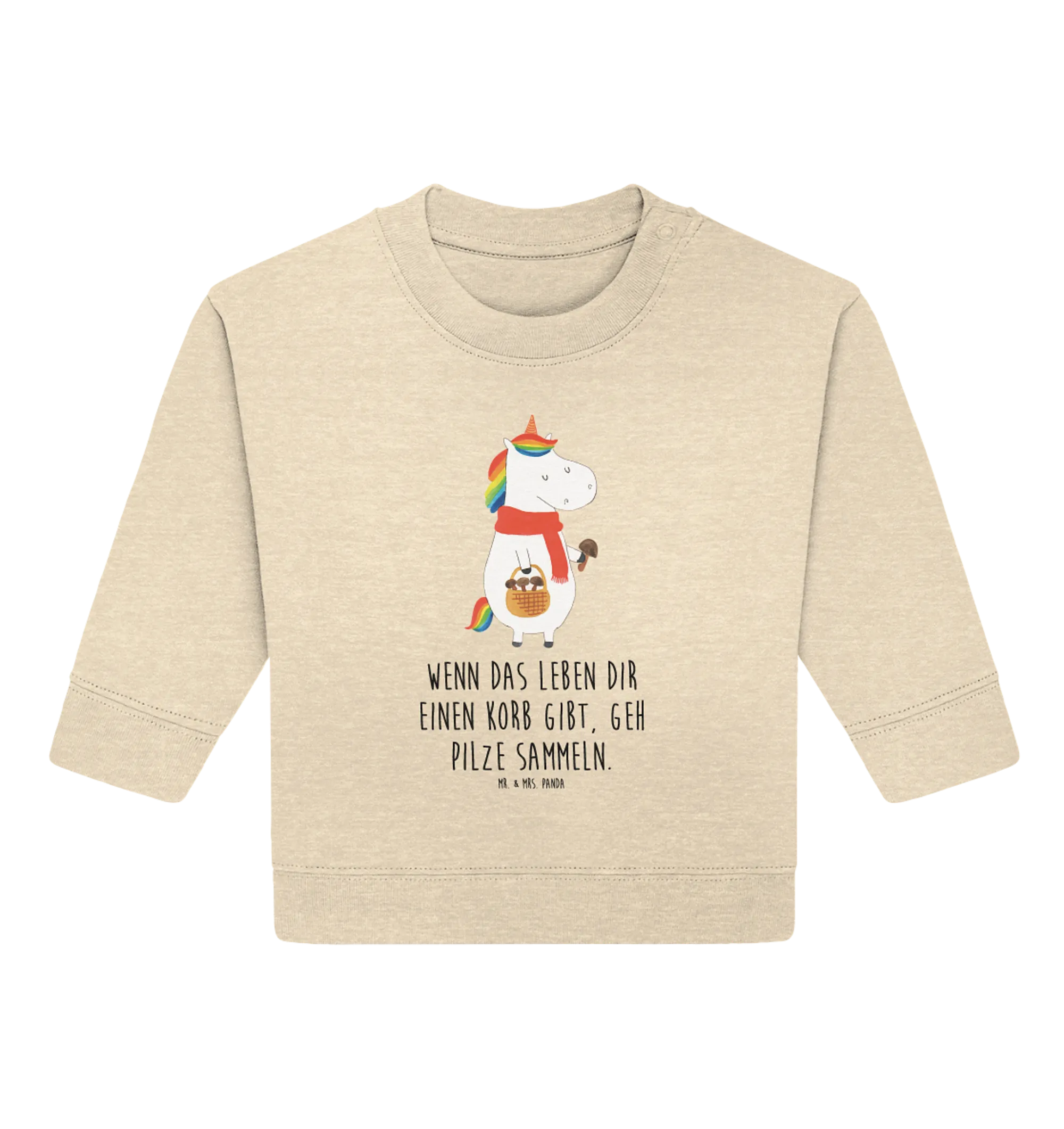 Die Einhorn-Motive sind ein echter Trend, und mit dem Spruch 'Wenn das Leben dir einen Korb gibt, geh Pilze sammeln' wird das Design noch einzigartiger. Auch ohne den Spruch bleibt der Pullover im Hochkant-Design ein absoluter Hingucker. Die Einhorn - Kollektion von Mr. & Mrs. Panda bietet dabei noch viele weitere Produkte, die Kinderaugen zum Strahlen bringen.