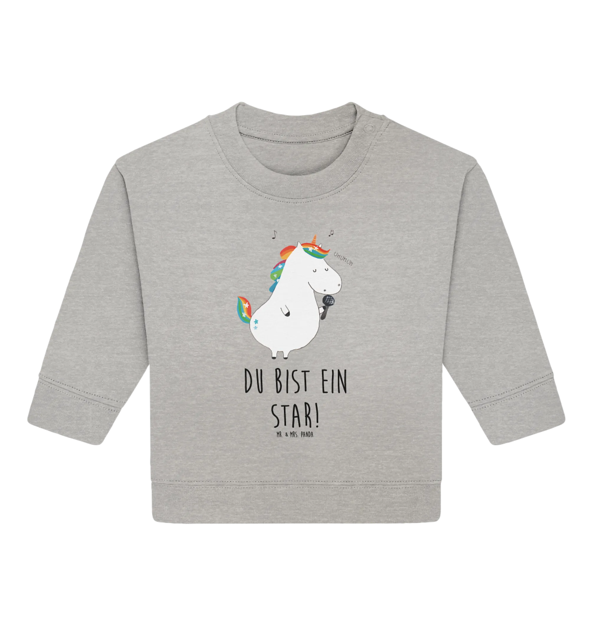 Der Organic Baby Pullover Einhorn Sänger aus der Einhorn-Kollektion von Mr. & Mrs. Panda ist das perfekte Geschenk für kleine Einhornfans! Mit diesem zuckersüßen Pullover bringst du jeden Kleinen zum Strahlen. Der Pullover zeigt ein handgezeichnetes Motiv, das ein liebevolles Einhorn darstellt, das in ein Mikrofon singt. Mit dem Motto "Du bist ein Star!" ermutigst du dein Kind, kreativ zu sein und an sich selbst zu glauben.