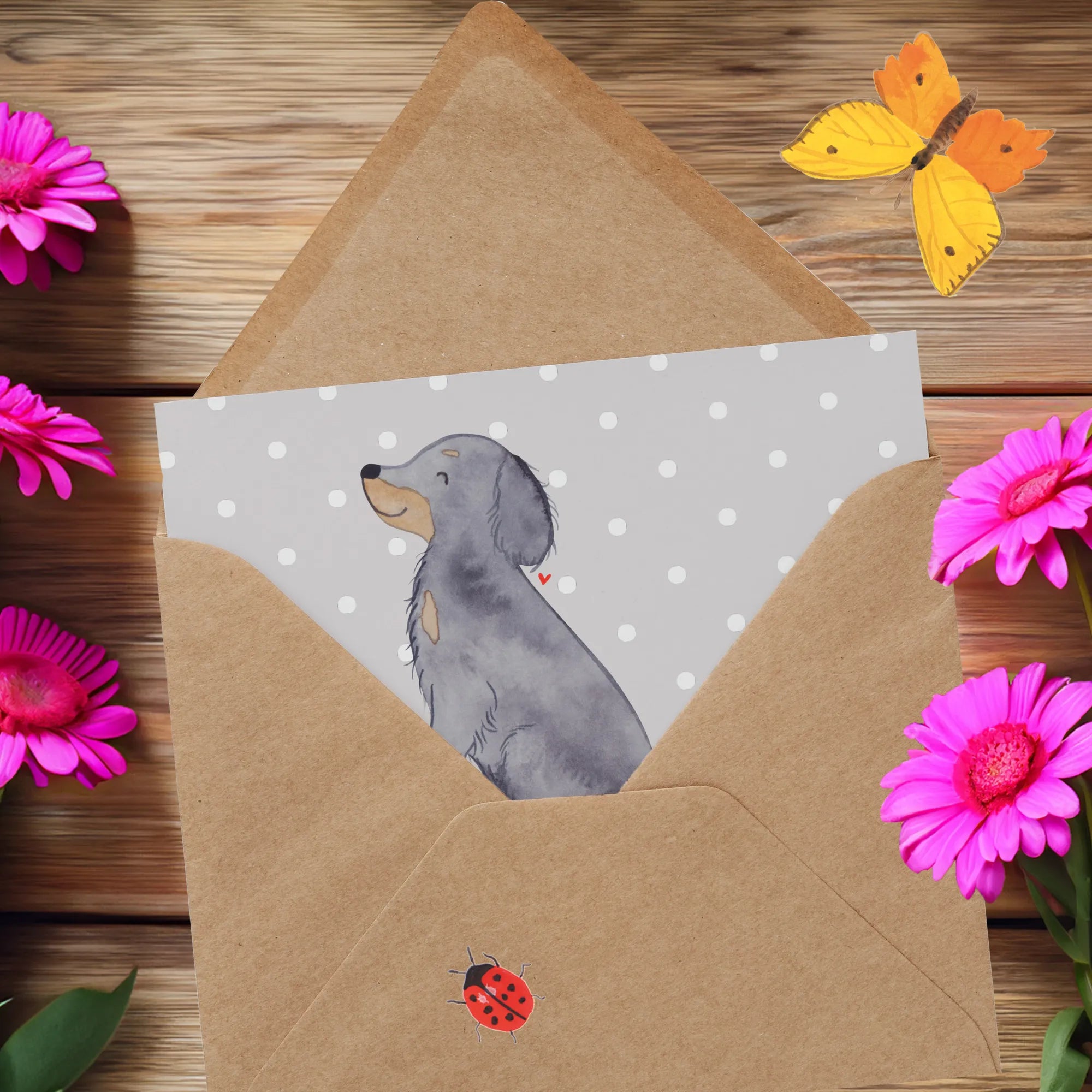 Das niedliche Motiv zeigt einen Gordon Setter in sanften Aquarelltönen, der liebevoll in die Höhe schaut. Mit dem Spruch "Mein Lebensretter ist ein Gordon Setter" bringt sie die besondere Verbindung zwischen Mensch und Hund zum Ausdruck. Neben der optischen Anziehungskraft ist die Karte auch praktisch, denn die innere matte Fläche eignet sich ideal für persönliche Nachrichten oder Glückwünsche. Du kannst die Karte ganz nach deinen Wünschen gestalten und sie wird mit einem edlen Umschlag geliefert.