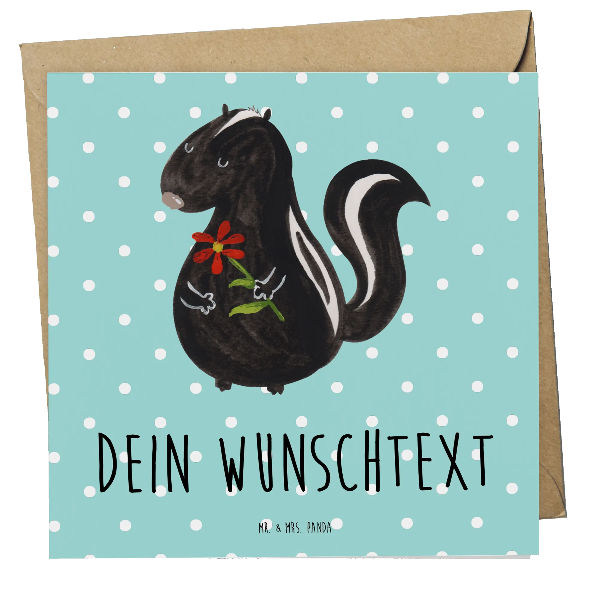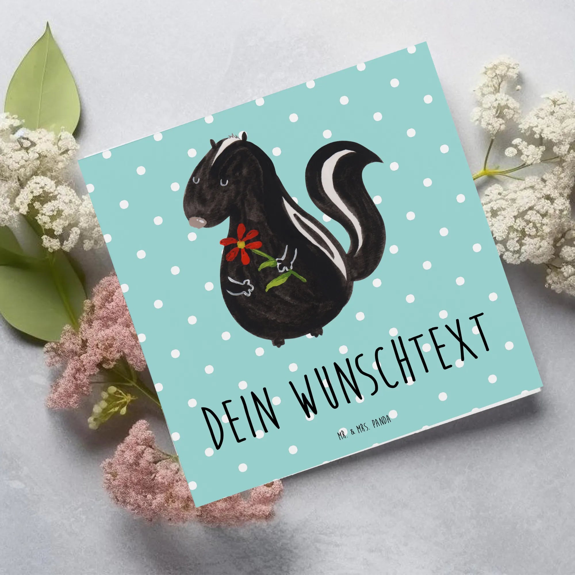 Die personalisierte Deluxe Karte "Stinktier Blume" aus der Stinktier-Kollektion von Mr. & Mrs. Panda ist der perfekte Weg, um Deine individuellen Grüße und Glückwünsche ganz besonders zu gestalten. Ob zum Geburtstag, zur Hochzeit oder zu festlichen Anlässen – diese wunderschöne quadratische Karte (140 mm x 140 mm) bietet Dir die Möglichkeit, Deine persönliche Note zu setzen.