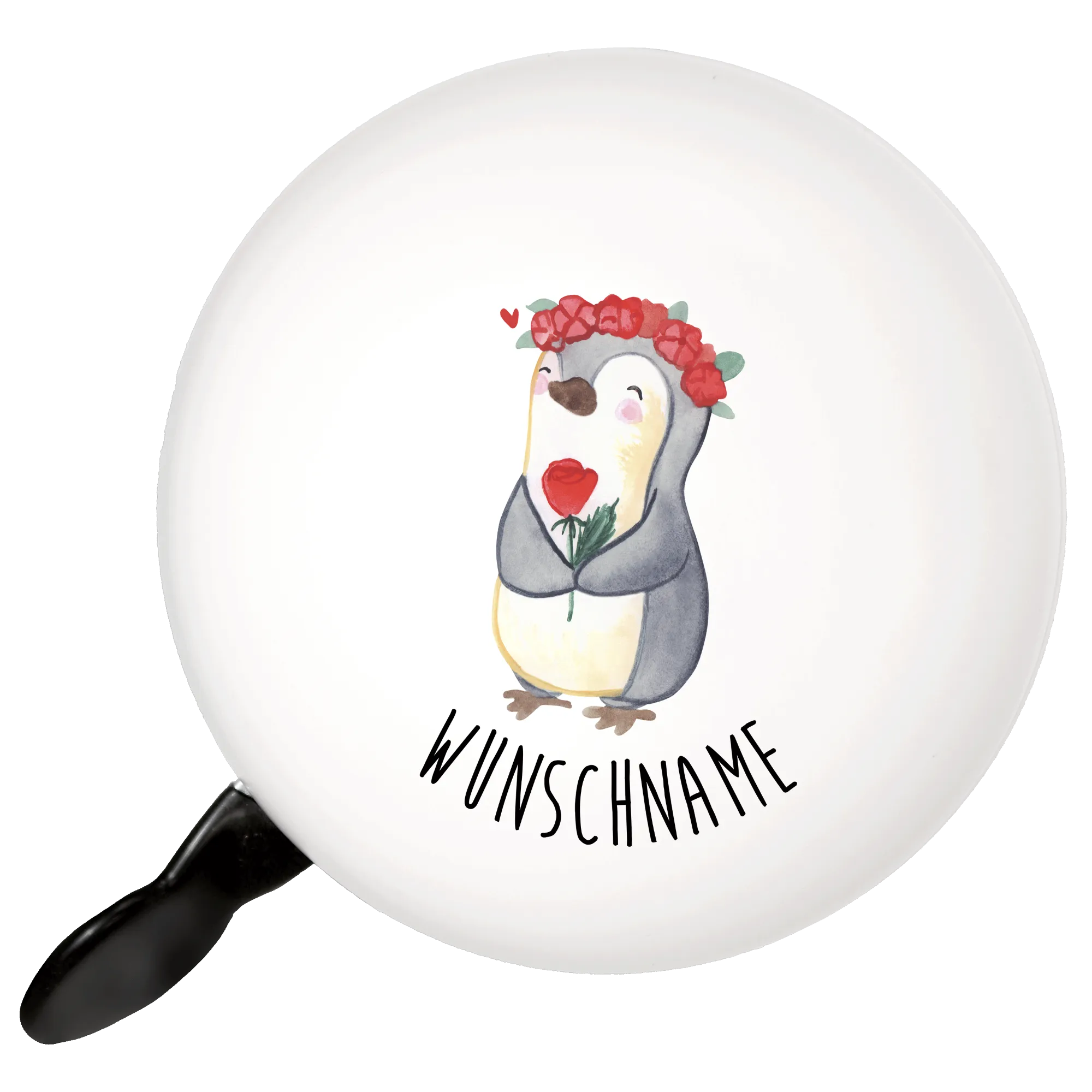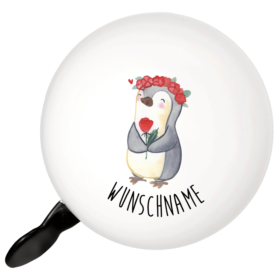 Mit einem Durchmesser von 120 mm und einem angenehmen Klang sind diese Klingeln nicht nur funktional, sondern auch ein echter Hingucker. Die niedliche Zeichnung eines Pinguins mit einem Blumenkranz und einer roten Rose in der Flosse bringt Farbe und Freude in jeden Fahrradausflug.