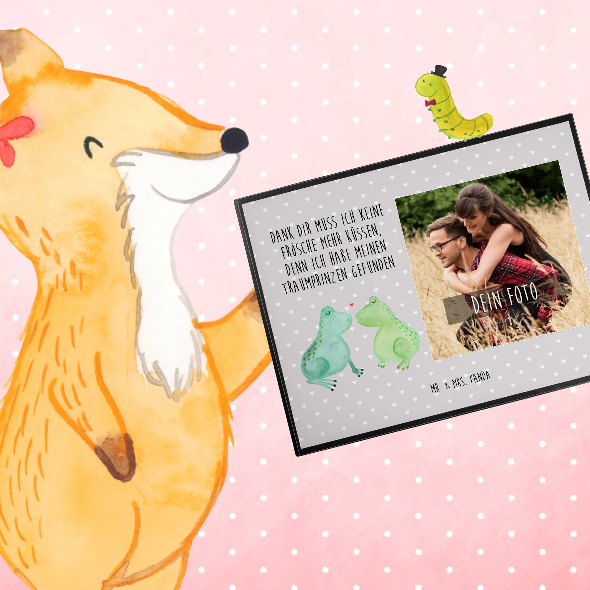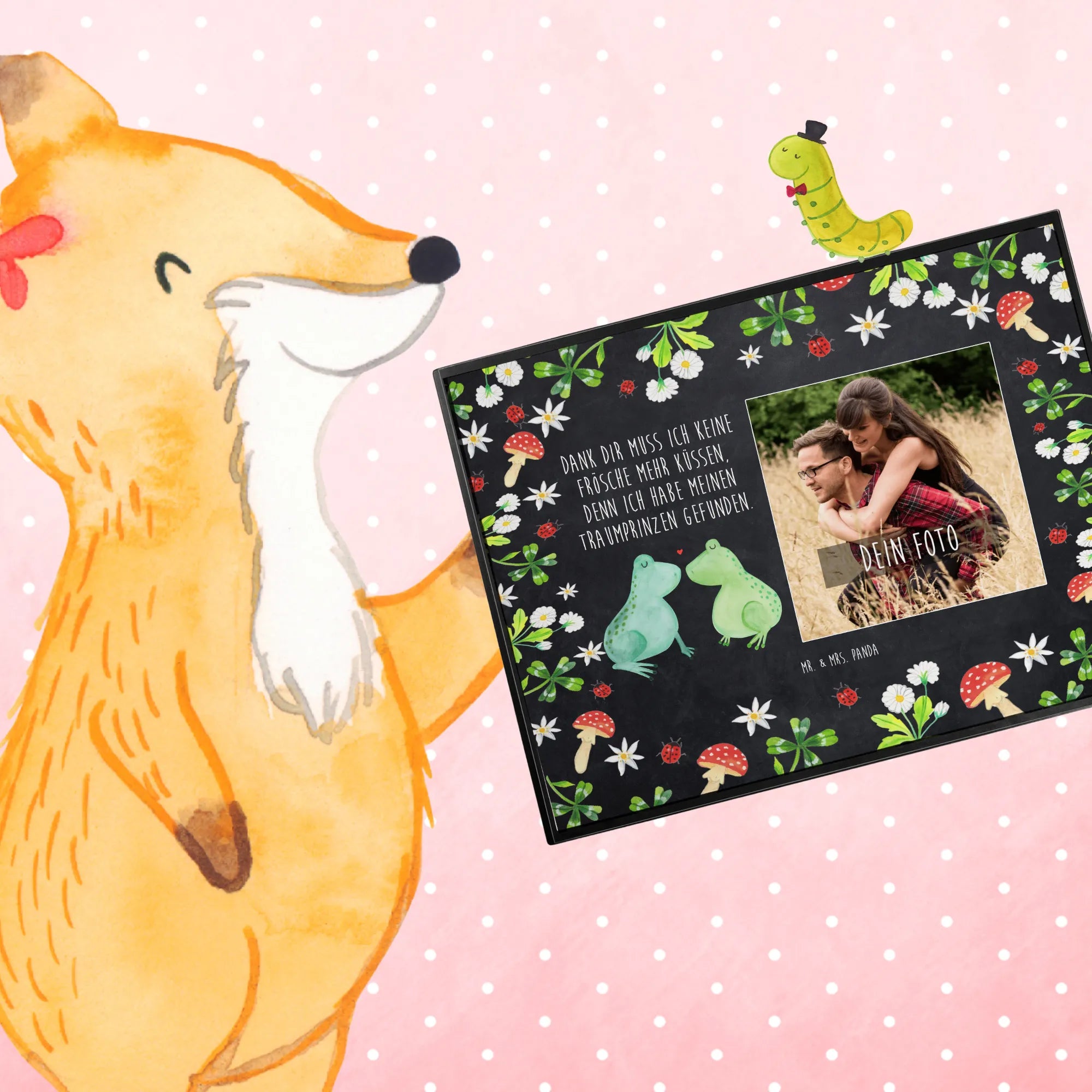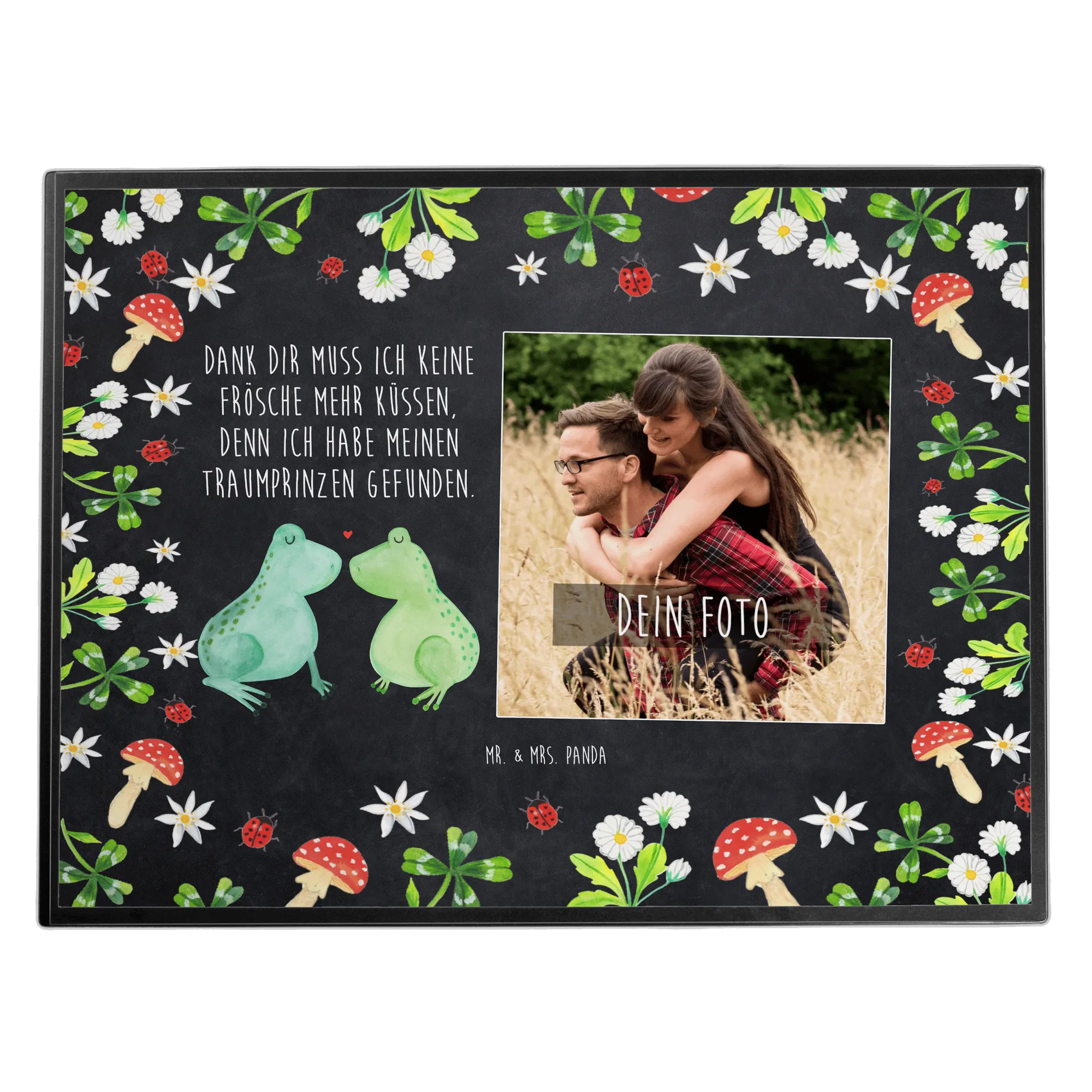 Die personalisierte Foto Schreibtischunterlage "Frosch Liebe" von Mr. & Mrs. Panda ist das perfekte Geschenk für alle Verliebten! Ob zum Jahrestag, zur Verlobung oder einfach nur als süße Geste – diese Schreibtischunterlage vereint Funktionalität und Liebe auf eine ganz besondere Art.