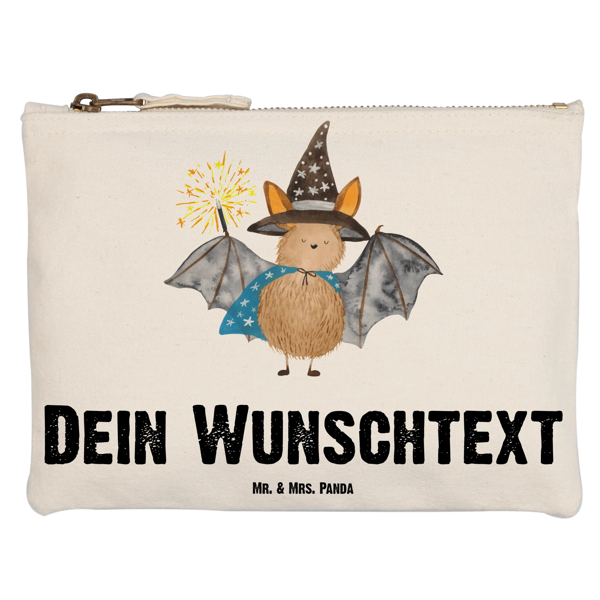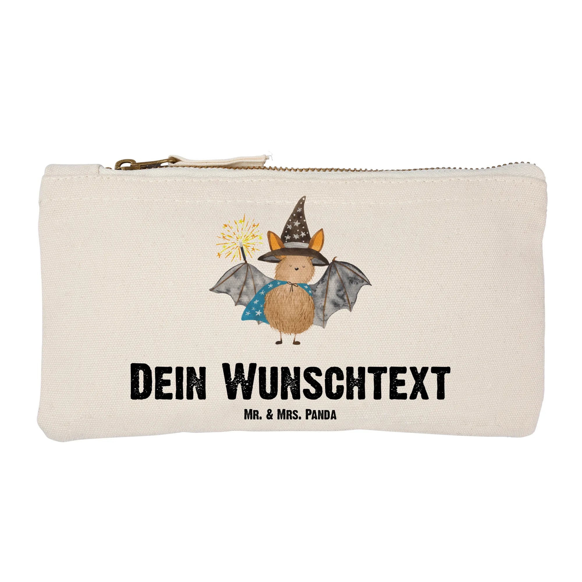 Entdecke die perfekte personalisierte Schminktasche mit dem süßen Motiv des Fledermaus Zauberers aus der Small World Kollektion von Mr. & Mrs. Panda!