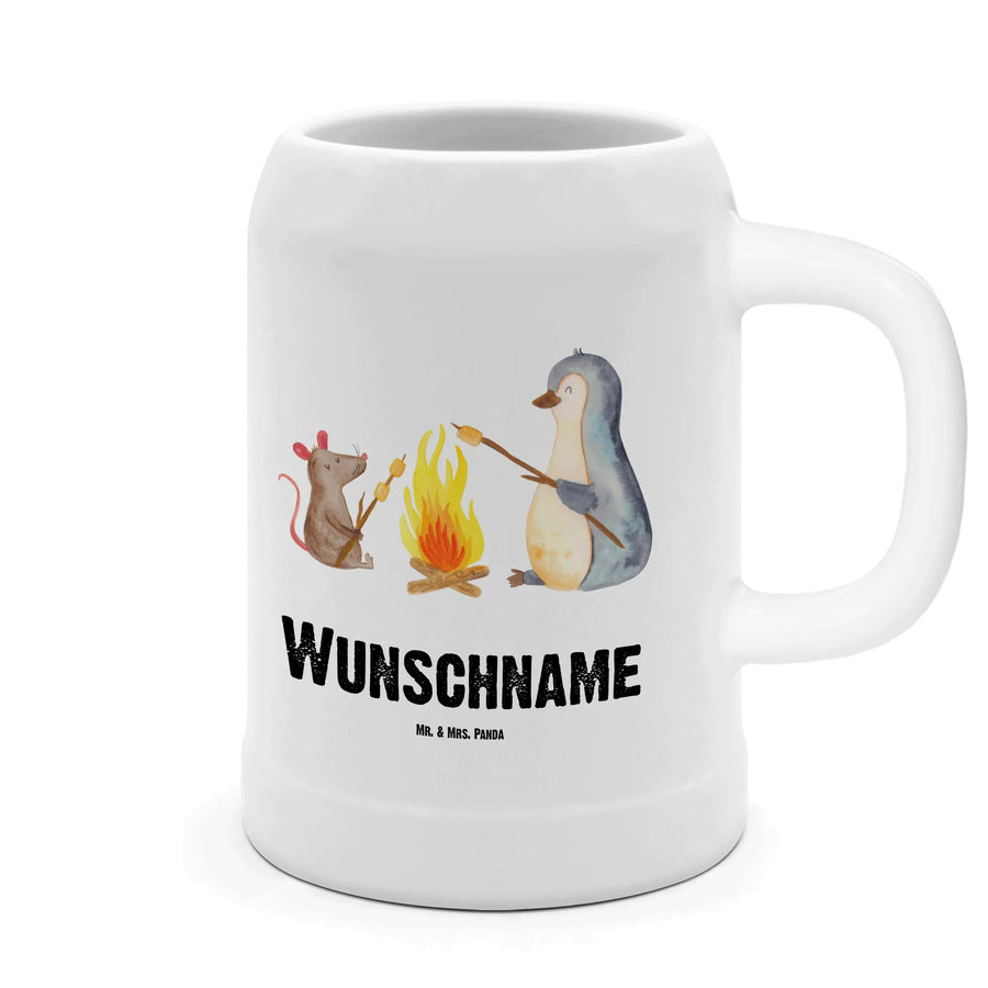 Personalisierter Bierkrug Pinguin Lagerfeuer