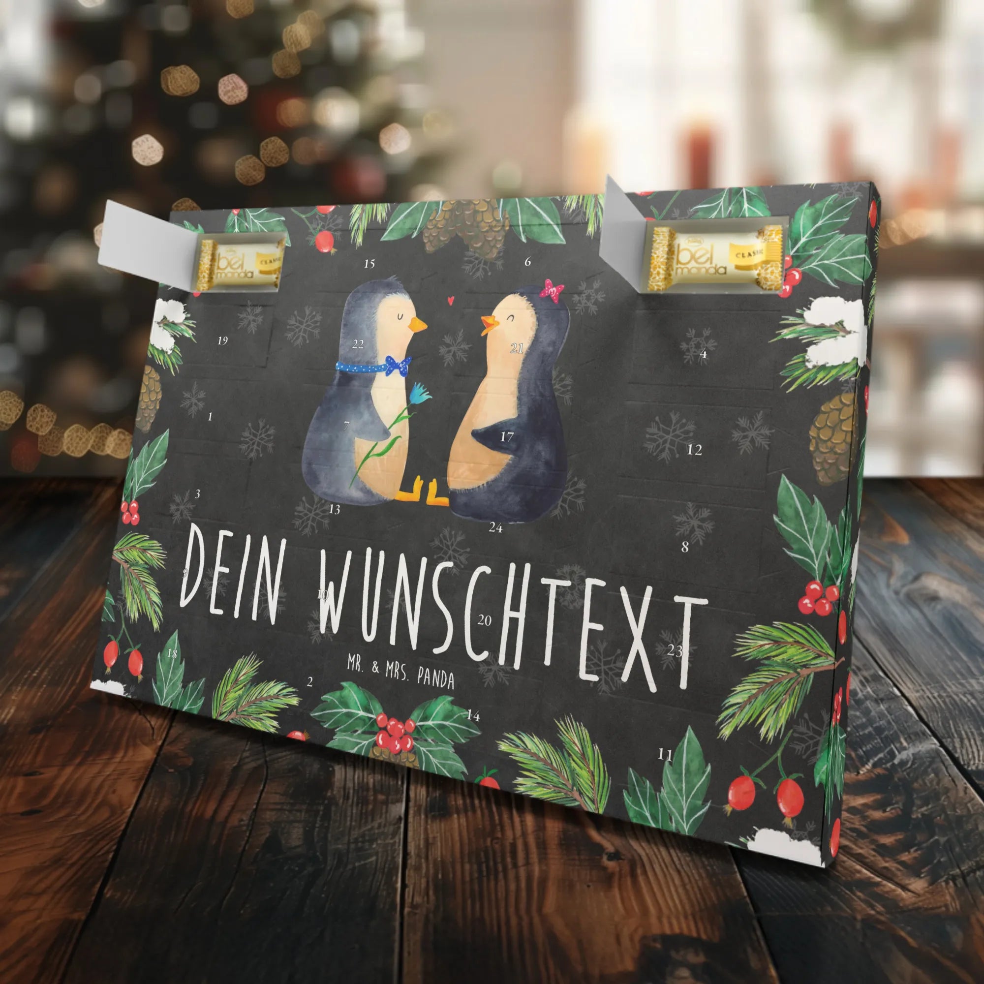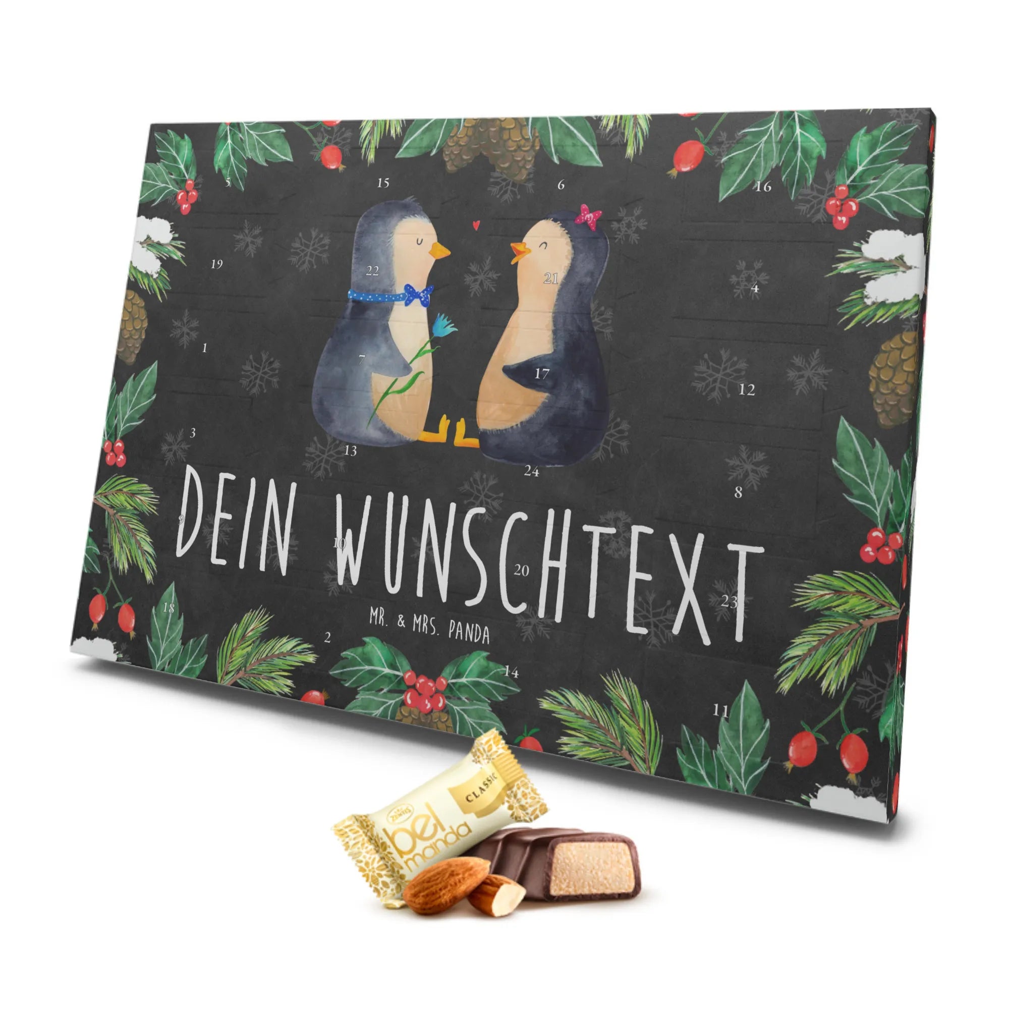 Der personalisierte Marzipan Adventskalender in Form eines süßen Pinguin Pärchens von Mr. & Mrs. Panda ist das perfekte Geschenk für alle, die Liebe und Zuneigung ausdrücken möchten. Wenn du nach einem originellen und bedeutungsvollen Adventskalender suchst, dann ist dieser genau das Richtige für dich!
