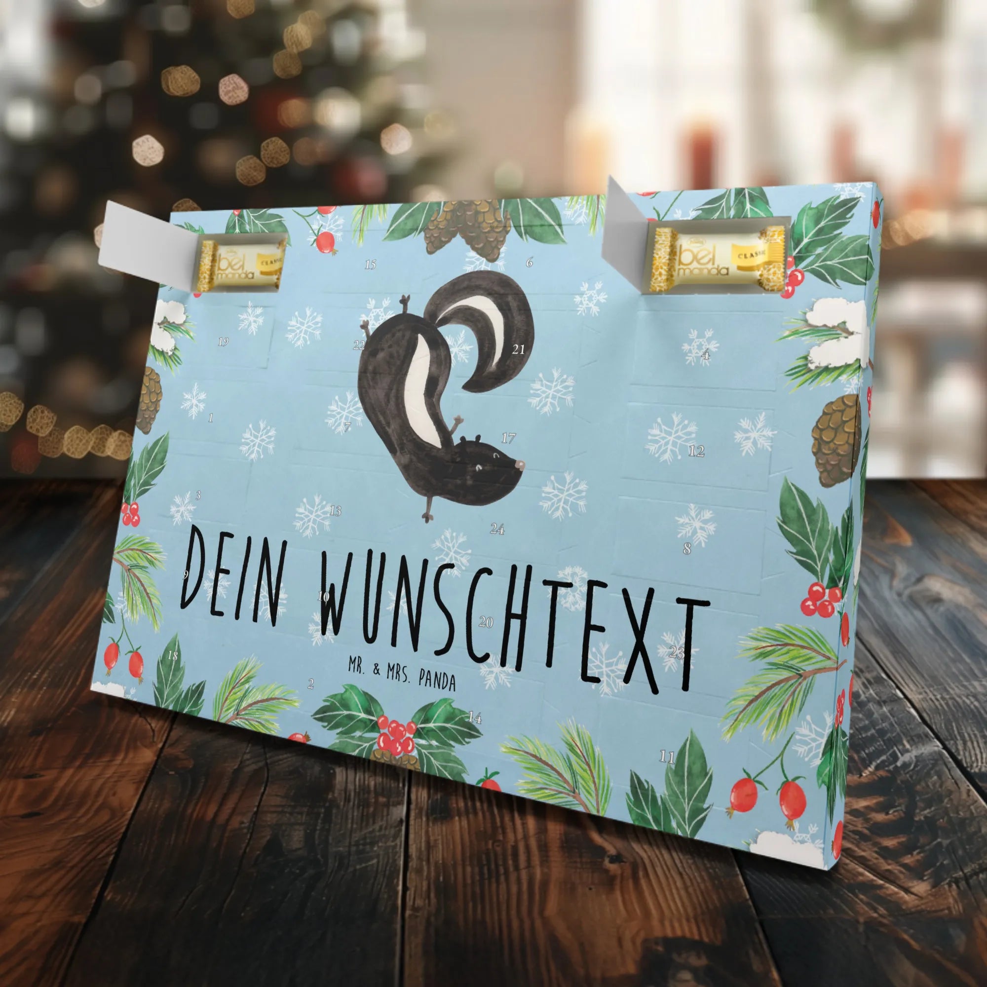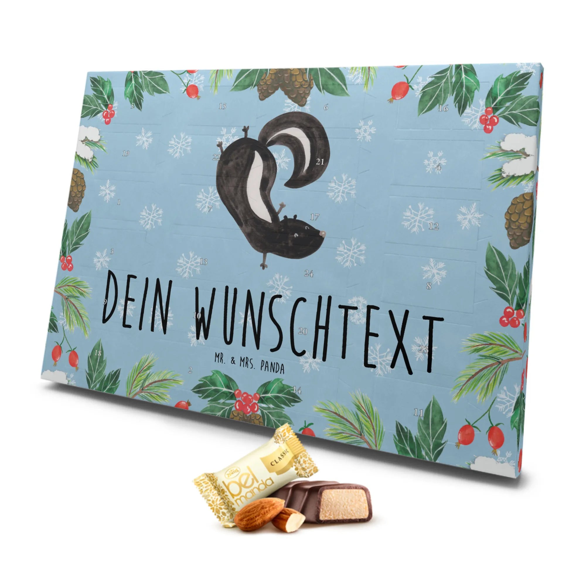 Der personalisierte Marzipan Adventskalender mit dem süßen Stinktier Handstand Motiv von Mr. & Mrs. Panda ist das perfekte Geschenk für alle, die Tiere und Naschwerk lieben! Mit seinem charmanten Design wirst du nicht nur Kinderaugen zum Strahlen bringen, sondern auch Erwachsene begeistern.