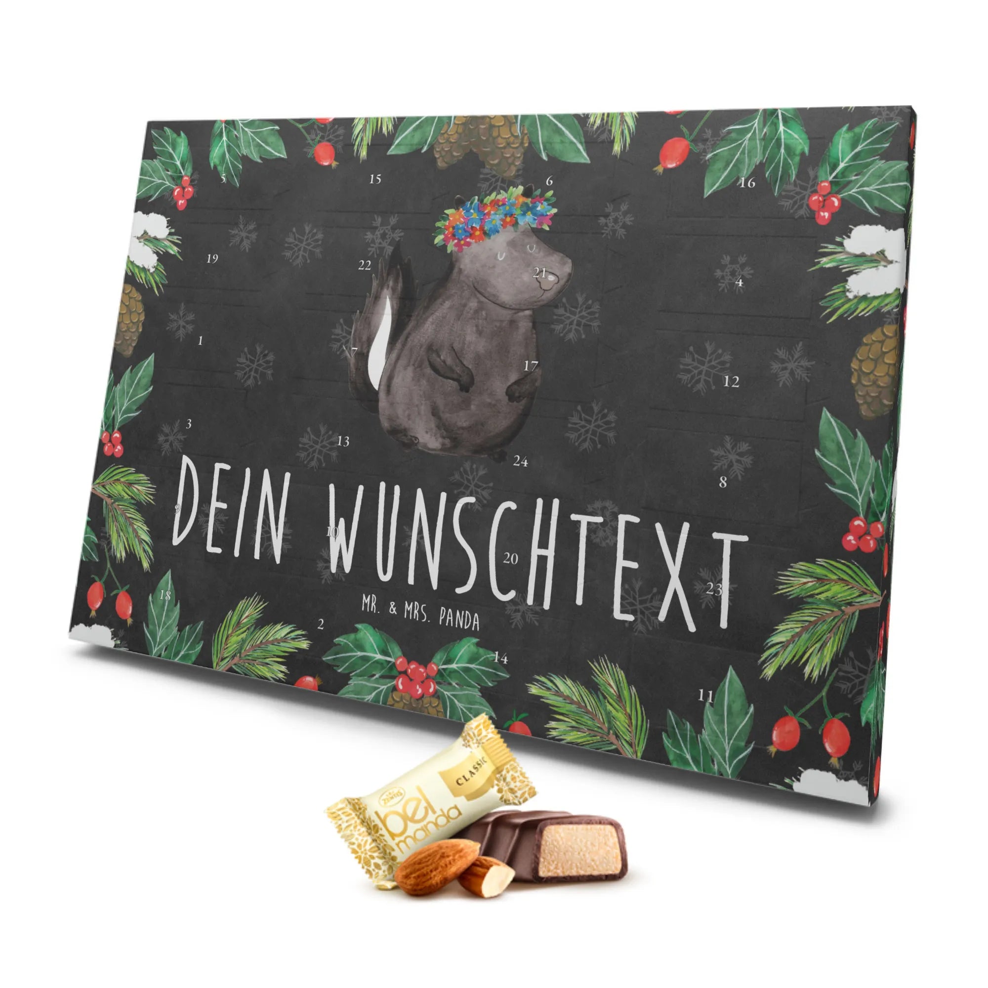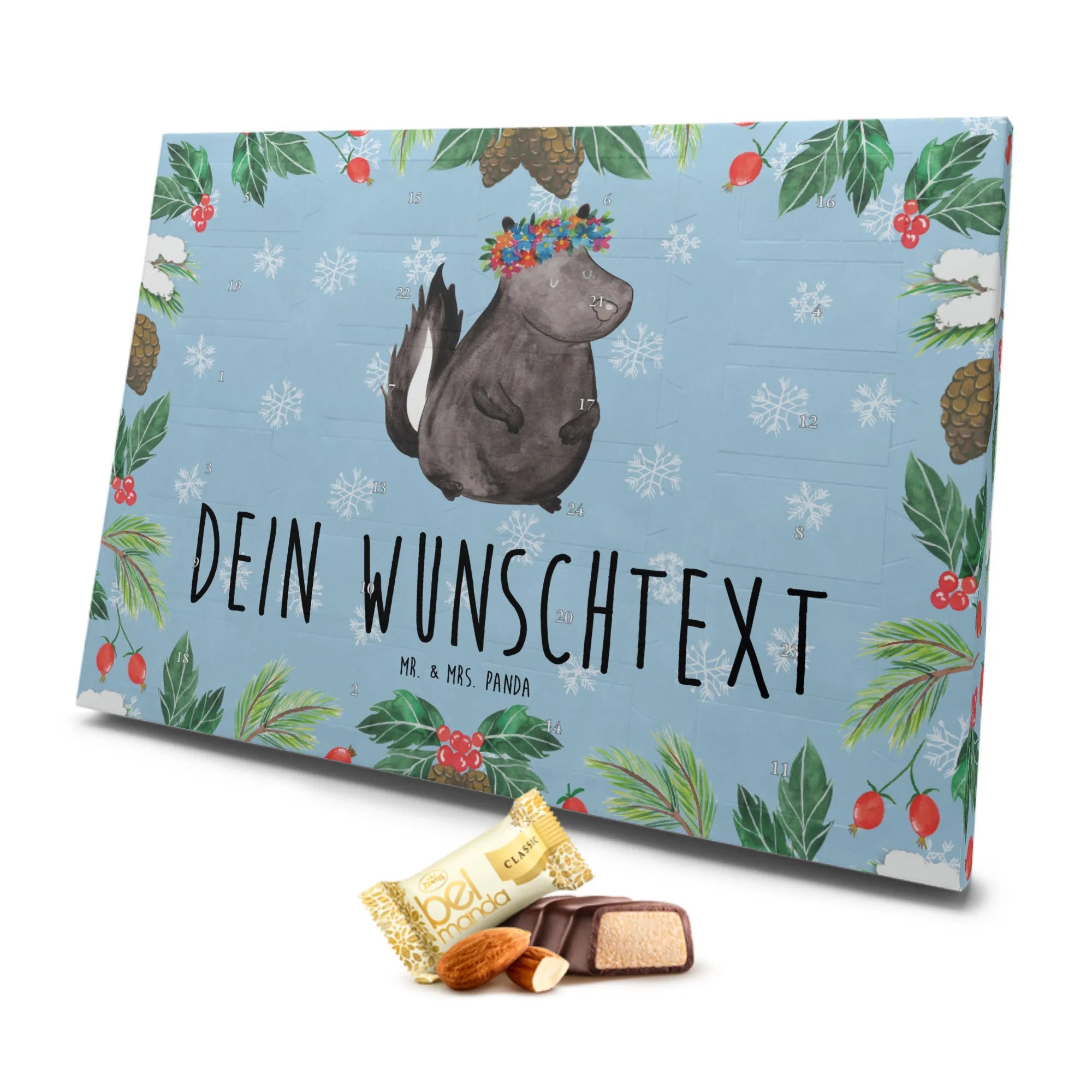 Der personalisierte Marzipan Adventskalender mit dem süßen Stinktier Blumenmädchen-Motiv von Mr. & Mrs. Panda ist der perfekte Begleiter in der Adventszeit. Gefüllt mit 24 einzelnen, handverlesenen Edelmarzipan-Pralinen wird jeder Tag zu einem besonderen Erlebnis. Das besondere Motiv des Stinktiers, das mit einem bunten Blumenkranz geschmückt ist, zaubert allzeit ein Lächeln in dein Gesicht. Die Kombination aus dem leckeren Marzipan und dem verspielten Design macht diesen Adventskalender zu einem idealen Geschenk für deine Liebsten.