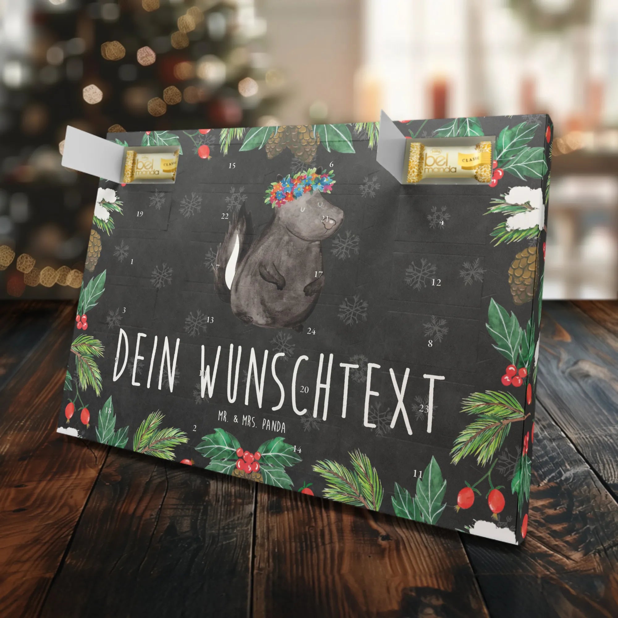 Der personalisierte Marzipan Adventskalender "Stinktier Blumenmädchen" von Mr. & Mrs. Panda ist das perfekte Geschenk für alle, die die Vorfreude auf Weihnachten und die bunten, zauberhaften Naturmotive lieben. Mit seinem einzigartigen Design, das ein süßes Stinktier mit einem farbenfrohen Blumenkranz zeigt, bringt dieser Adventskalender Freude und gute Laune in die kalte Jahreszeit. Die Kombination aus köstlichem Edelmarzipan und einer ansprechenden Gestaltung macht ihn zu einem ganz besonderen Begleiter für die Adventszeit.