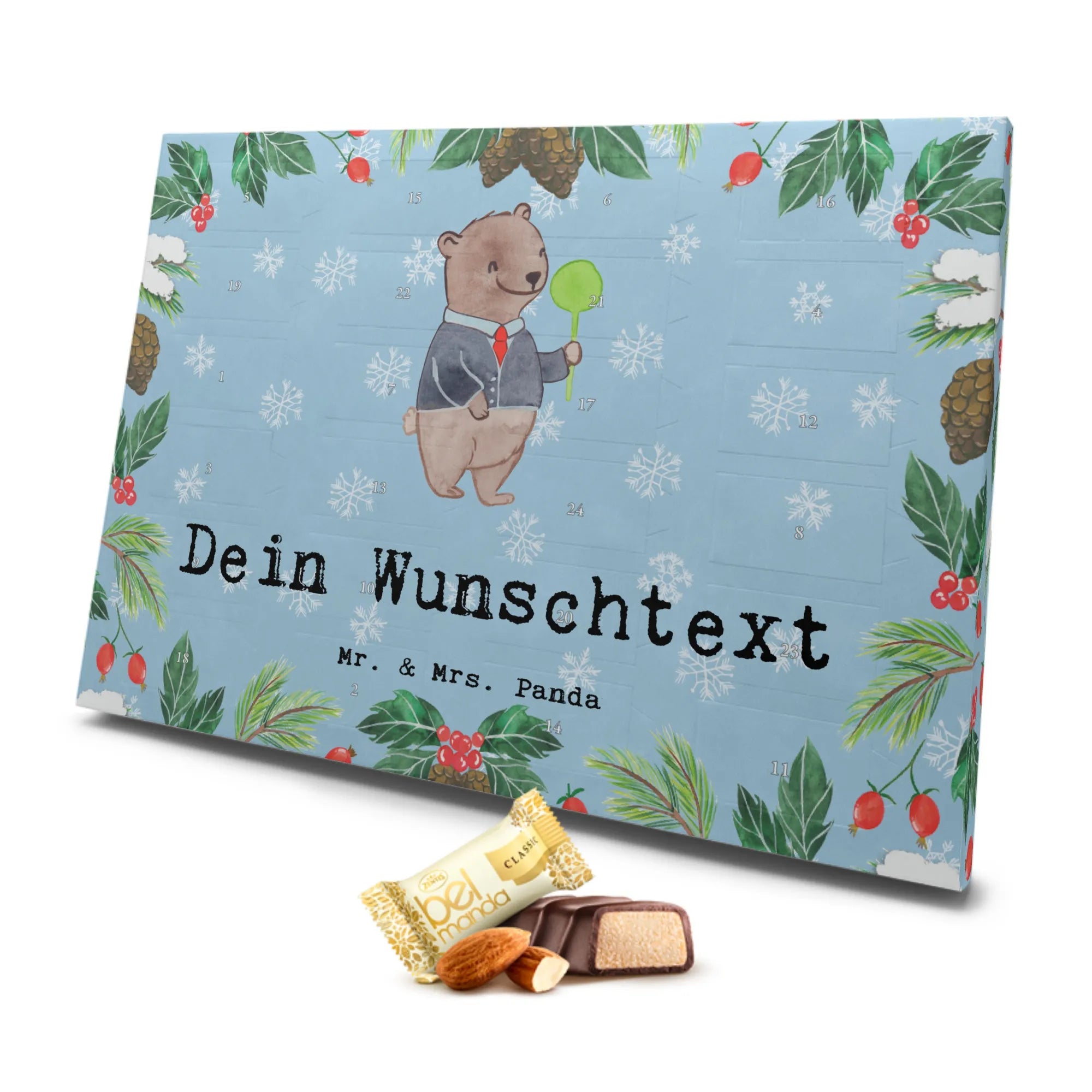 Der personalisierte Marzipan Adventskalender "Zugbegleiter aus Leidenschaft" von Mr. & Mrs. Panda ist das perfekte Geschenk für alle Berufstätigen, die die süßen Seiten des Lebens zu schätzen wissen. Dieser bezaubernde Kalender gehört zur beliebten Kollektion "Berufe" und ist ideal, um einen lieben Kollegen, ein Teammitglied oder einen Verwandten während der Vorweihnachtszeit zu überraschen.