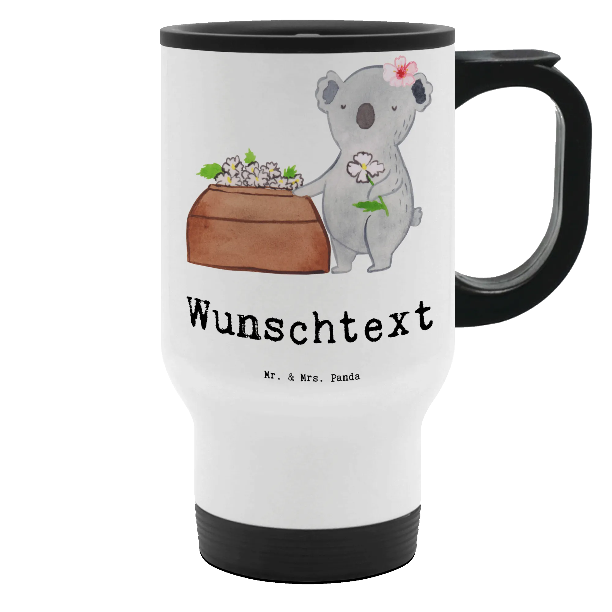 Mit einem charmanten Koala, der ehrfürchtig vor einem mit Blumen geschmückten Sack steht, und dem liebevollen Slogan „Diese Bestatterin begleitet Sie liebevoll mit Herz, Hingabe und Leidenschaft!“, wird dieser Kaffeebecher zu einer treuen Begleiterin im Alltag der Bestatterin!