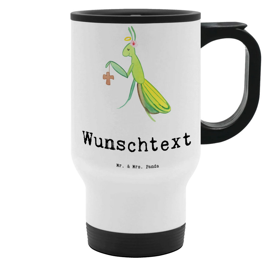 Das liebevoll designte Motiv zeigt eine süße Gottesanbeterin mit einem Heiligenschein, die symbolisch für die Herzlichkeit der Religionslehrer steht. Unter dem Motiv befindet sich der witzige Slogan: "Du bist nur ein halber Mensch, wenn du keine Religionslehrerin bist." Ein perfekter Spruch, um nicht nur den Unterricht aufzulockern, sondern auch für schmunzelnde Gesichter zu sorgen. Jeder, der diesen Becher nutzt, wird ständig daran erinnert, wie wichtig ihre Arbeit ist.