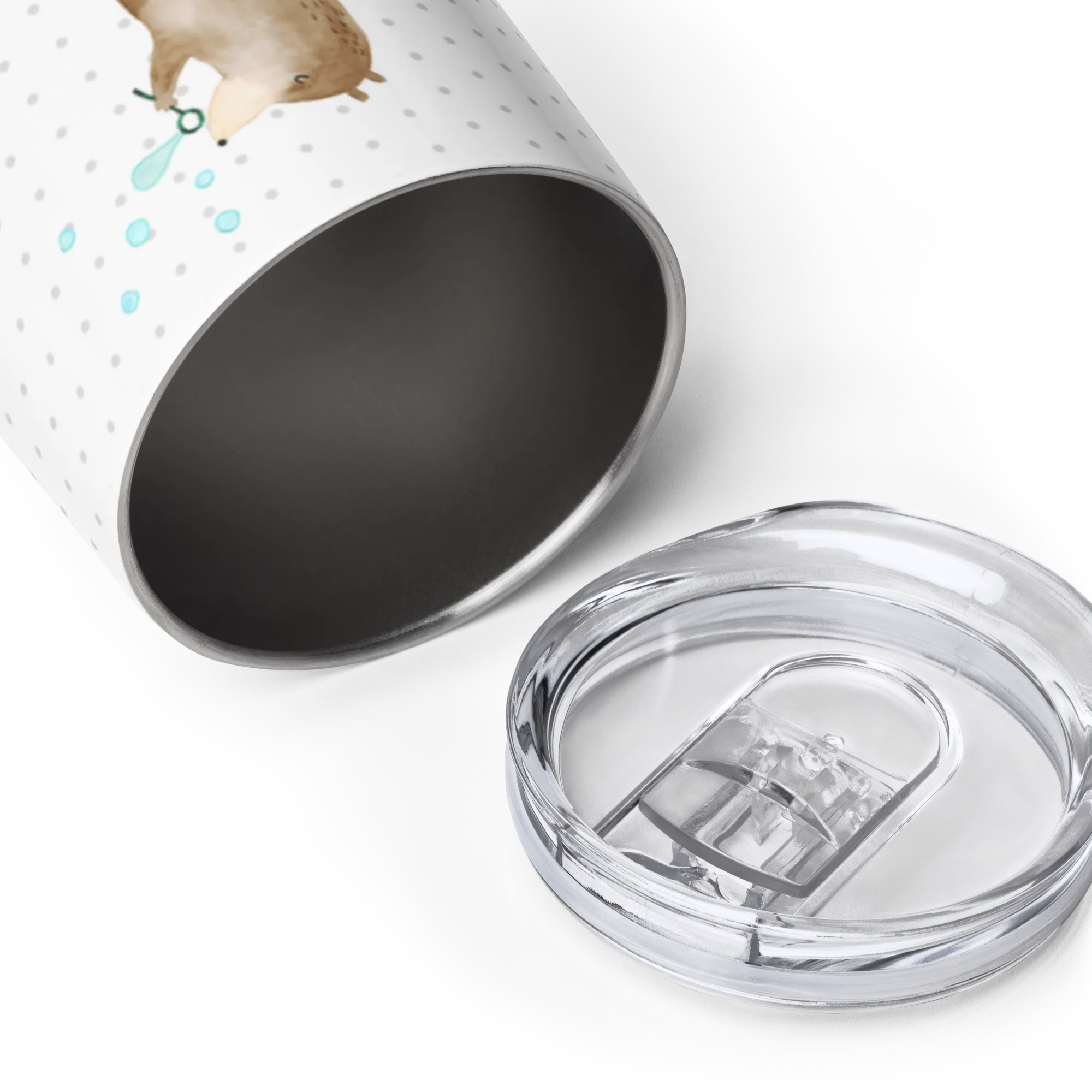 Die verspielte Botschaft „Warum Trübsal blasen, wenn man doch auch Seifenblasen kann?!“ verstärkt die positive Ausstrahlung dieses Bechers und macht ihn zu einem tollen Mitbringsel für Feiern jeder Art. Der niedliche Bär und die fröhlichen Seifenblasen bringen sicherlich Freude und gute Laune!