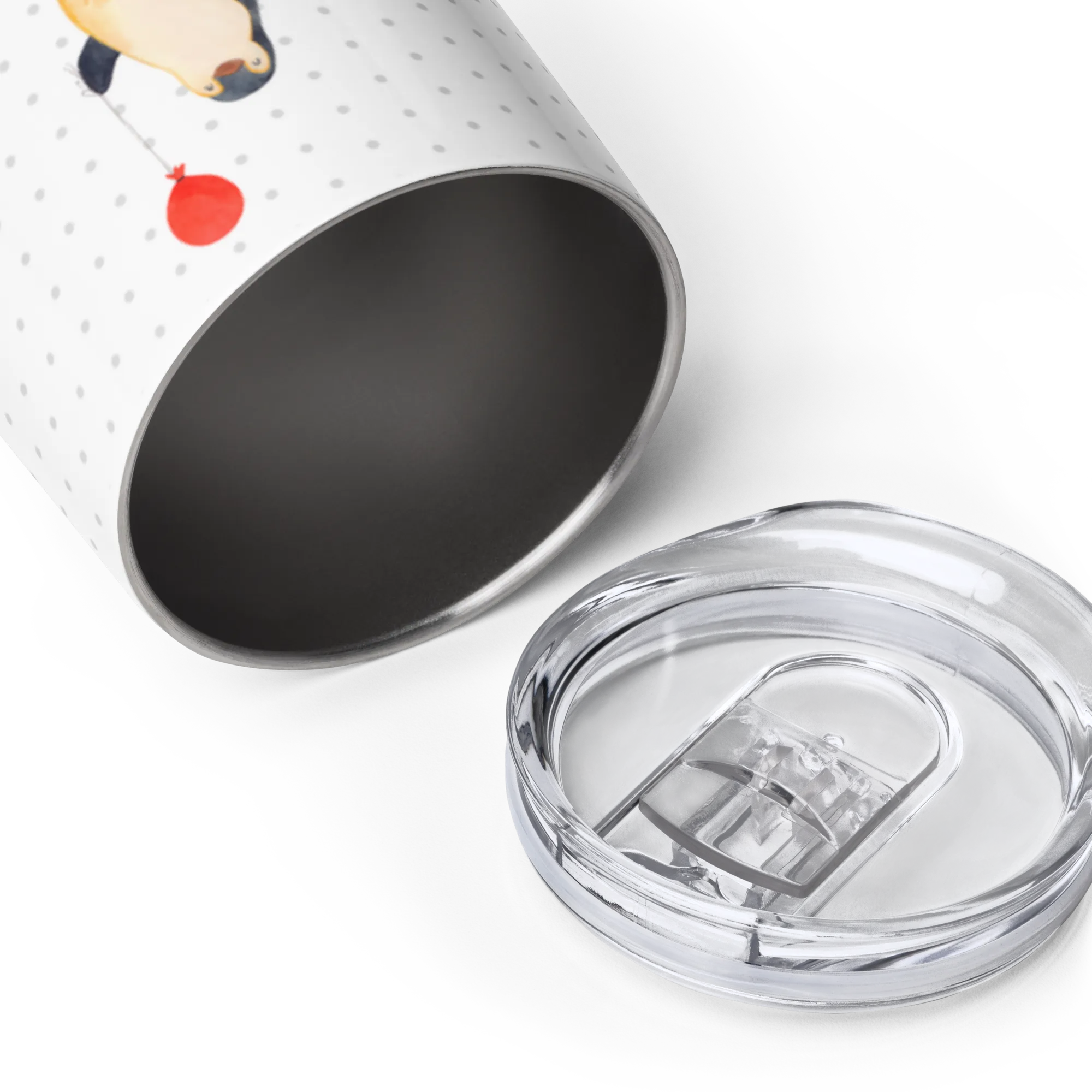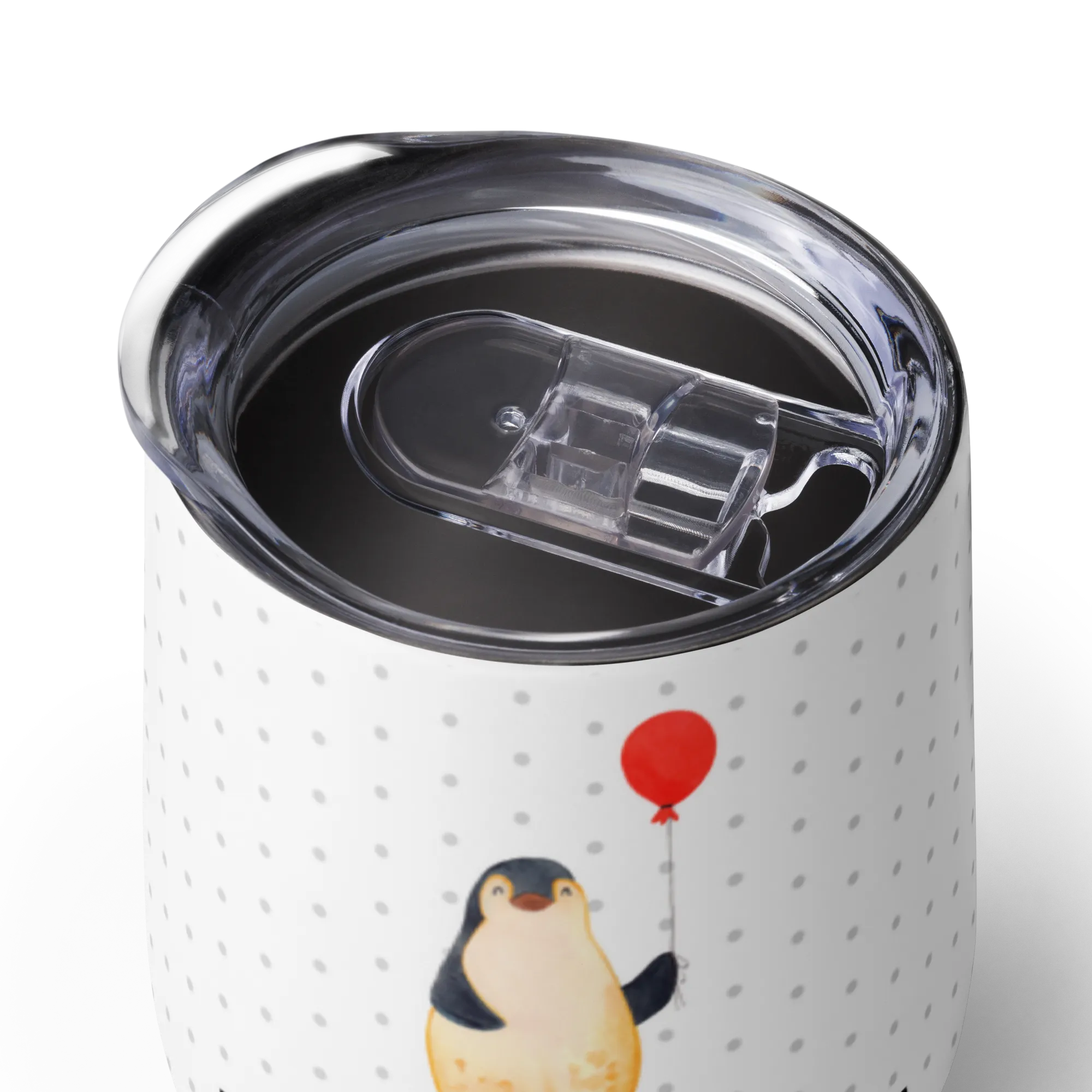 Entdecke den perfekten Begleiter für deine heißen Getränke: unser personalisierter Weinbecher mit dem süßen Pinguin-Motiv und einem Luftballon! Von Mr. & Mrs. Panda designed, bietet dieser wunderschöne, hochwertige Edelstahl-Becher nicht nur ein ansprechendes Design, sondern auch erstklassige Funktionalität.