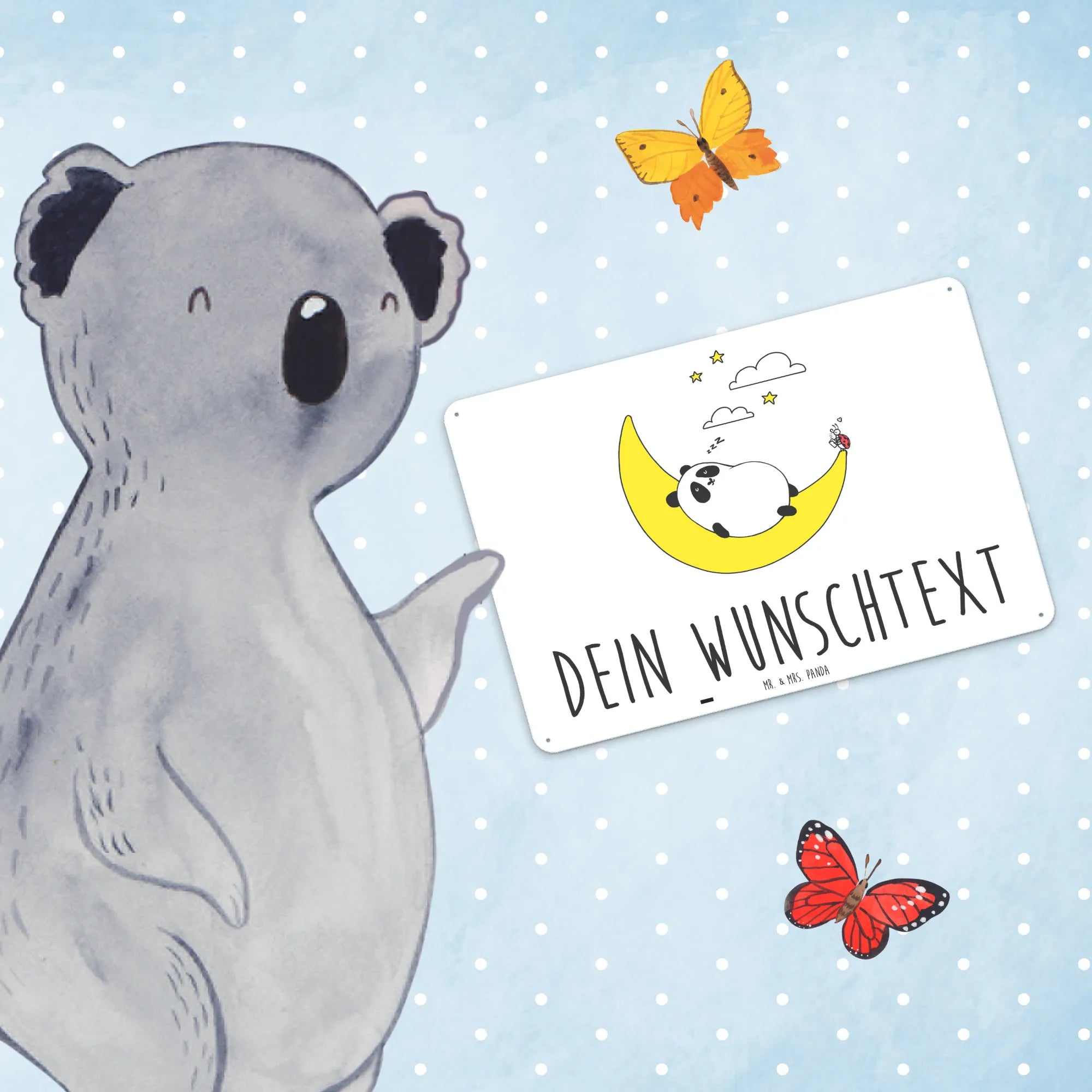 Mit einem charmanten Motiv, das einen niedlichen Panda zeigt, der entspannt auf einer Mondsichel schläft, bringt dieses Schild Freude und Gelassenheit in jedes Zuhause. Die Kombination aus einem begeistert lauschenden Marienkäfer und dem Panda vermittelt ein Gefühl von Ruhe und Frieden.