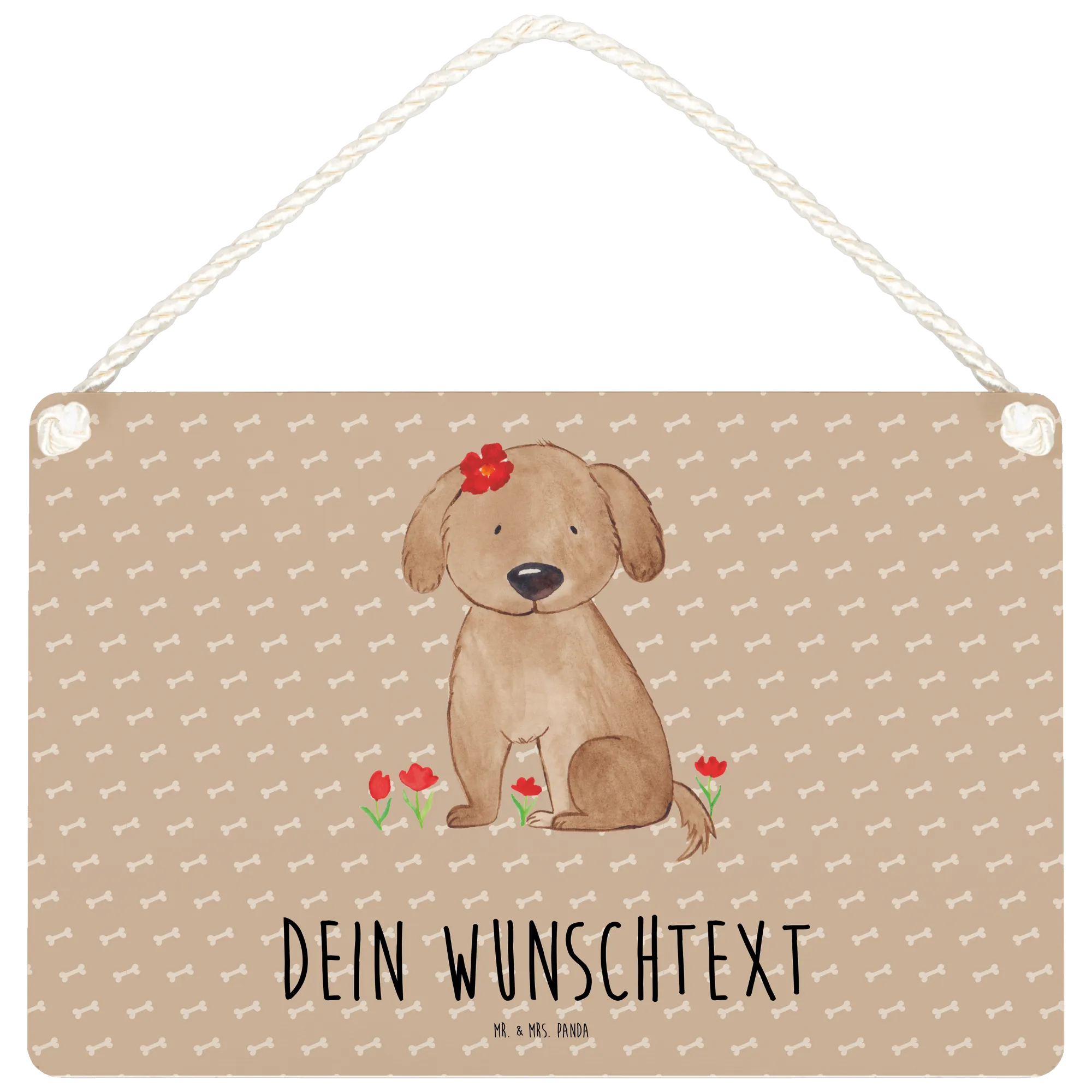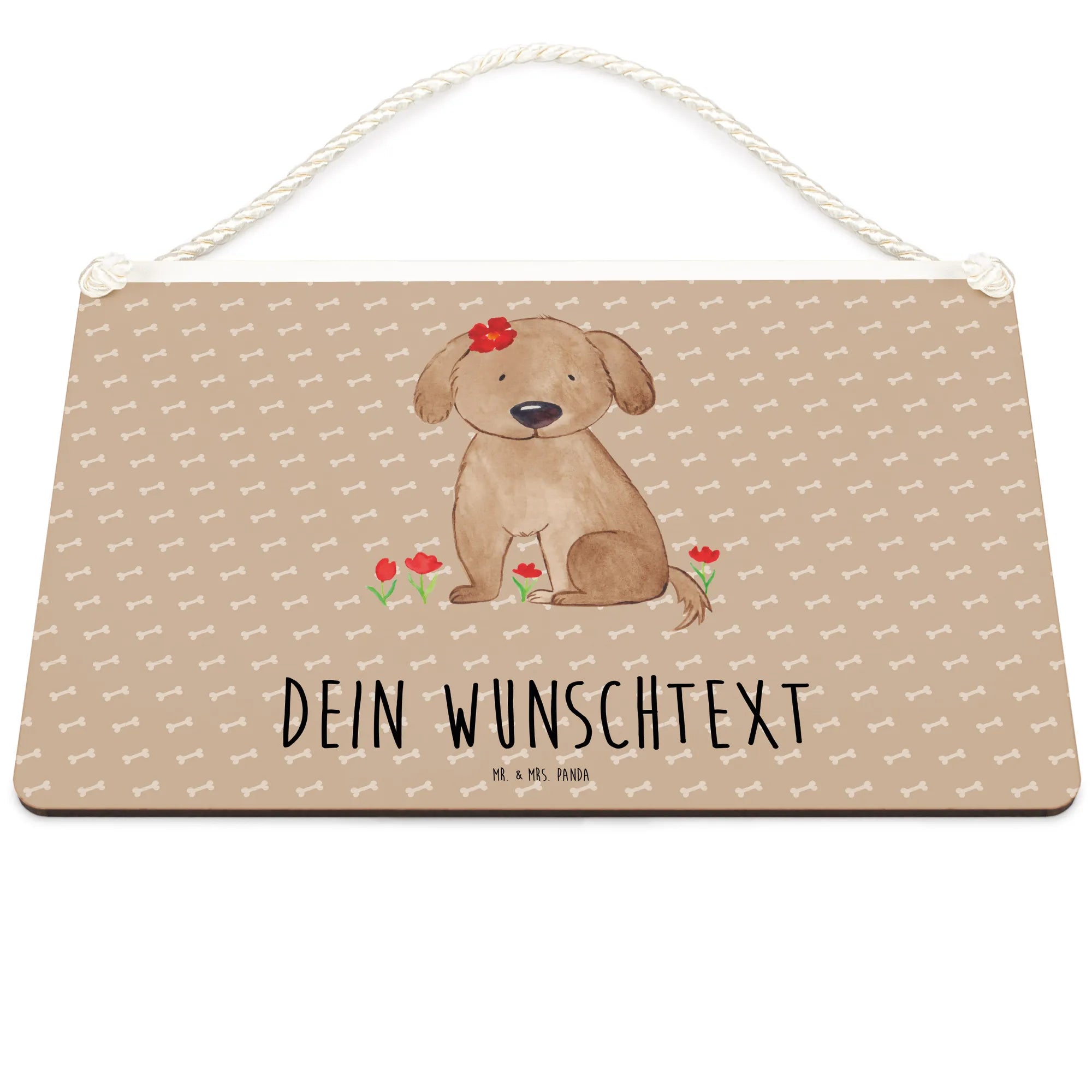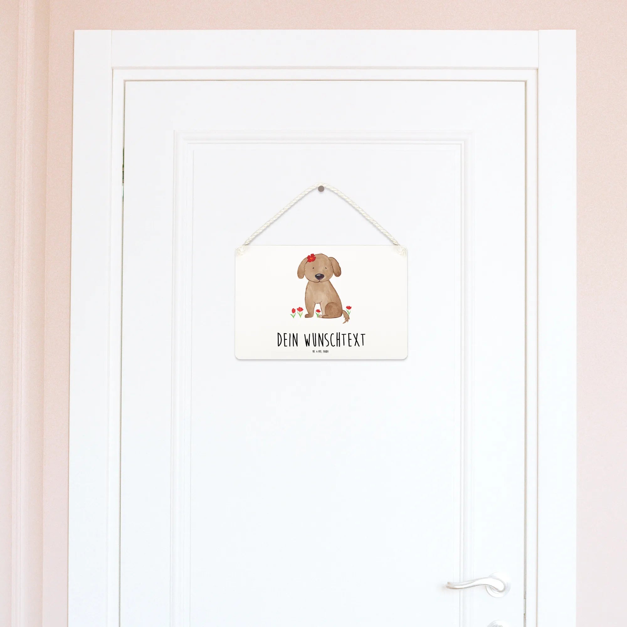 Das personalisierte Deko Schild "Hund Hundedame" von Mr. & Mrs. Panda ist das perfekte Geschenk für alle Hundeliebhaber und Hundebesitzer. Mit seinem niedlichen Design, das eine charmante Hundedame mit einer Blume auf dem Kopf zeigt, bringt es Freude und Gemütlichkeit in jeden Raum.