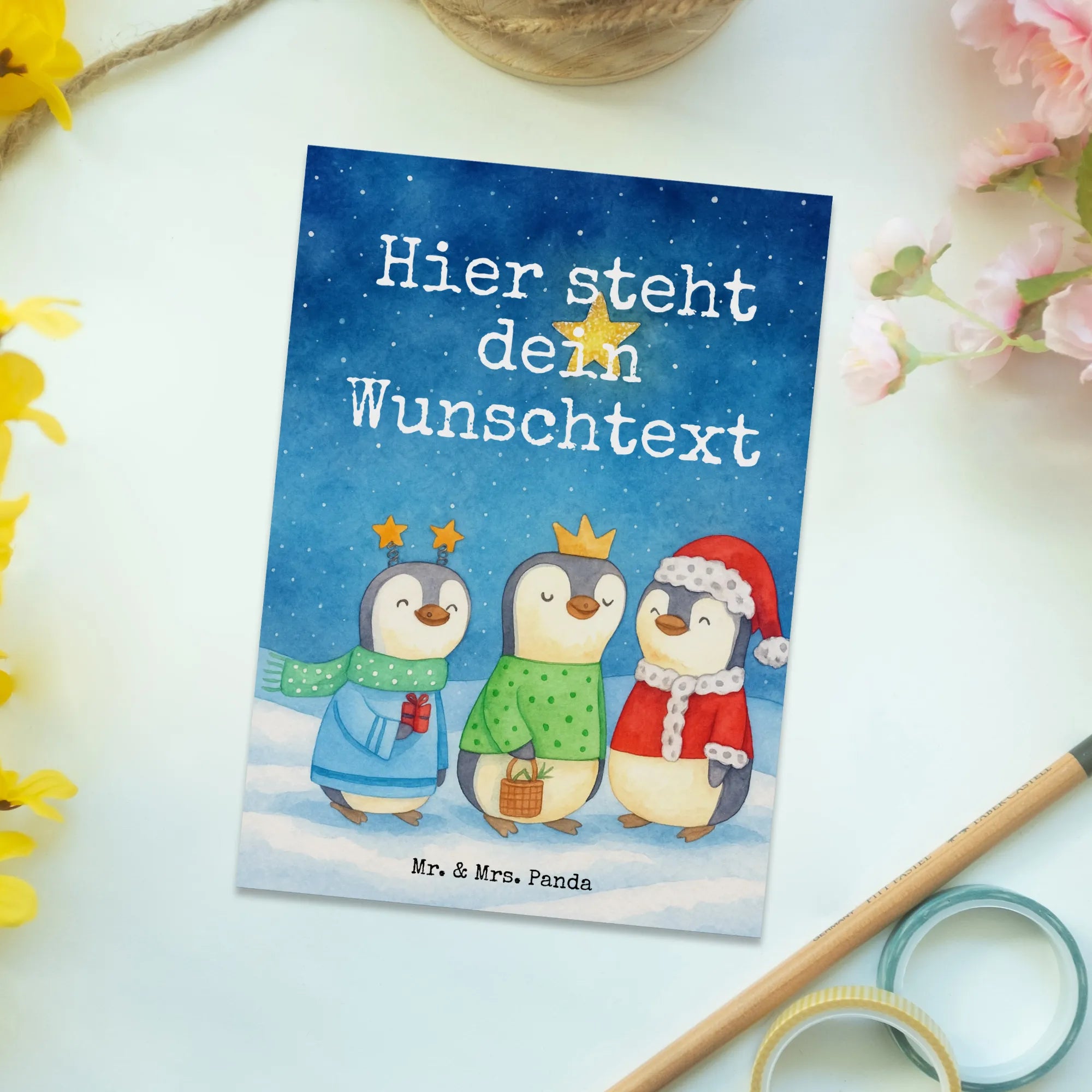 Juhu – die schönste Zeit beginnt! Unsere personalisierte Postkarte Winterzeit Heilige drei Könige aus der Winter Kollektion von Mr. & Mrs. Panda ist das perfekte, kleine Weihnachtsgeschenk für alle, die persönliche Grüße mit einem Lächeln verschicken möchten. Auf der Vorderseite findest Du drei zauberhafte Pinguine, die als die Heiligen drei Könige verkleidet sind – liebevoll in Aquarell handgezeichnet von Mrs. Panda. 🎨
